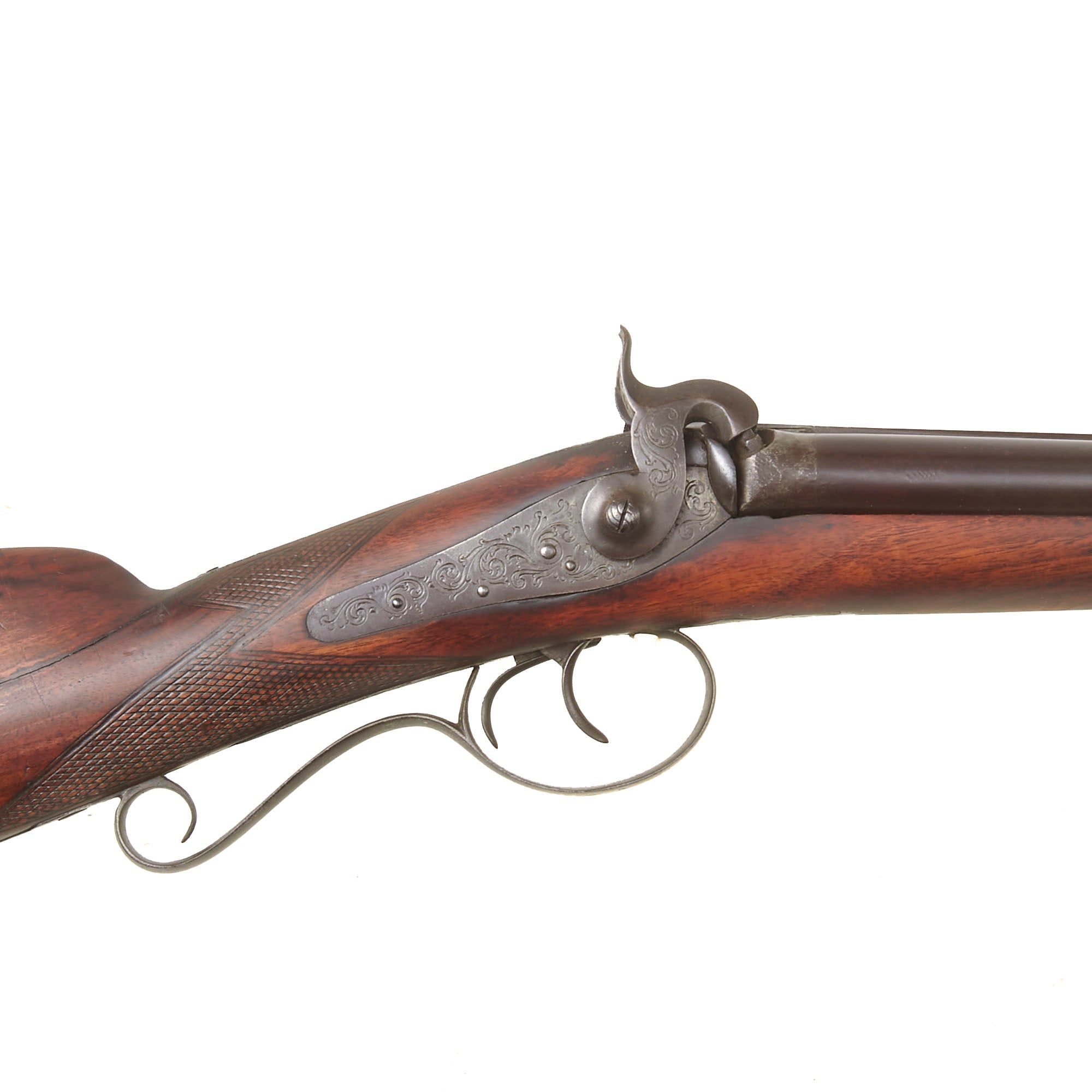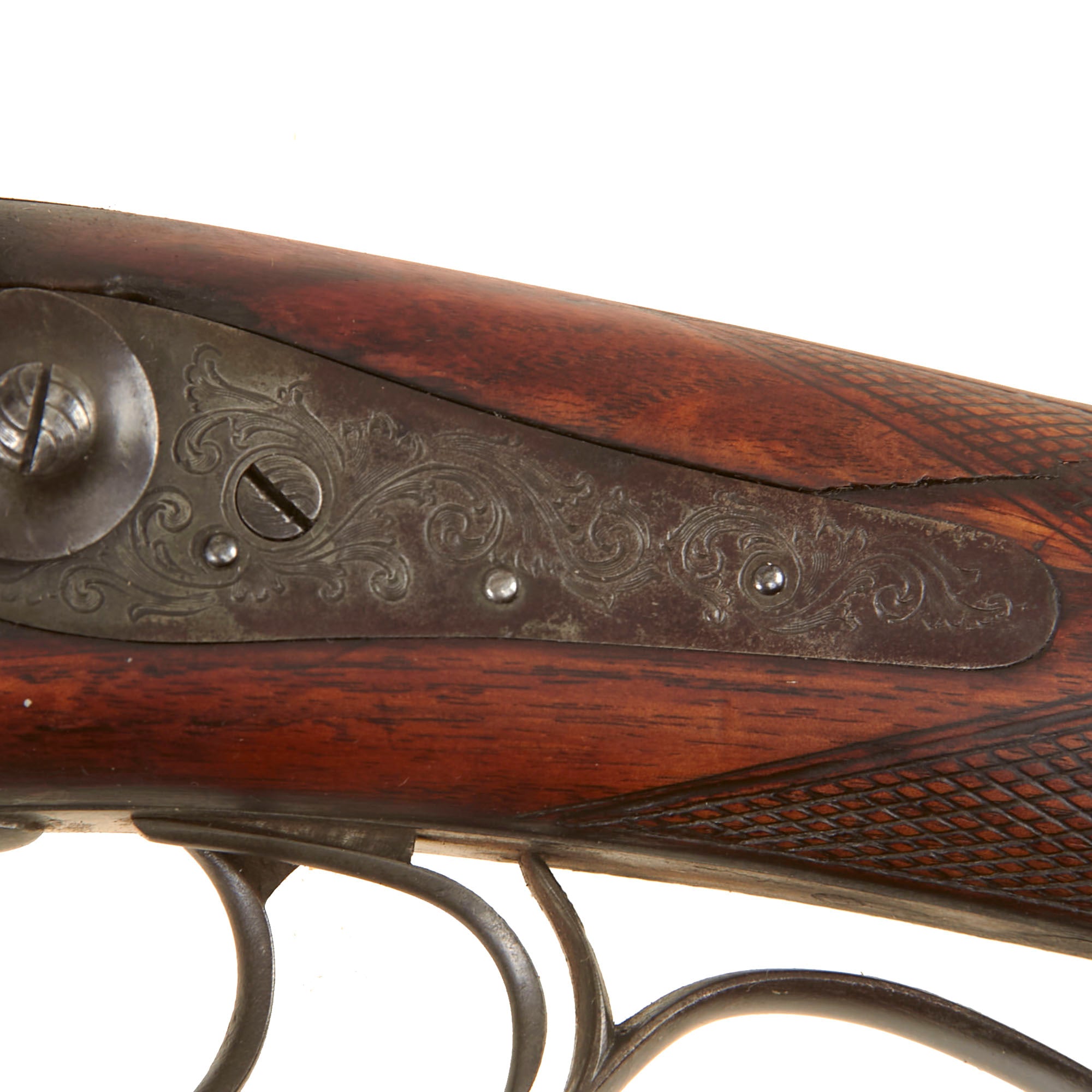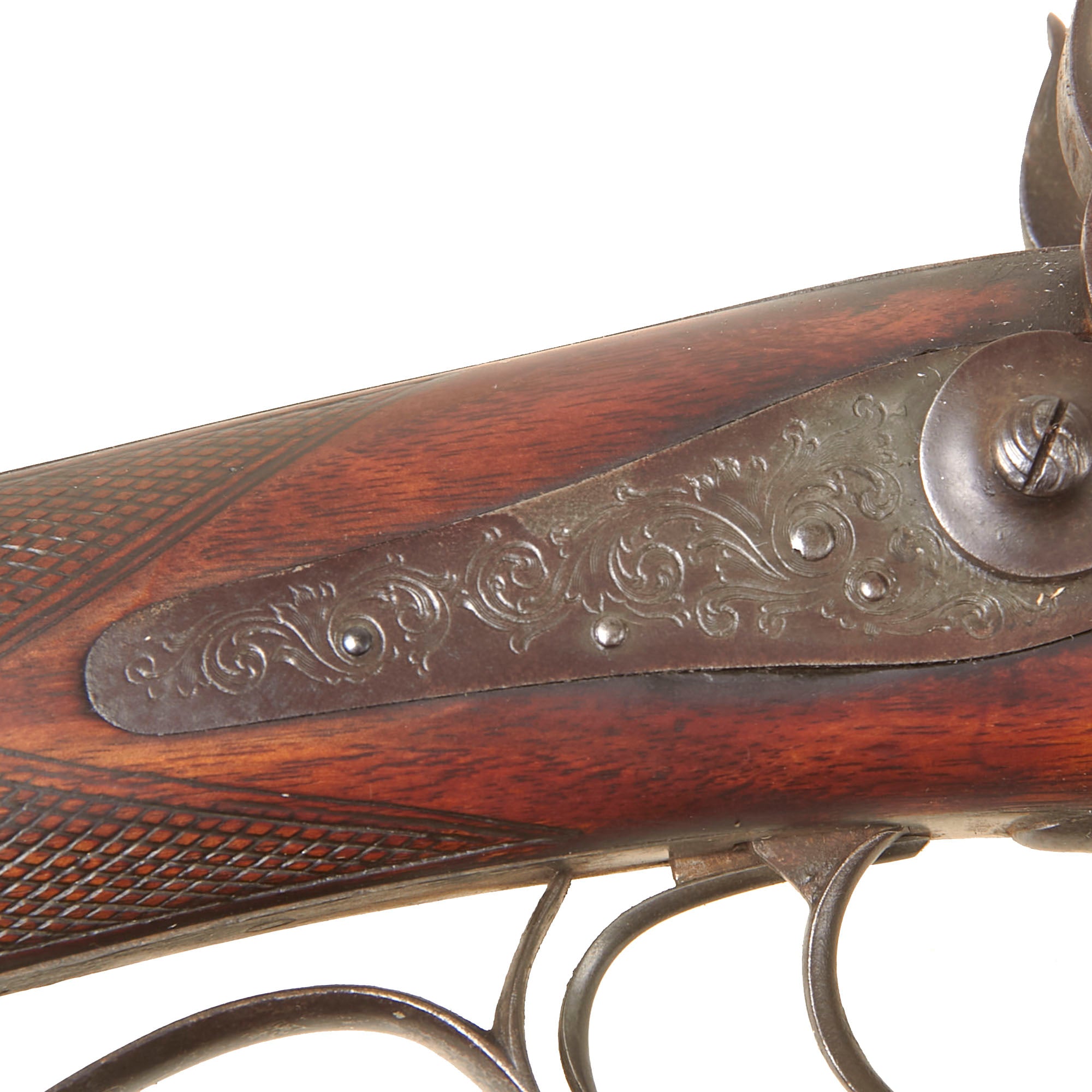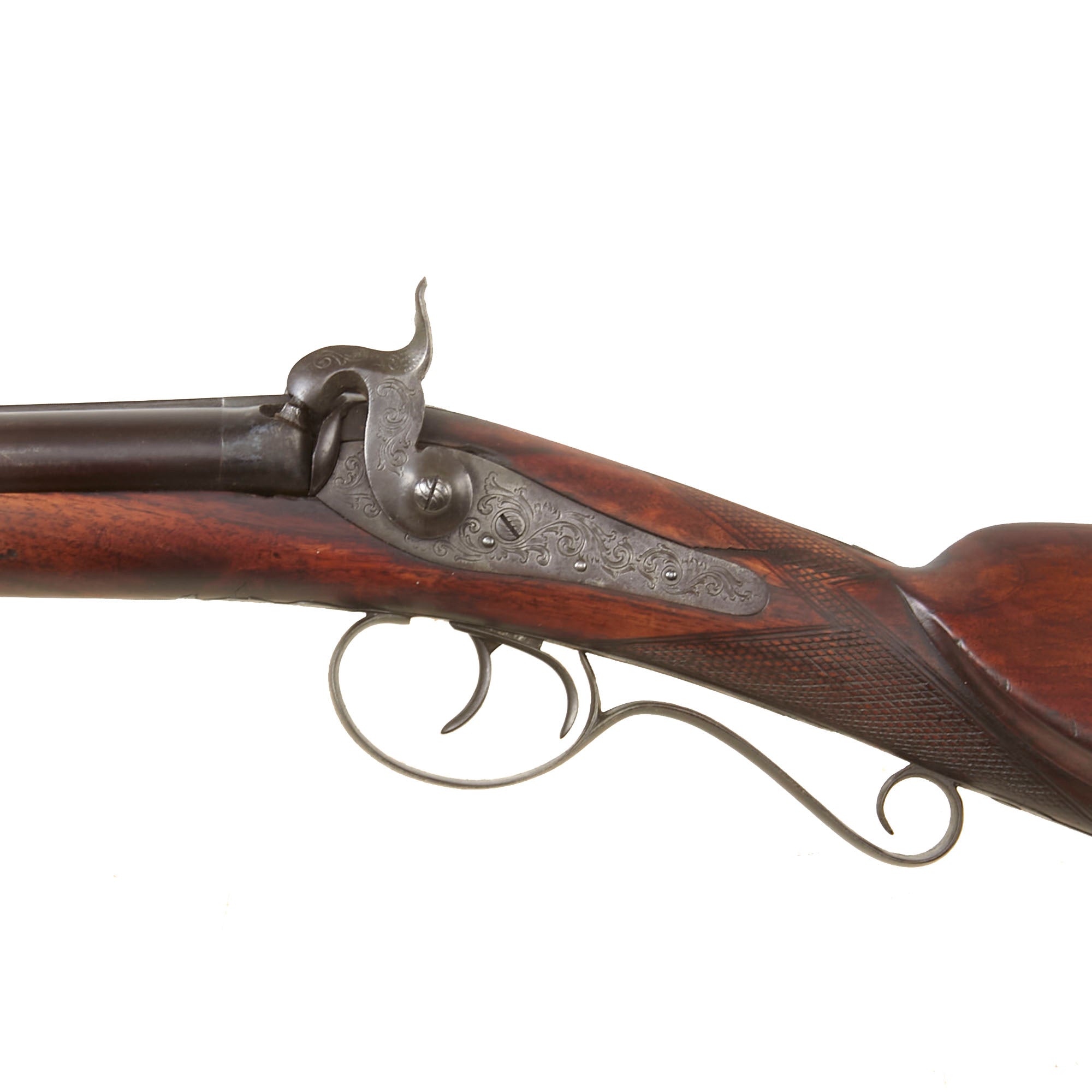 We were not able to locate any other markings on the gun or under the barrel, so we assume the barrel is German, an area which did not have any unified gun proofing system as seen in England and Belgium. It is however of exceptionally high quality, and must have taken quite a bit of hand work to achieve. While the barrels are plain, the barrel breech and tang fittings are highly engraved with "bank note" style floral designs, as are both of the lock plates. There is additional engraving on areas of the "pistol grip" style trigger guard.