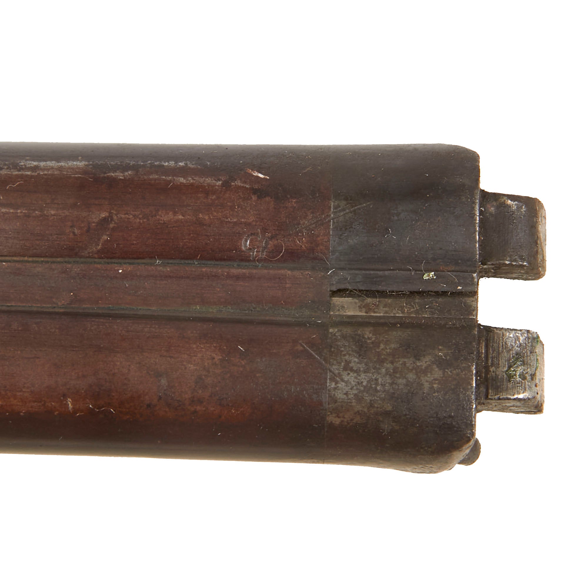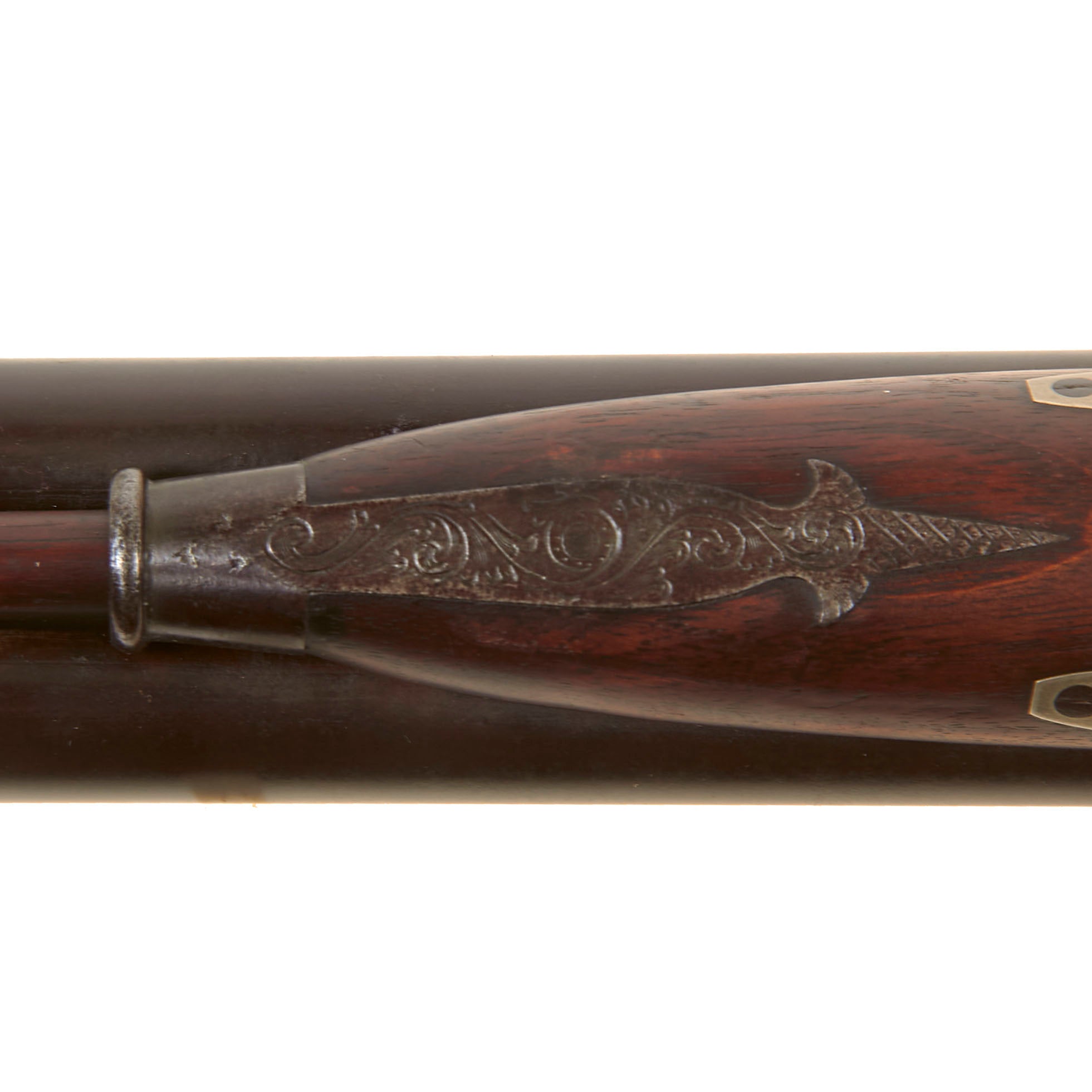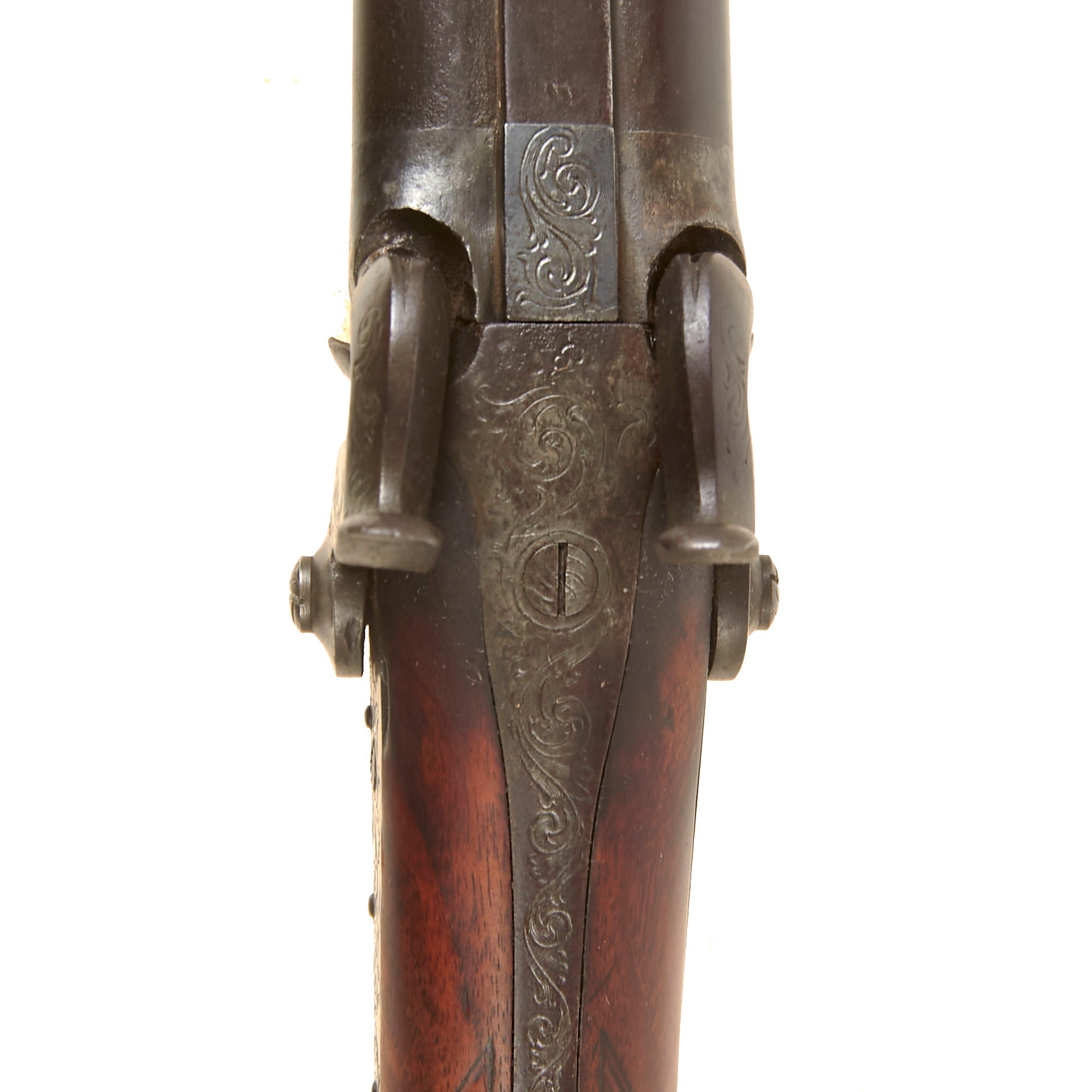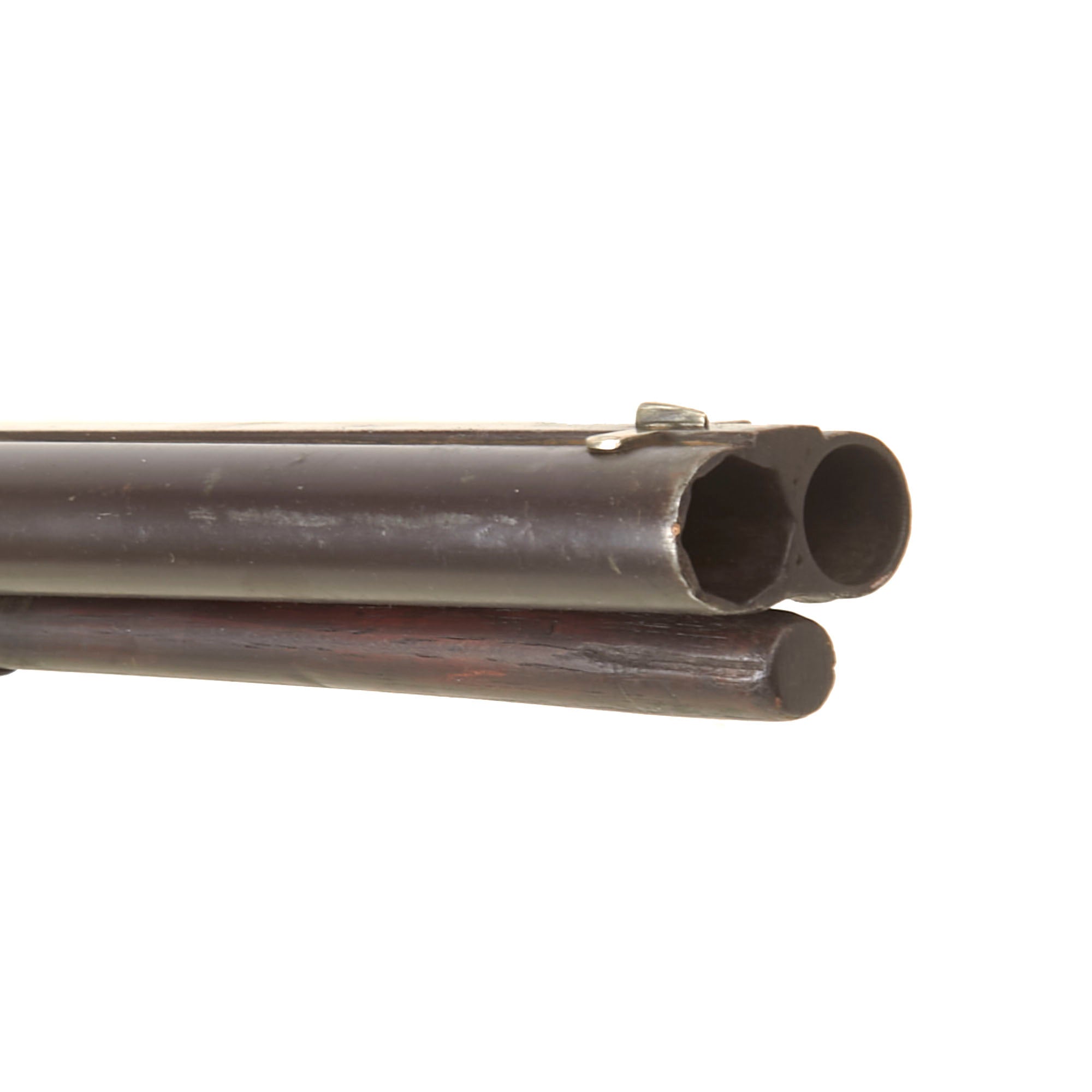 Overall condition of the metalwork is very nice, with a lovely plum patina on the barrels, and a mottled gray patina on the other components. There are no major oxidation or rust issues, just a lovely patina of age. The locks are both fully functional, holding at half cock and firing at full. It is fitted with a wooden ramrod under the barrel, which does not have any fittings on either end. We checked the bores, and the smoothbore barrel shows use, with some powder fouling and oxidation on the interior. The rifled barrel still shows strong rifling, with some fouling in the grooves, but overall is in very good shape, with the lands still bright.