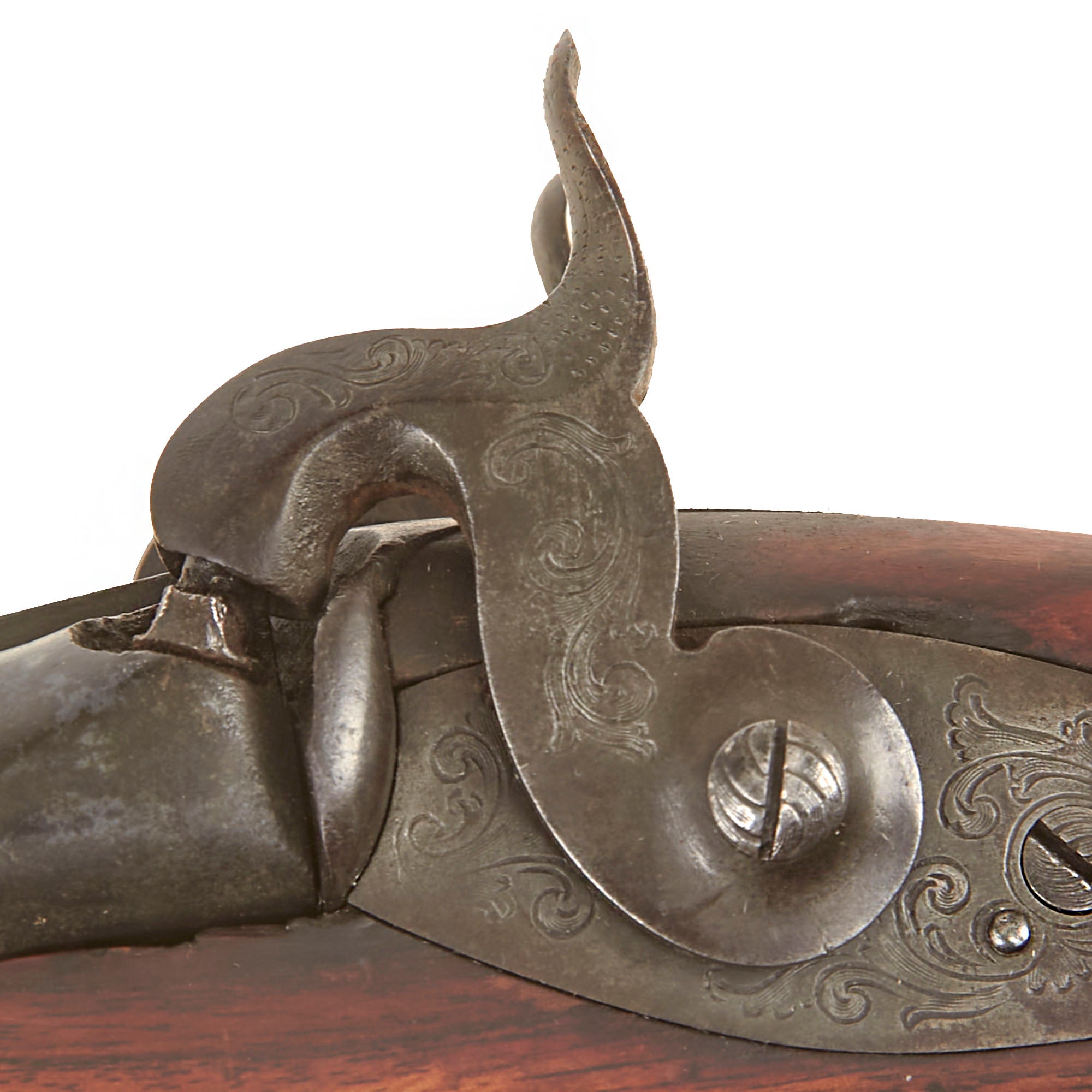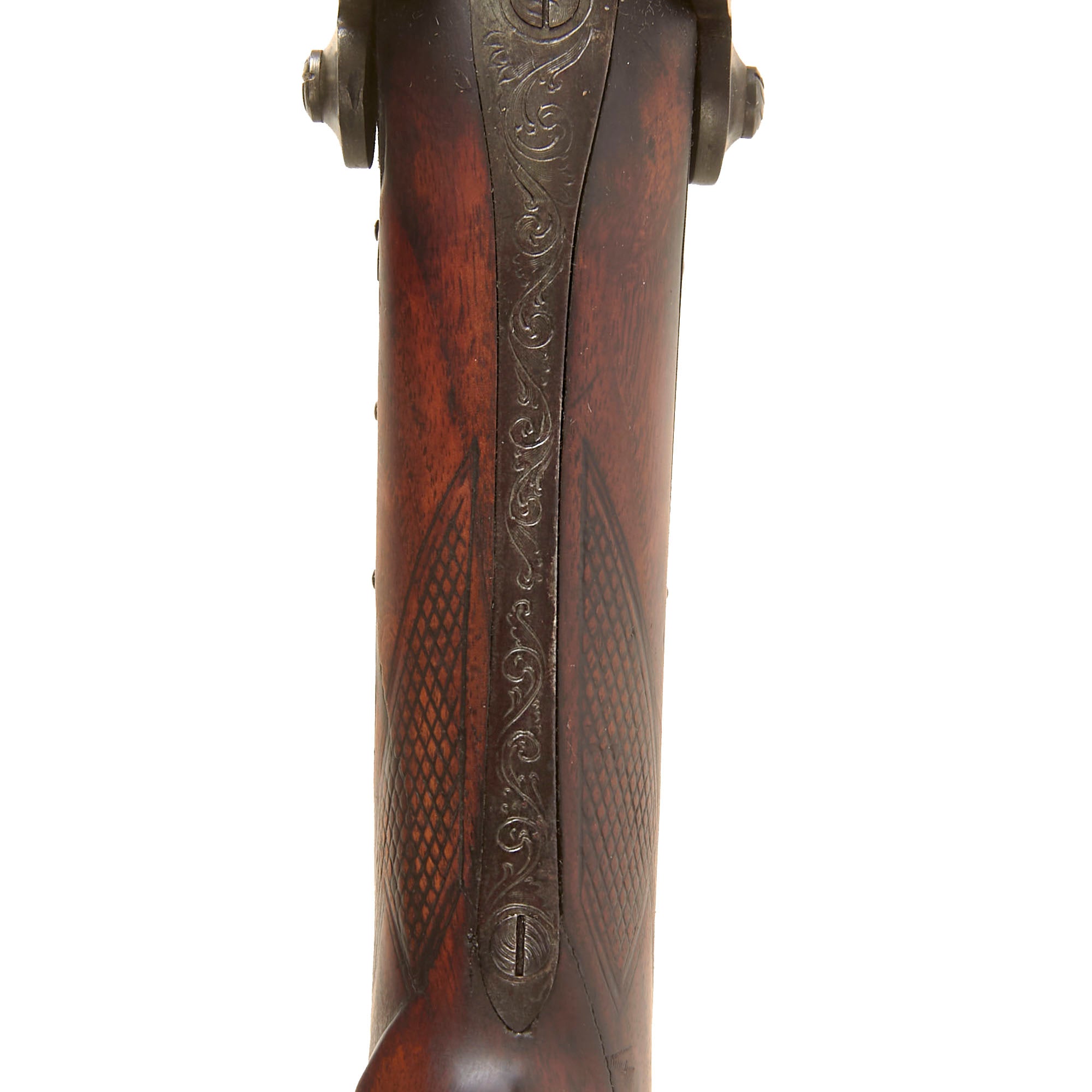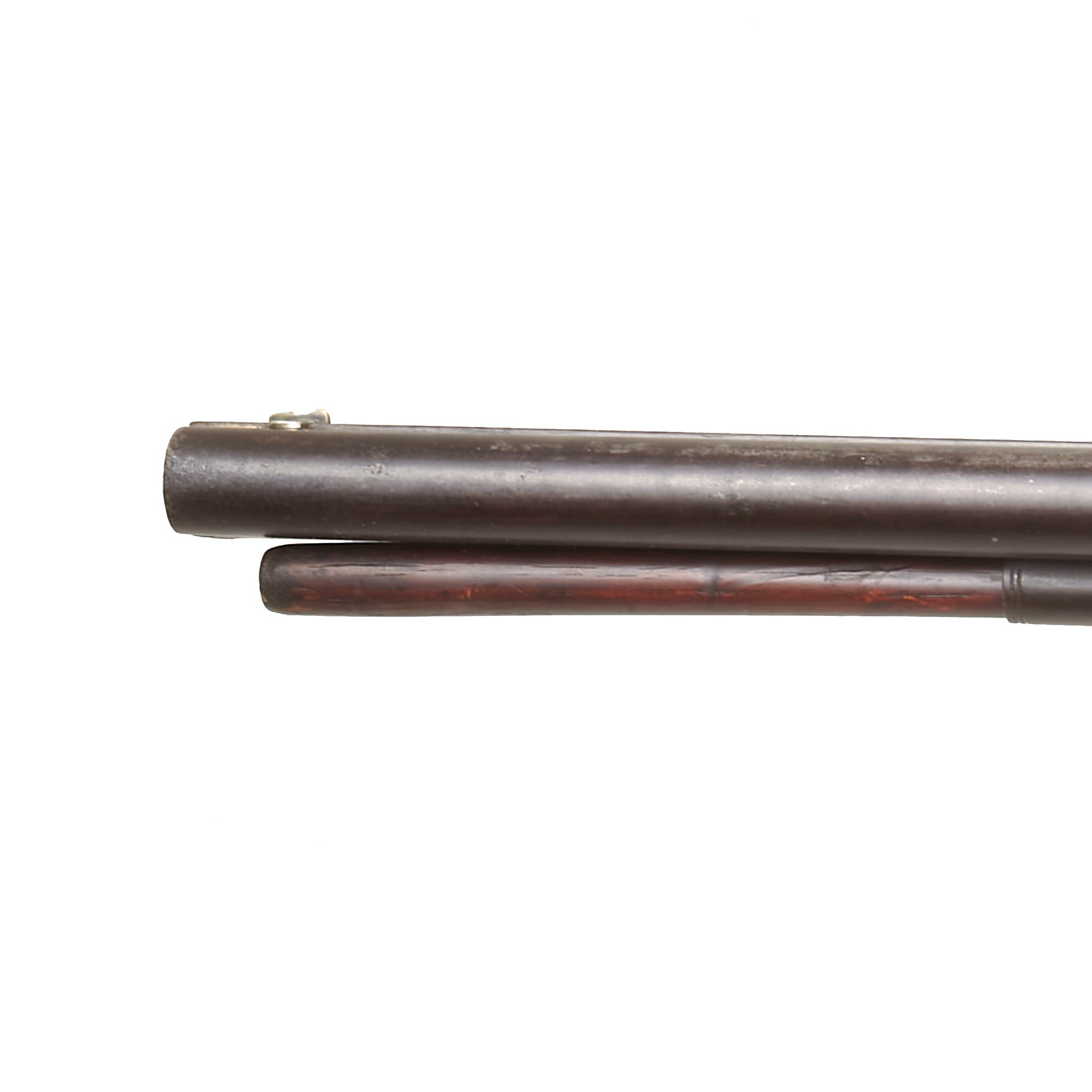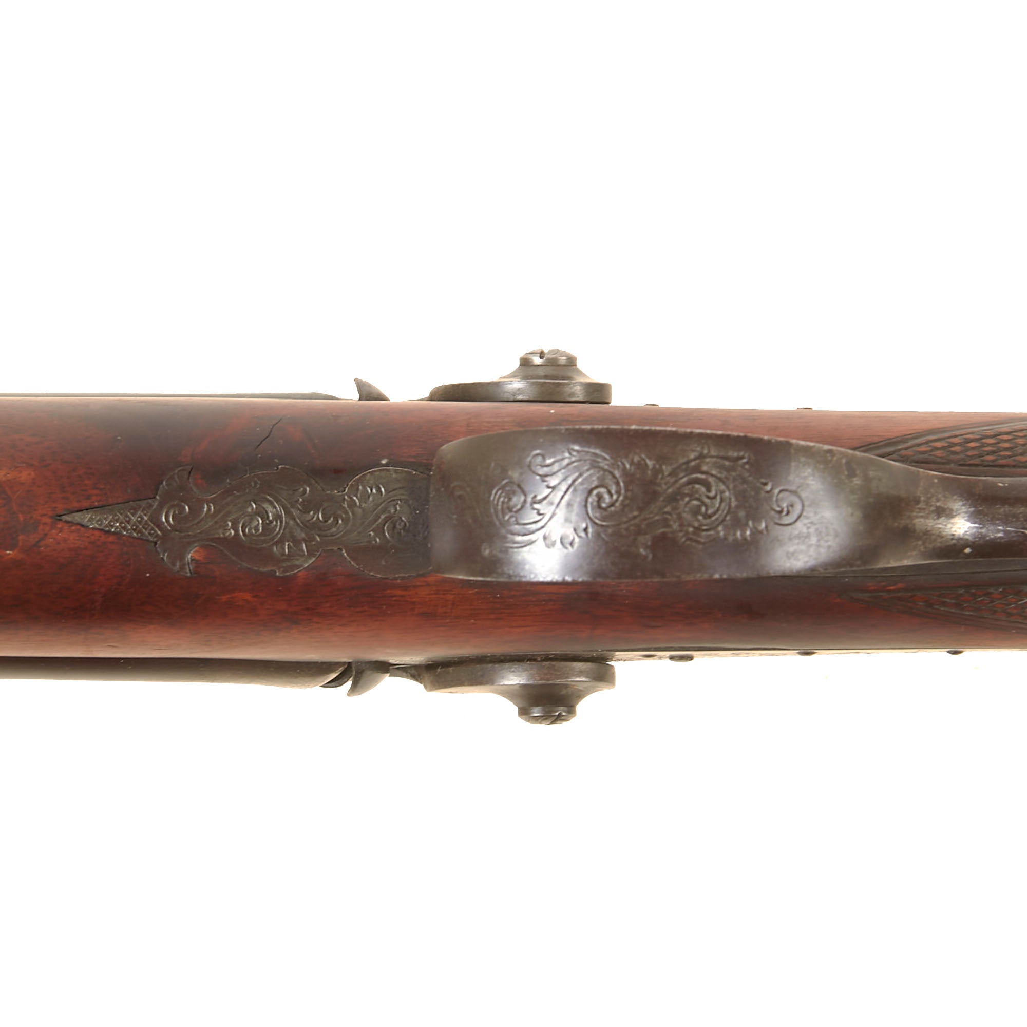 Overall condition of the metalwork is very nice, with a lovely plum patina on the barrels, and a mottled gray patina on the other components. There are no major oxidation or rust issues, just a lovely patina of age. The locks are both fully functional, holding at half cock and firing at full. It is fitted with a wooden ramrod under the barrel, which does not have any fittings on either end. We checked the bores, and the smoothbore barrel shows use, with some powder fouling and oxidation on the interior. The rifled barrel still shows strong rifling, with some fouling in the grooves, but overall is in very good shape, with the lands still bright.