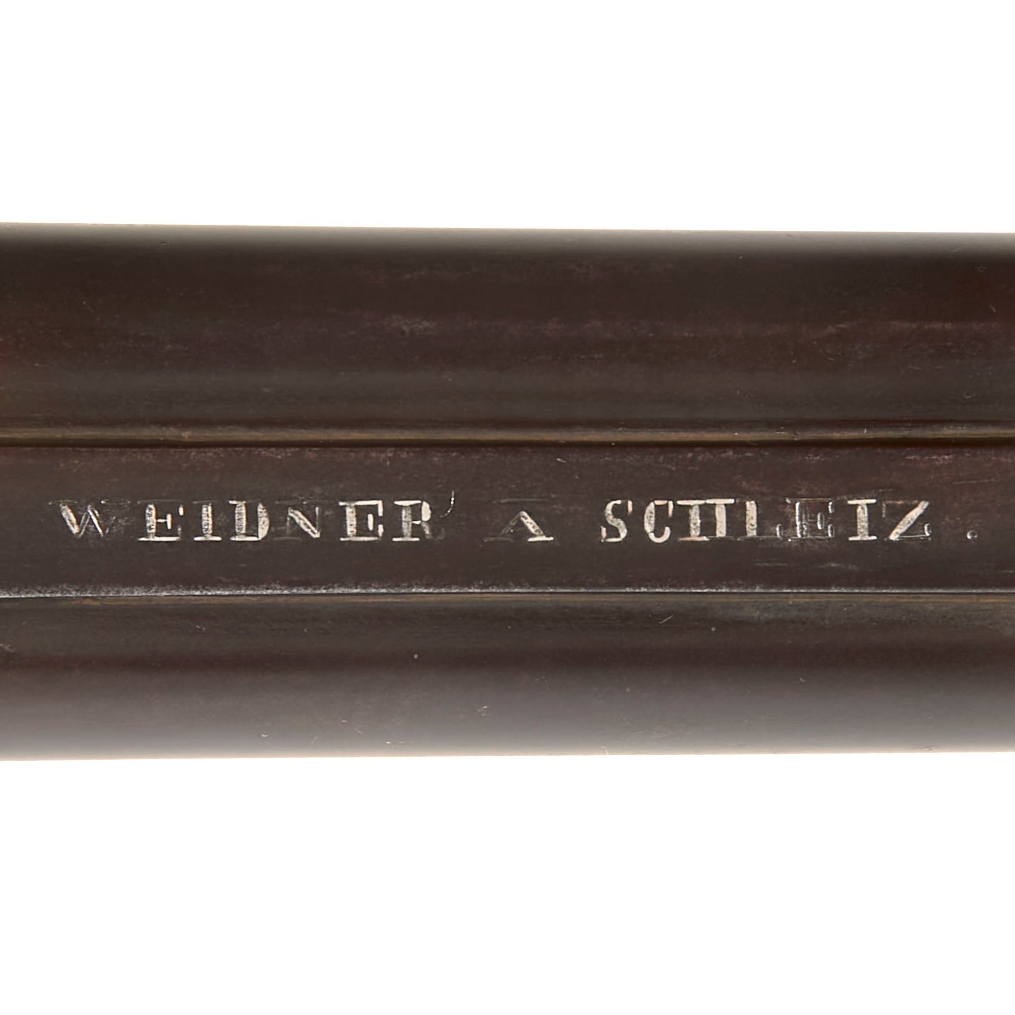 This German made example fits the pattern very well, with a 24 gauge shotgun barrel on the left, and a 0.58" rifled barrel on the right, which are just about the same size. There are no maker markings on the lock plates, however the barrel strap is marked with WEIDNER A SCHLEIZ., which was originally fully silver inlaid, but now is missing some of that. Schleiz is a town in the Vogtland region of Thuringia, which is in the far eastern side of modern Germany. We have not been able to find out much about the maker, though we definitely did fine some other guns that they produced. Most likely the entire gun is definitely bespoke, built to order by a local gunmaker, who looks to have been highly skilled.