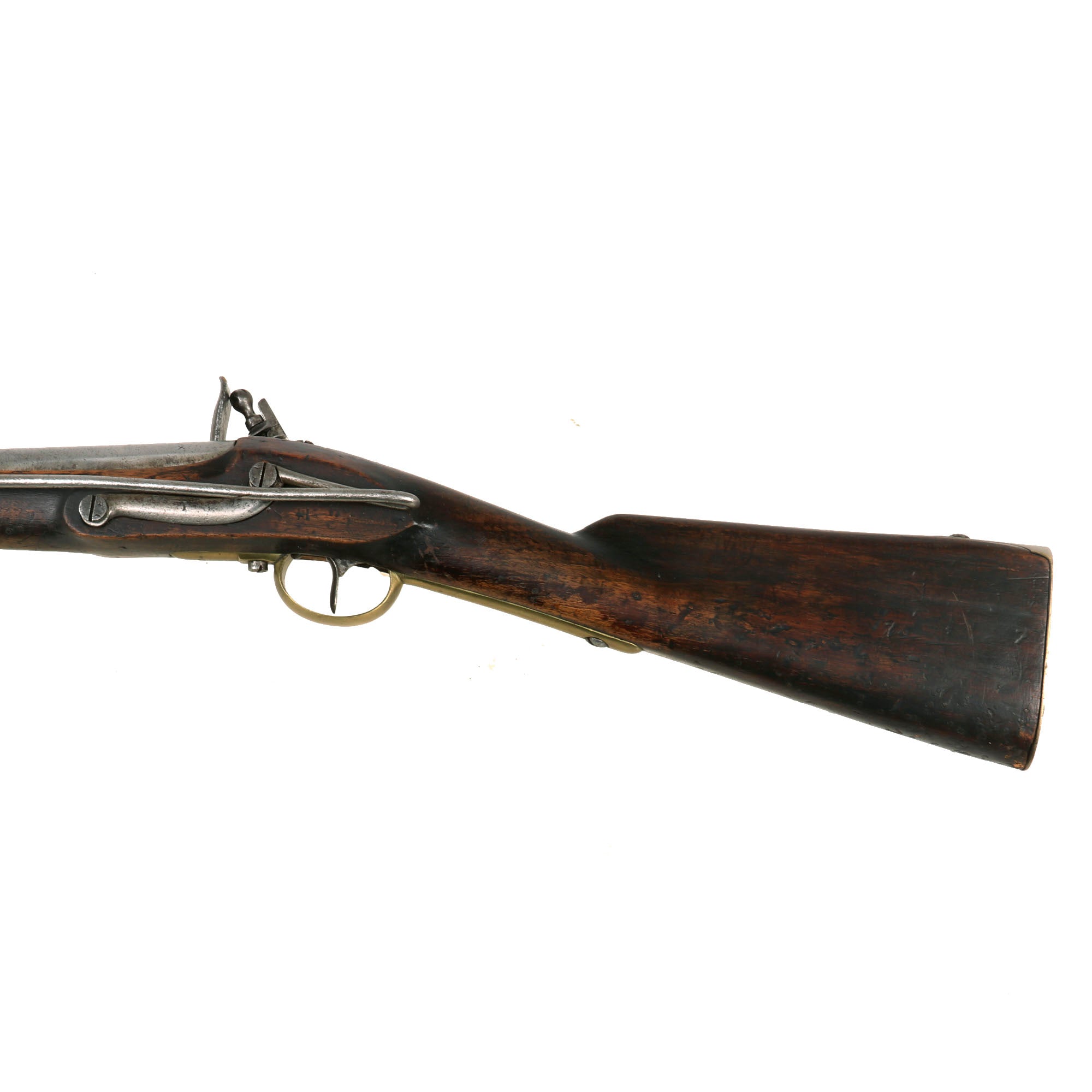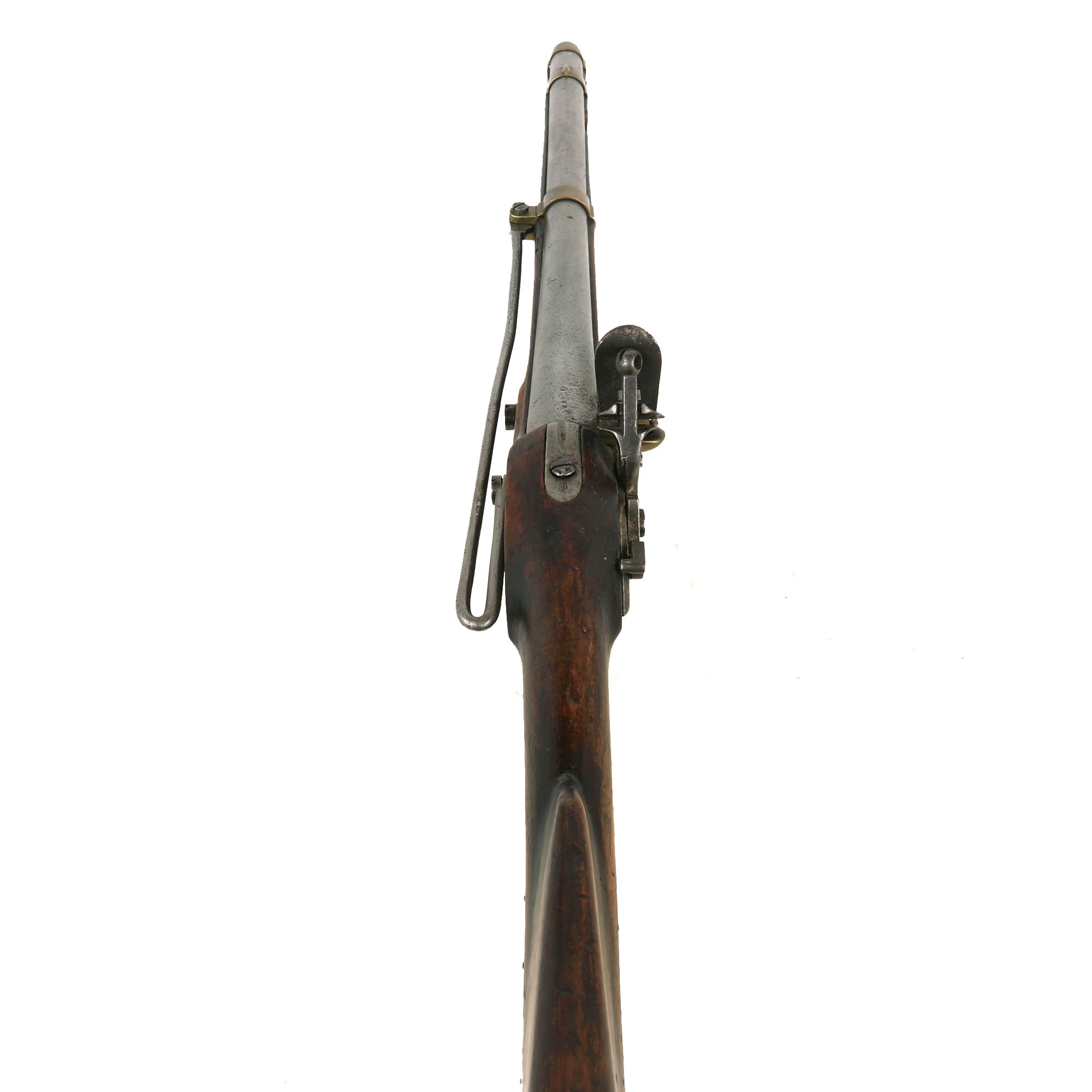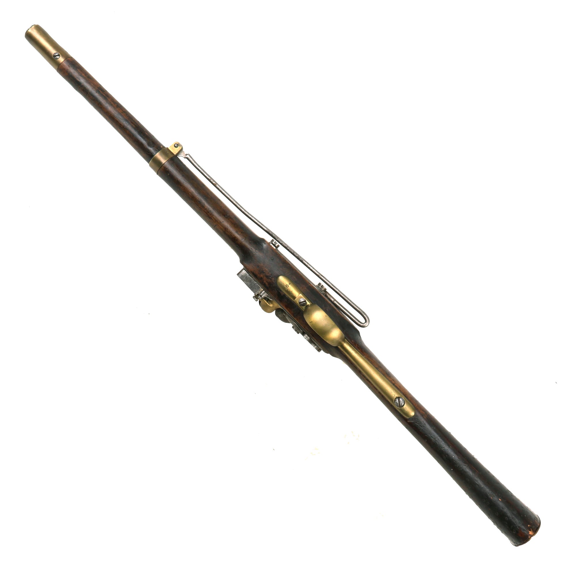The metalwork overall has a polished steel matte patina from centuries of oxidation and subsequent cleaning. The brass fittings have been cleaned as well, but don't show nearly as much wear, and now display a mellow patina. The stock is in lovely condition,, showing no major damage, and it has a very nice worn look. Interestingly, on the bottom of the fore stock and even more so on the bottom of the butt stock there are numerous small copper tabs or nails in the stock, almost like there used to be copper tacks attached to decorate the carbine long ago. We do not understand how these were attached, or what function they serve, but they definitely add to the piece.