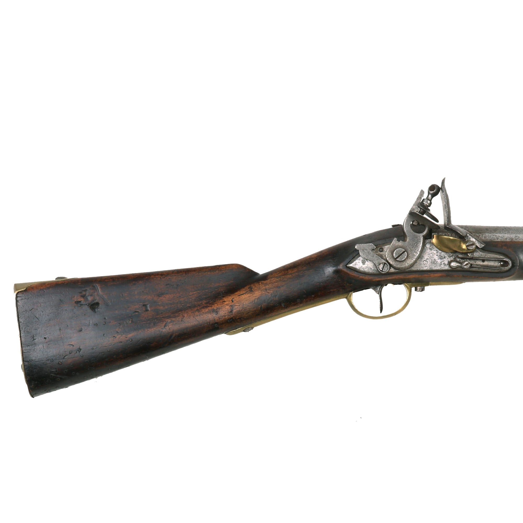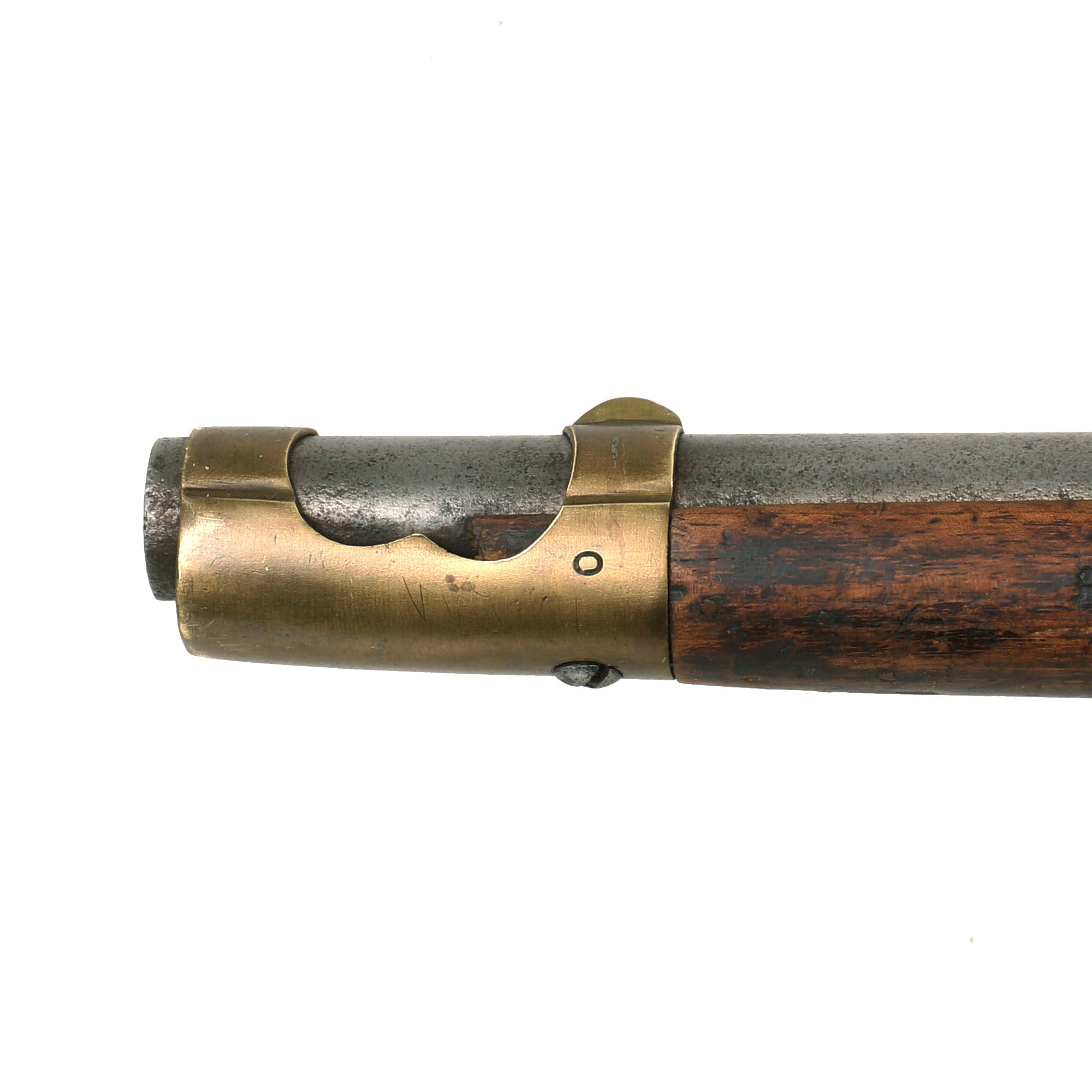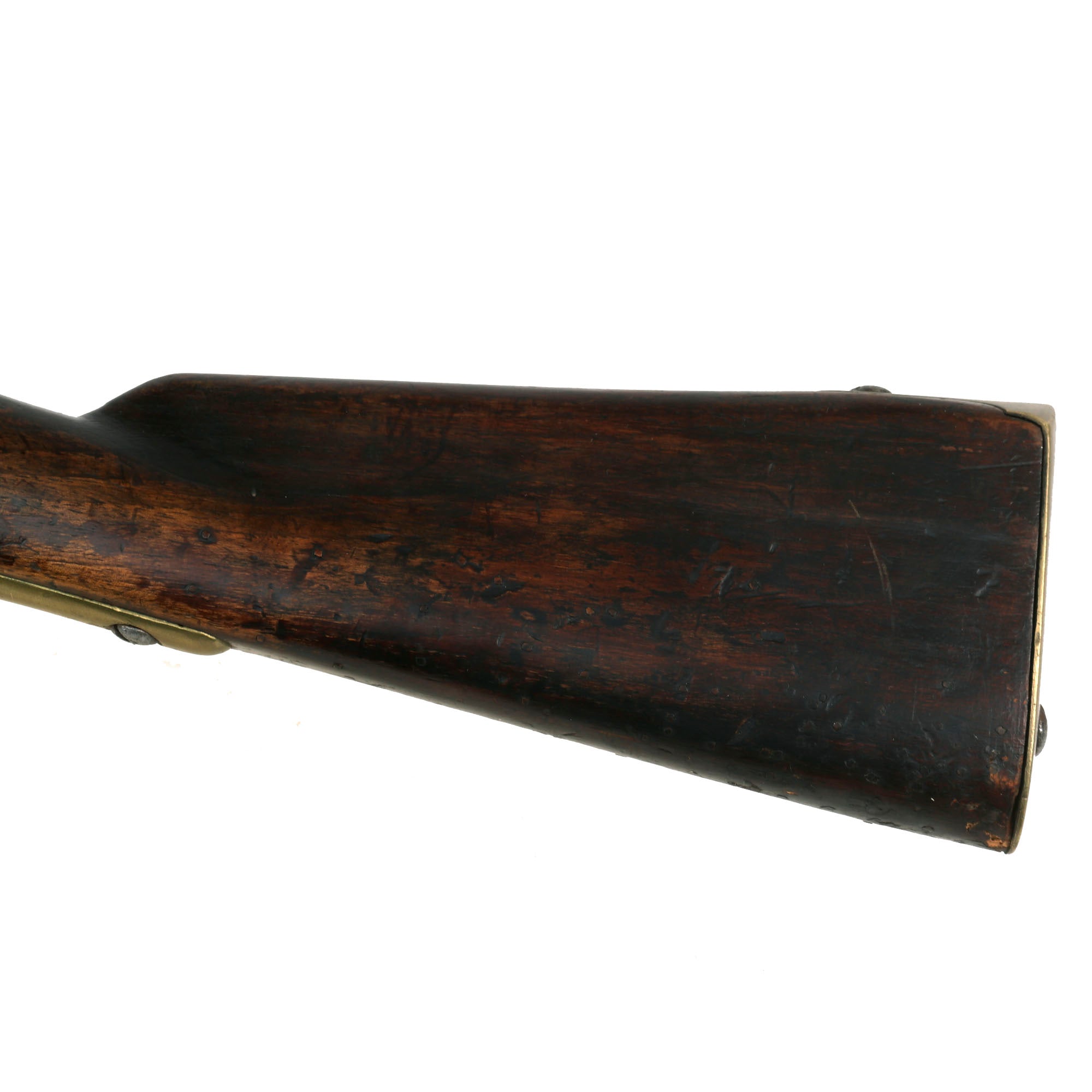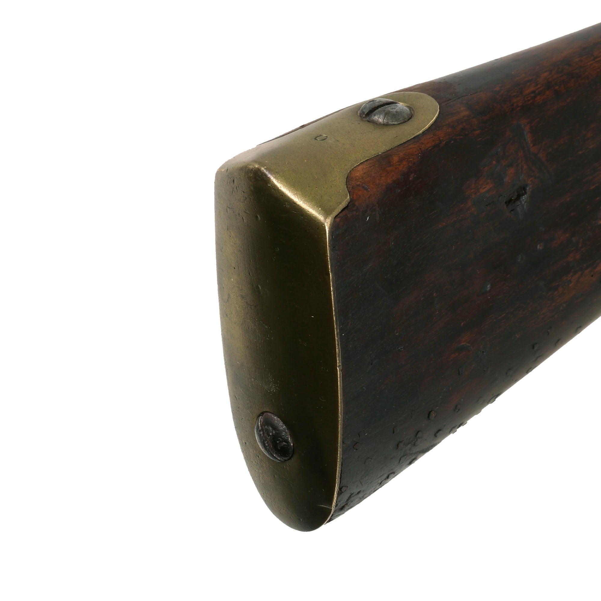 The metalwork overall has a polished steel matte patina from centuries of oxidation and subsequent cleaning. The brass fittings have been cleaned as well, but don't show nearly as much wear, and now display a mellow patina. The stock is in lovely condition,, showing no major damage, and it has a very nice worn look. Interestingly, on the bottom of the fore stock and even more so on the bottom of the butt stock there are numerous small copper tabs or nails in the stock, almost like there used to be copper tacks attached to decorate the carbine long ago. We do not understand how these were attached, or what function they serve, but they definitely add to the piece.