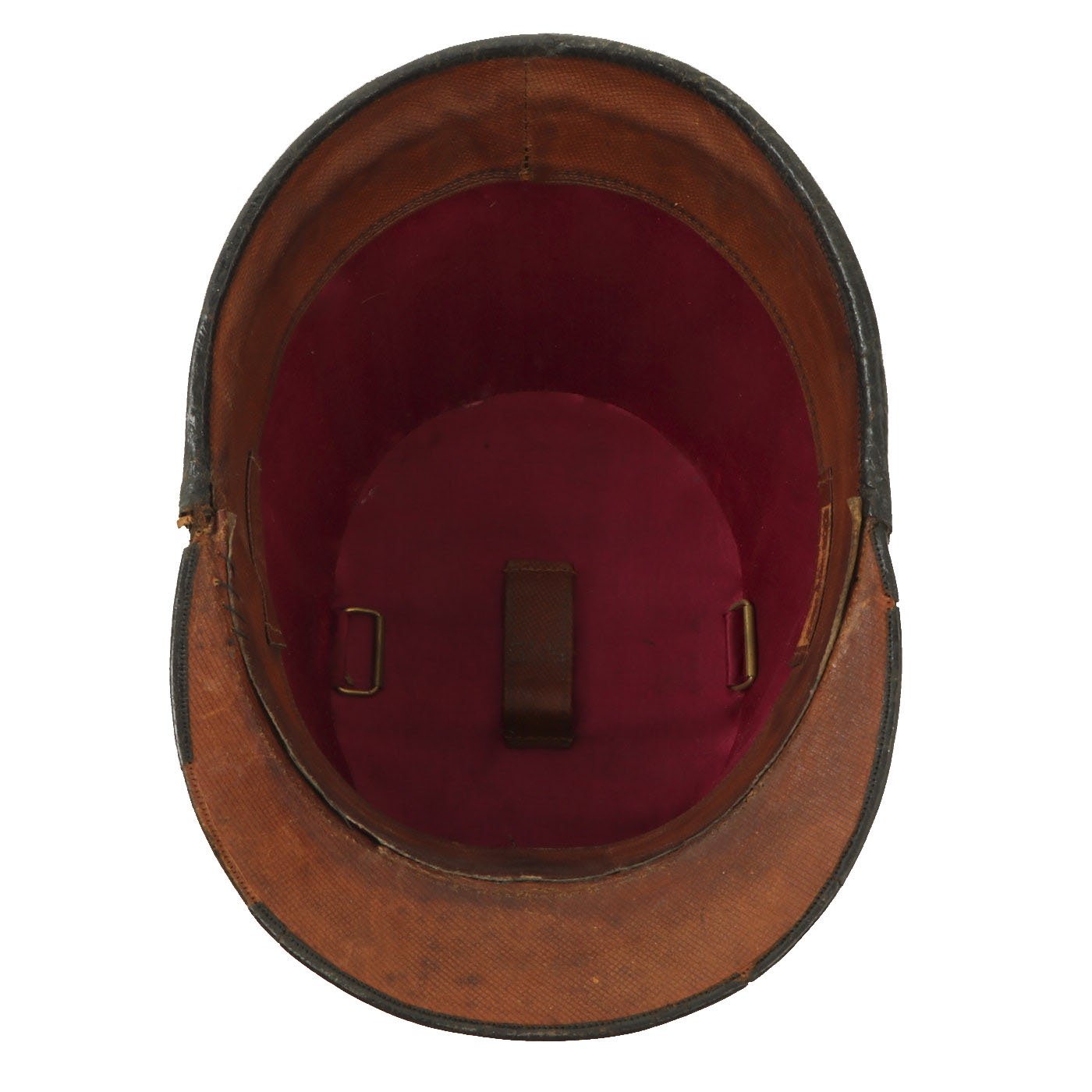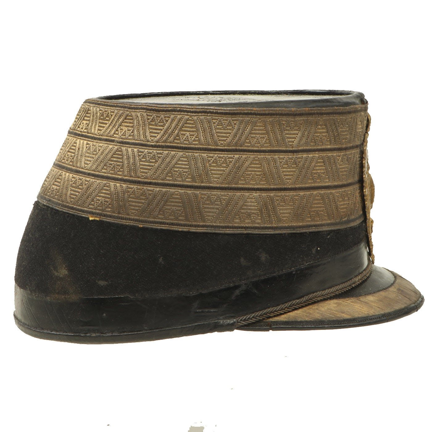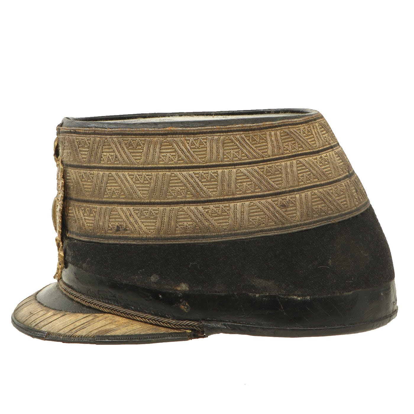 Original Item: Only One Available. Black felt body with leather crown, band and visor. Has triple bands of gold braid around the base of the crown, gold visor trim and cord. Complete with gilt eagle plate but missing cockade. Lined in maroon silk with leather sweatband. Overall very nice condition with expected wear from age present. Size is approximately US 7 (56cm).