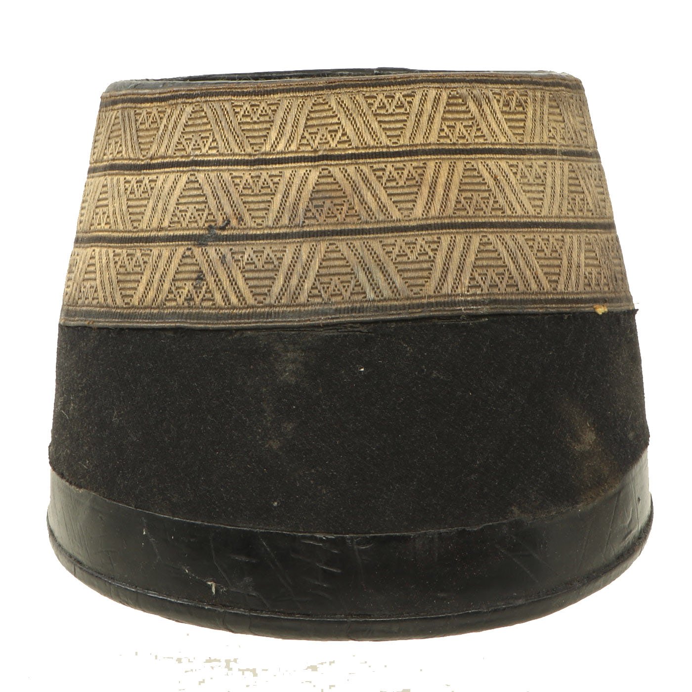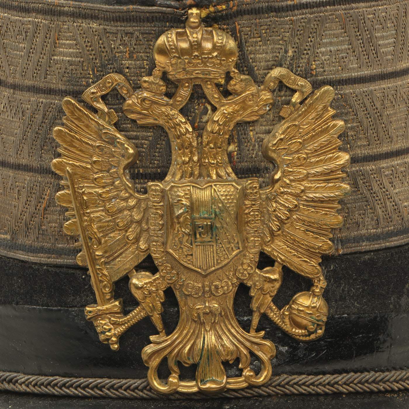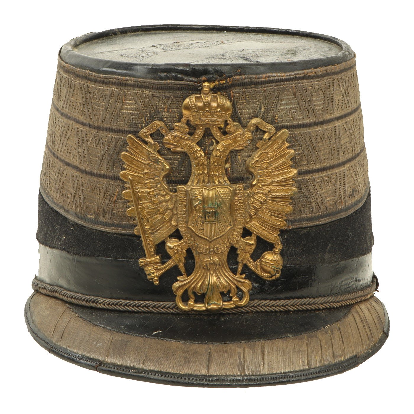 Original Item: Only One Available. Black felt body with leather crown, band and visor. Has triple bands of gold braid around the base of the crown, gold visor trim and cord. Complete with gilt eagle plate but missing cockade. Lined in maroon silk with leather sweatband. Overall very nice condition with expected wear from age present. Size is approximately US 7 (56cm).