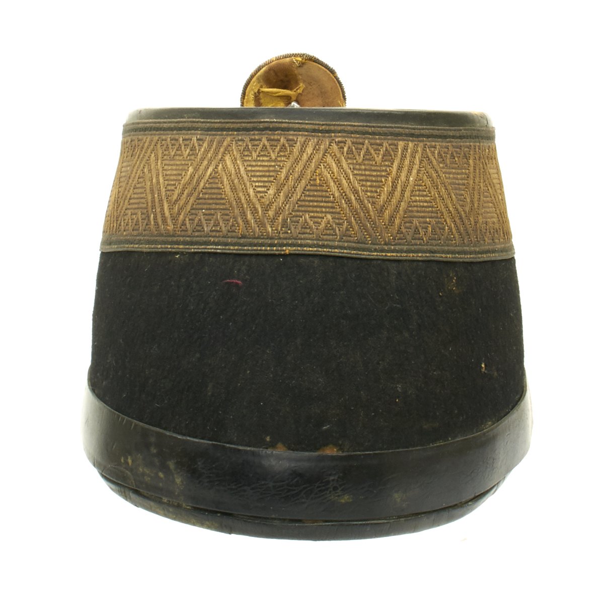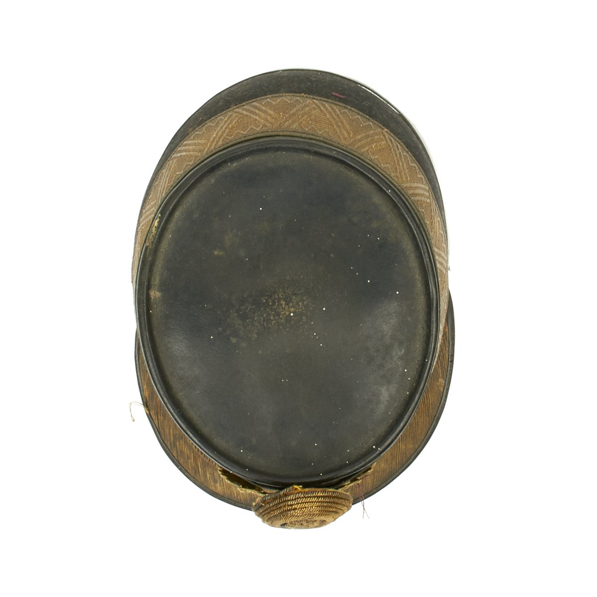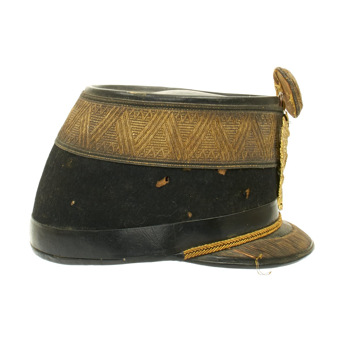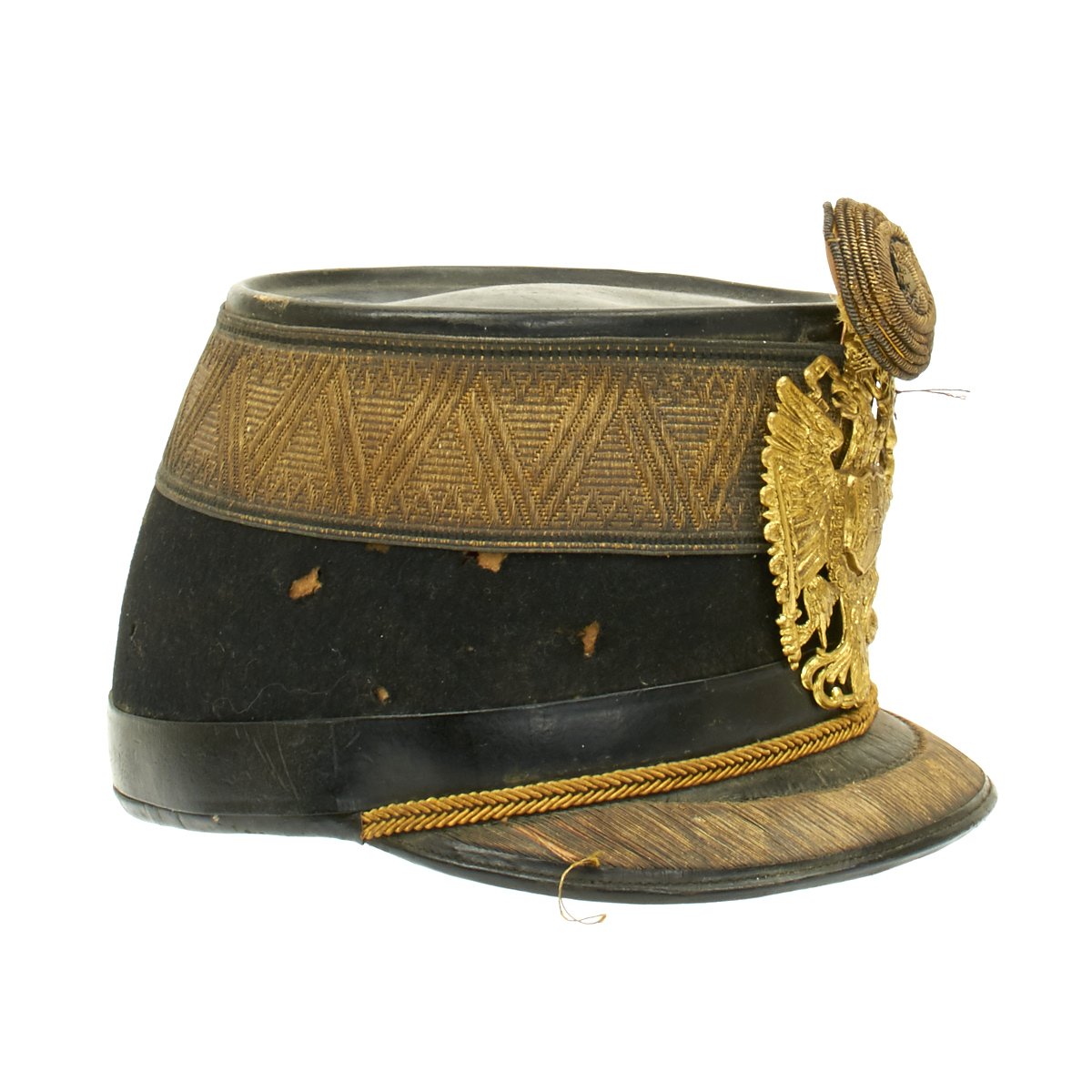 Original Item: Only One Available. Black felt body with leather crown, band and visor. Has single wide band of gold braid around the base of the crown, gold visor trim and cord. Complete with gilt eagle plate and bullion cockade with FJI cipher. Lined in red silk with leather sweatband. Overall very nice condition with expected wear from age present.