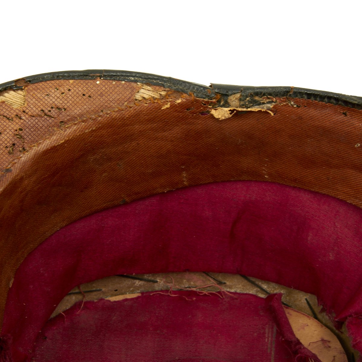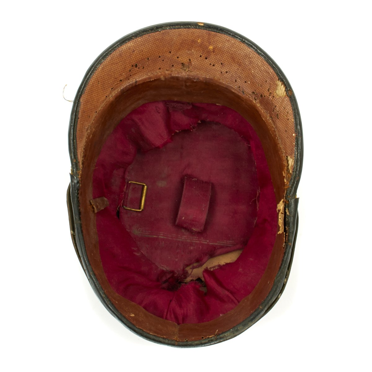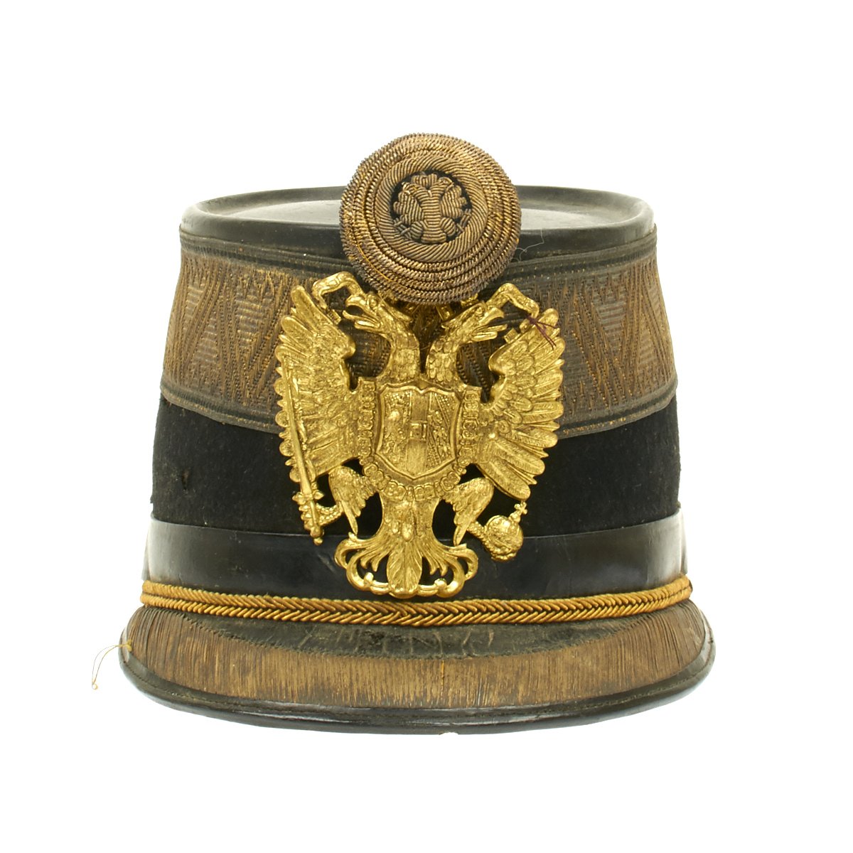 Original Item: Only One Available. Black felt body with leather crown, band and visor. Has single wide band of gold braid around the base of the crown, gold visor trim and cord. Complete with gilt eagle plate and bullion cockade with FJI cipher. Lined in red silk with leather sweatband. Overall very nice condition with expected wear from age present.