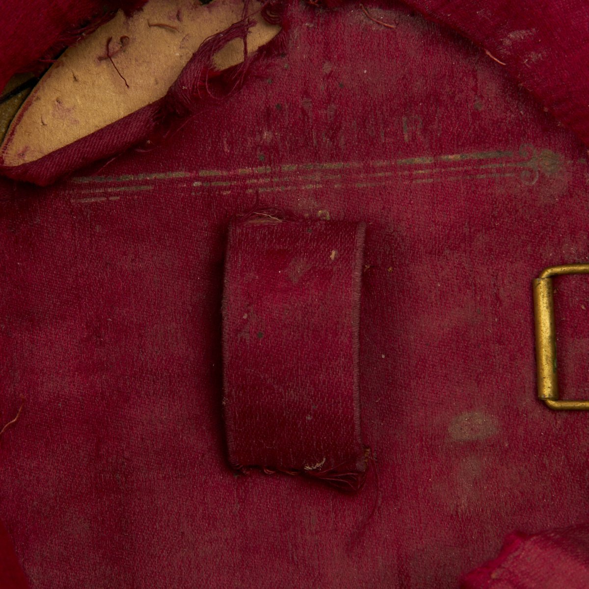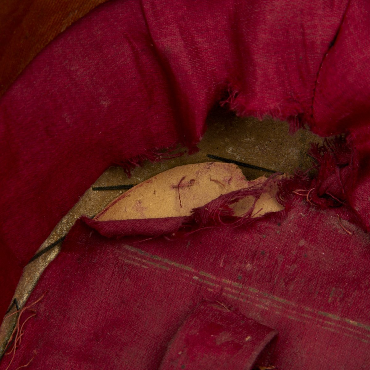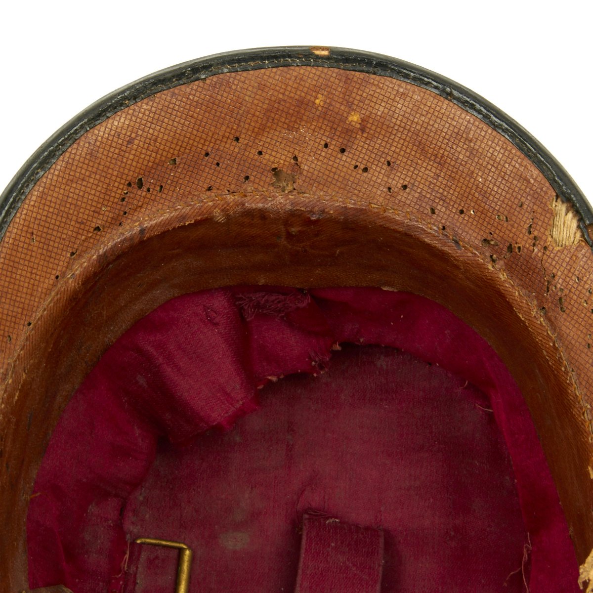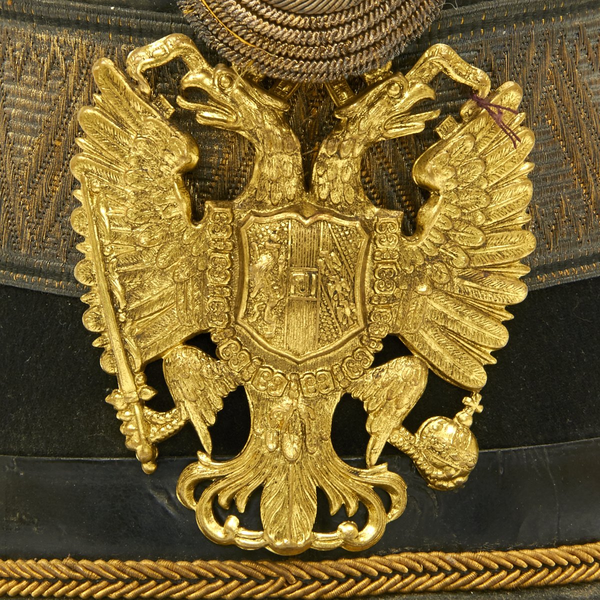 Original Item: Only One Available. Black felt body with leather crown, band and visor. Has single wide band of gold braid around the base of the crown, gold visor trim and cord. Complete with gilt eagle plate and bullion cockade with FJI cipher. Lined in red silk with leather sweatband. Overall very nice condition with expected wear from age present.