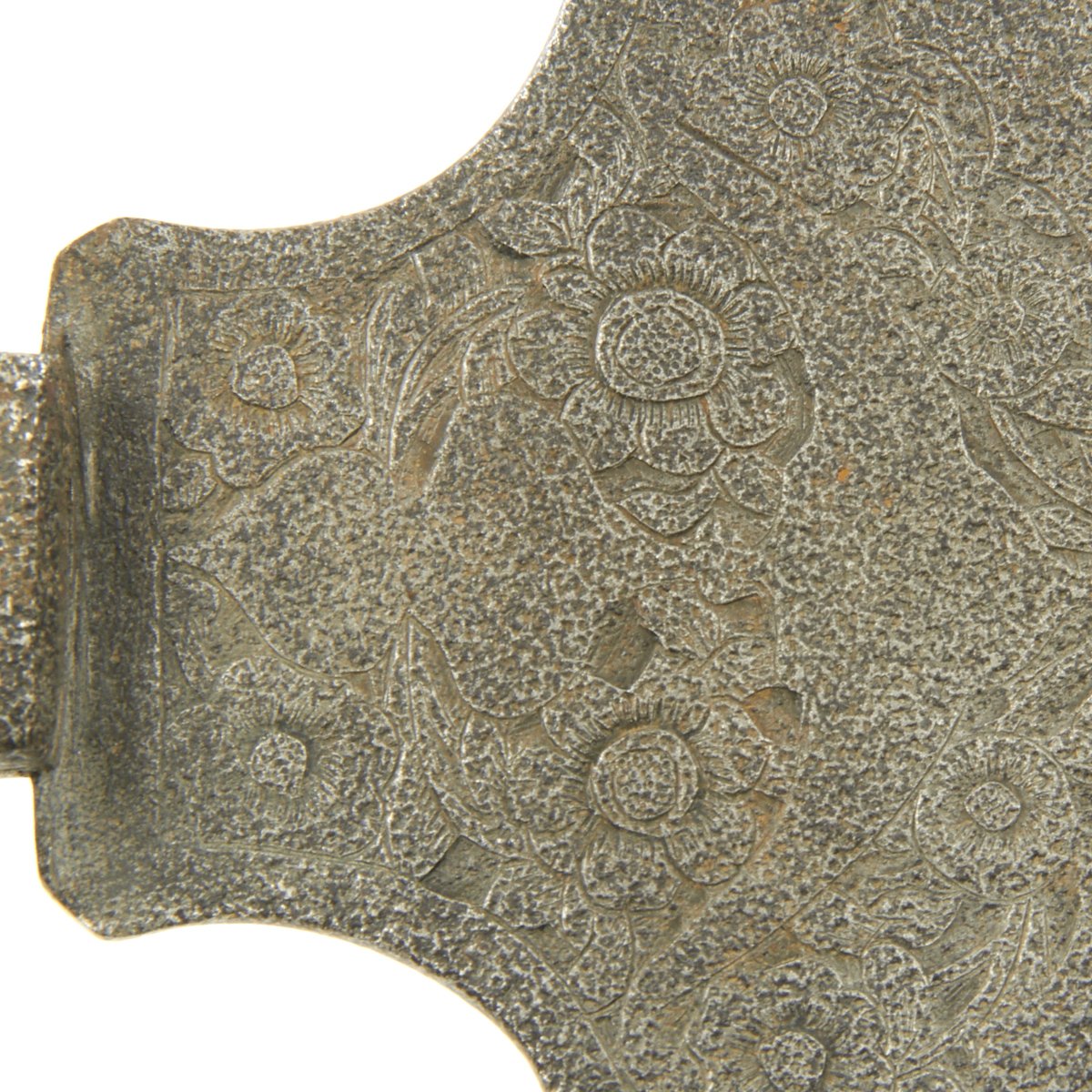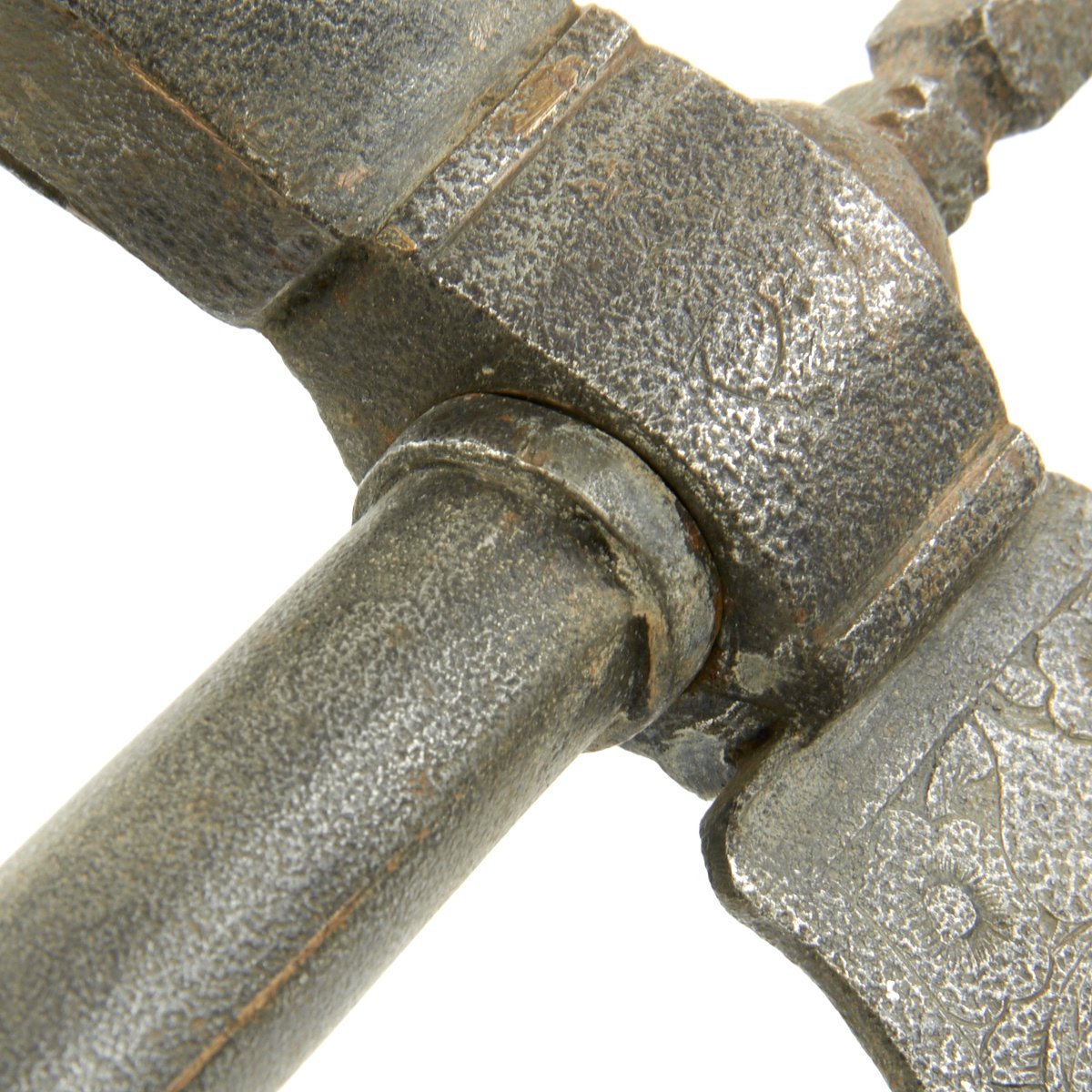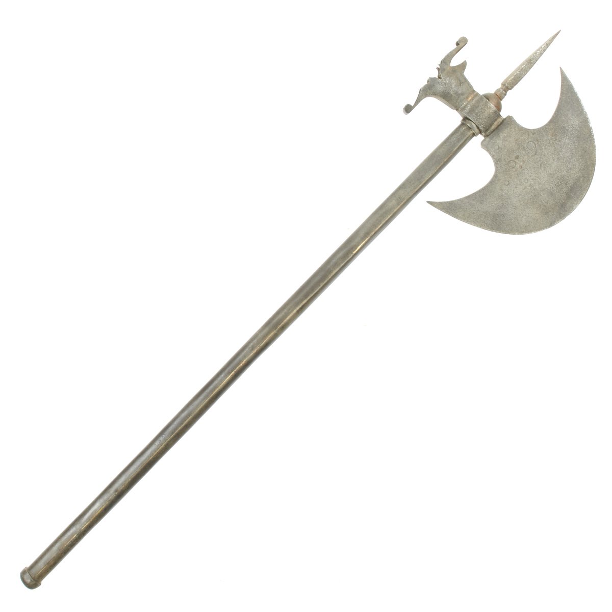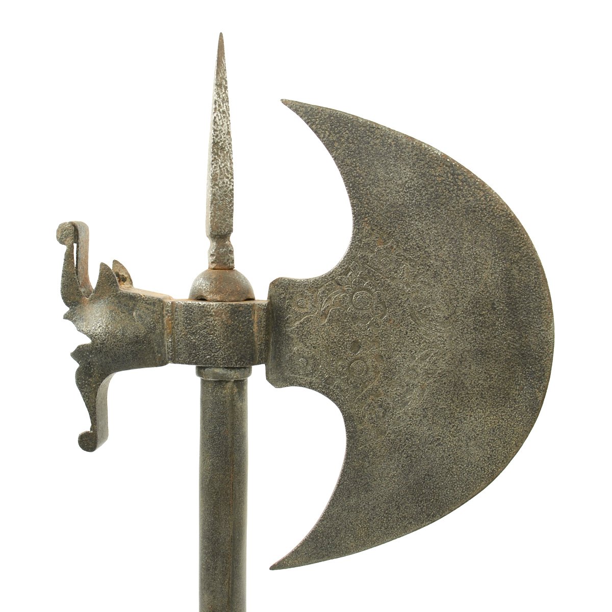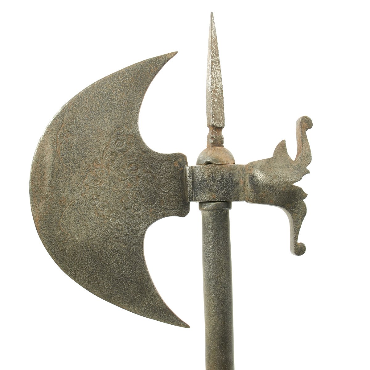 This example came out of the back door of a museum in Europe many years ago. It dates to the 1800's and could have originated anywhere from Western Persia to Eastern India. It looks like what we all imagined King Arthur's Knights to have carried. It measures 31 1/2" in overall length with a 8" blade. The virtually semi-circular blade is covered in decorative engravings of flowers etc., It has a Spike on the top and an all iron/steel hollow shaft, typical of this type of axe.