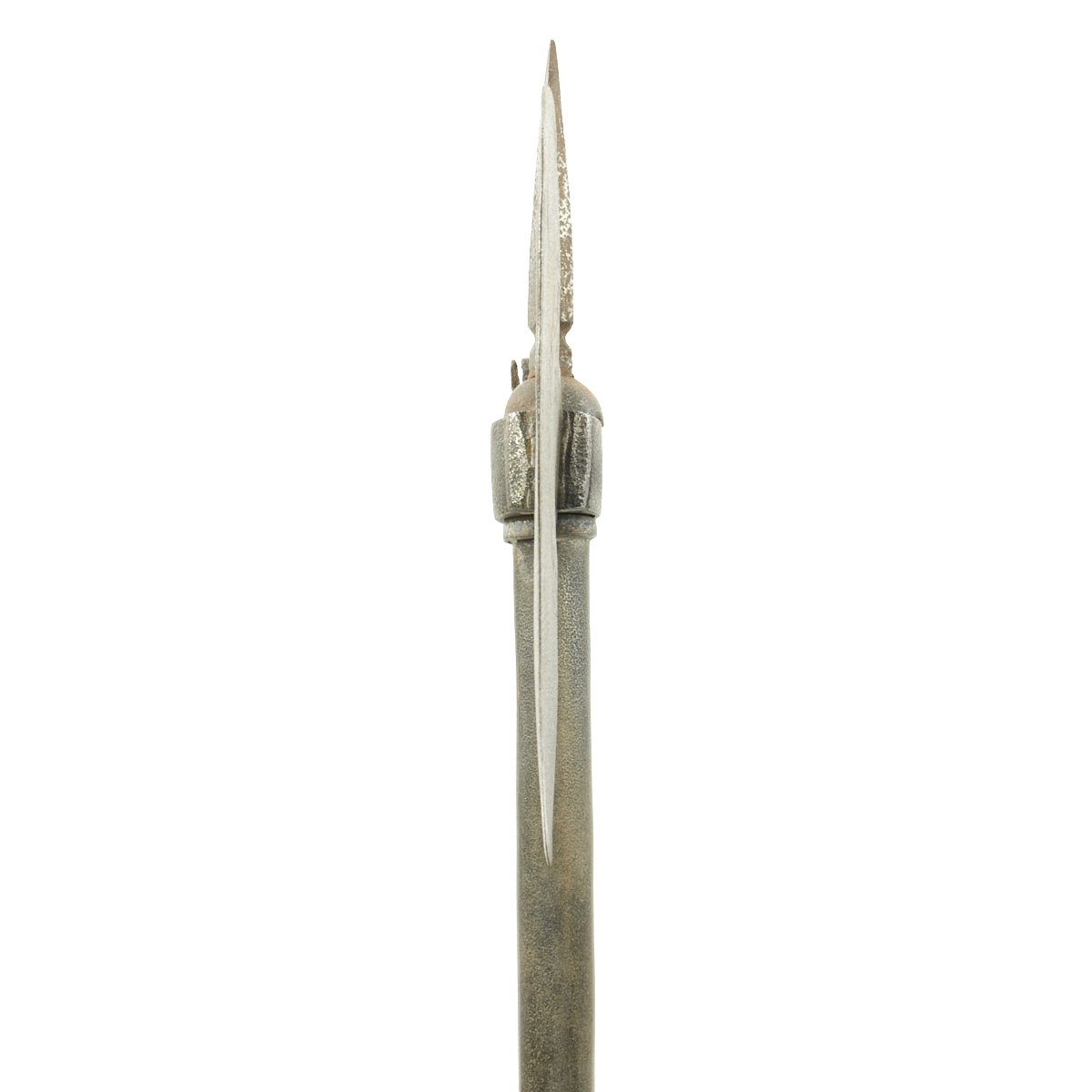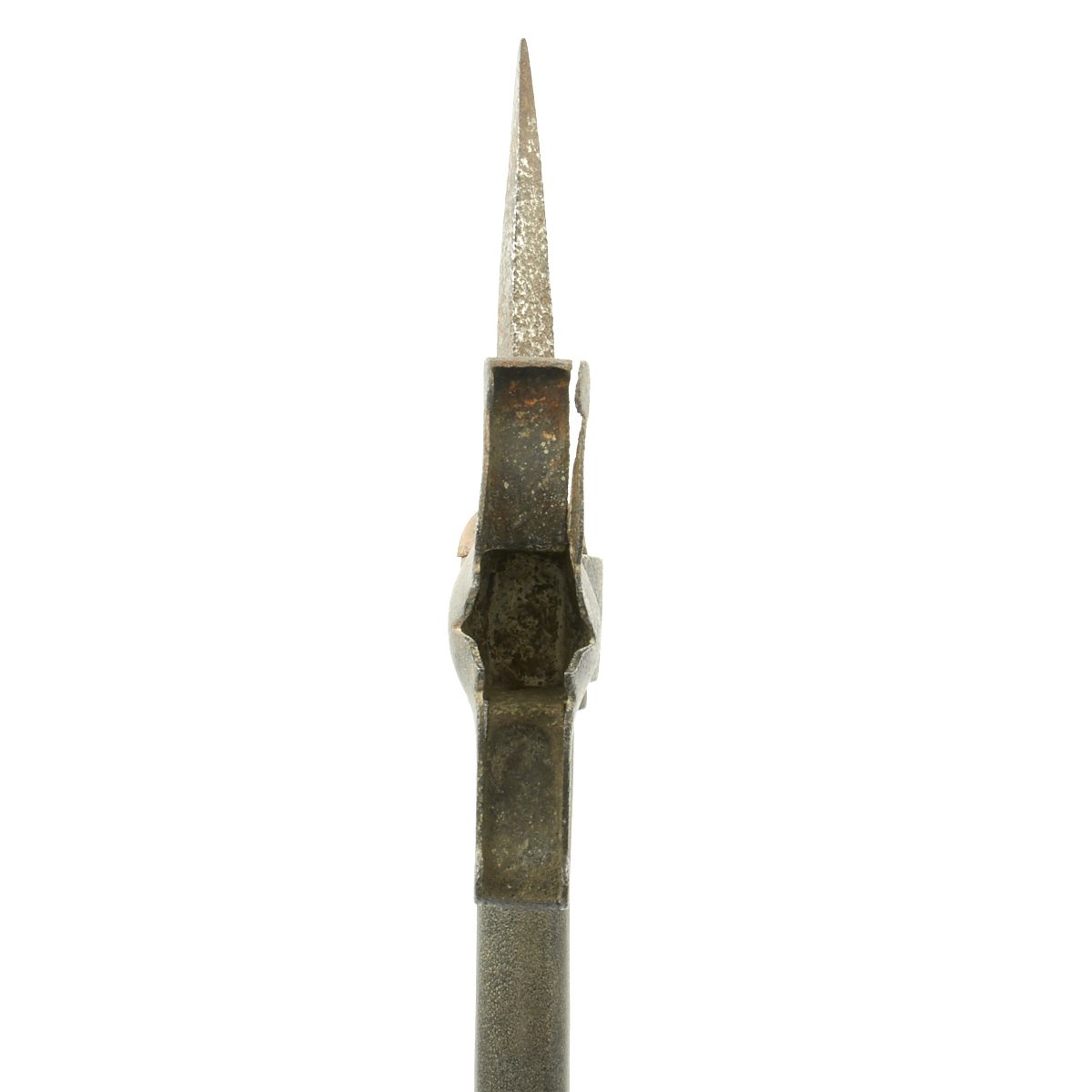 On the back side of the blade there is a mounting for something else which is now missing and by looking at this we have no idea what this may have been. The metal surface is covered with old pitting scars however this presents very well and has a very romantic feel to it. The head is also somewhat loose on the shaft.
