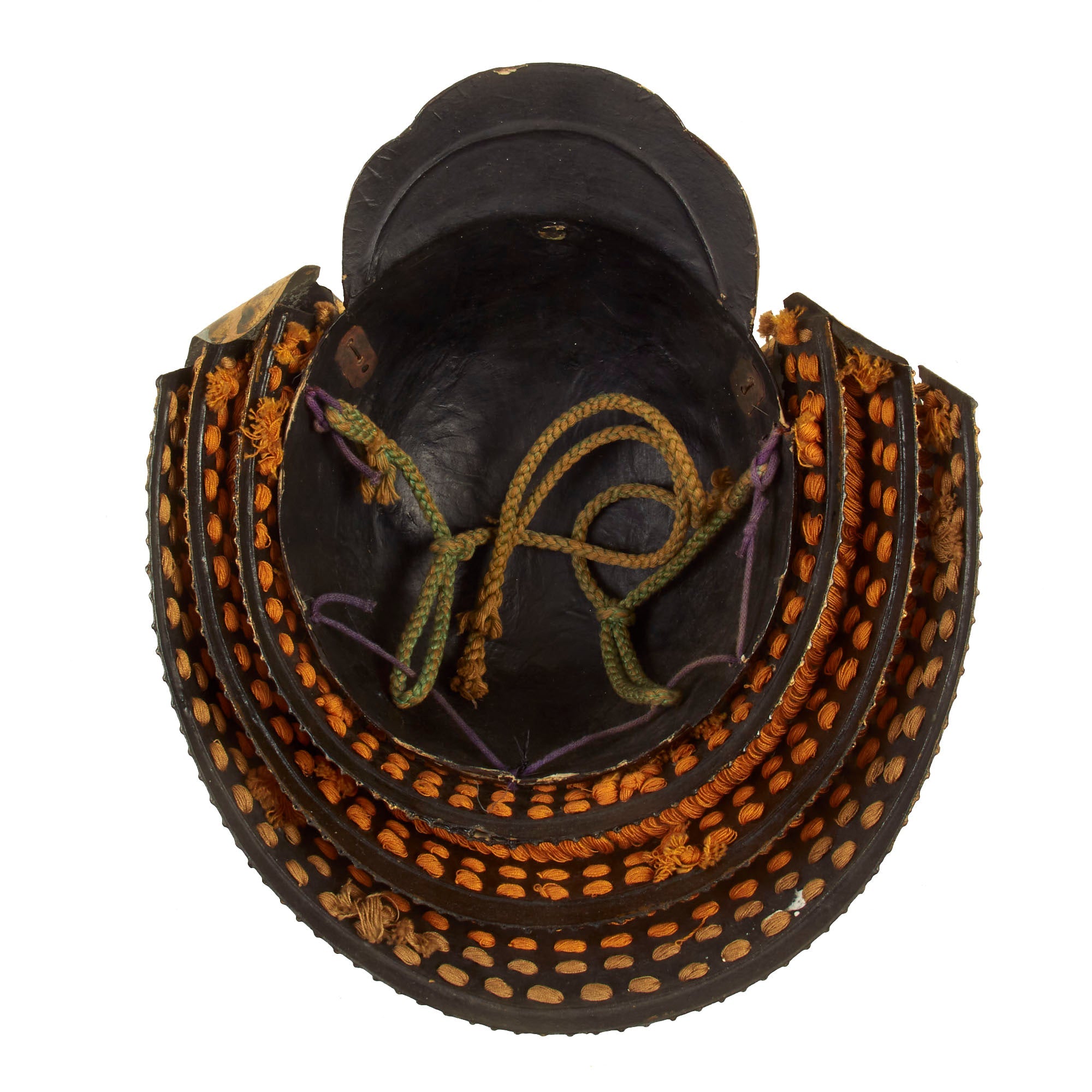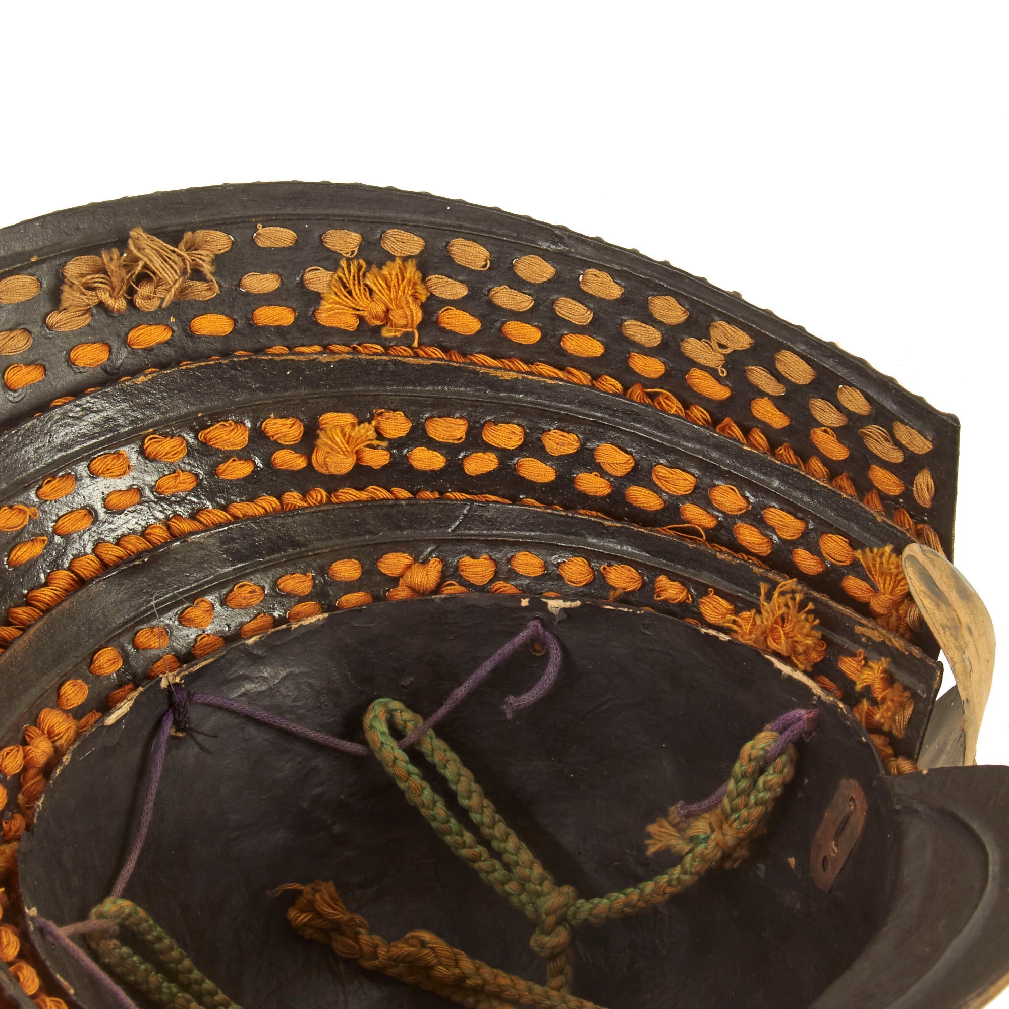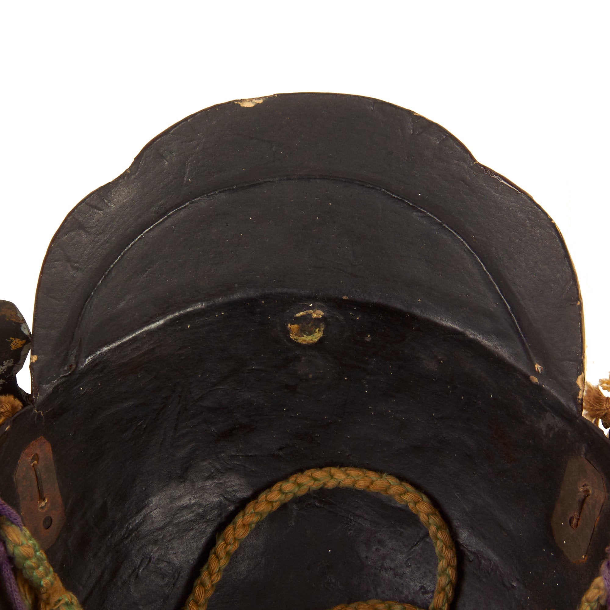 Regardless, it definitely shows very high quality construction, and the rear Shikoro, the suspended neck guard composed of multiple overlapping lames, is in wonderful condition and properly laced. All of the other components are completely correct in construction.