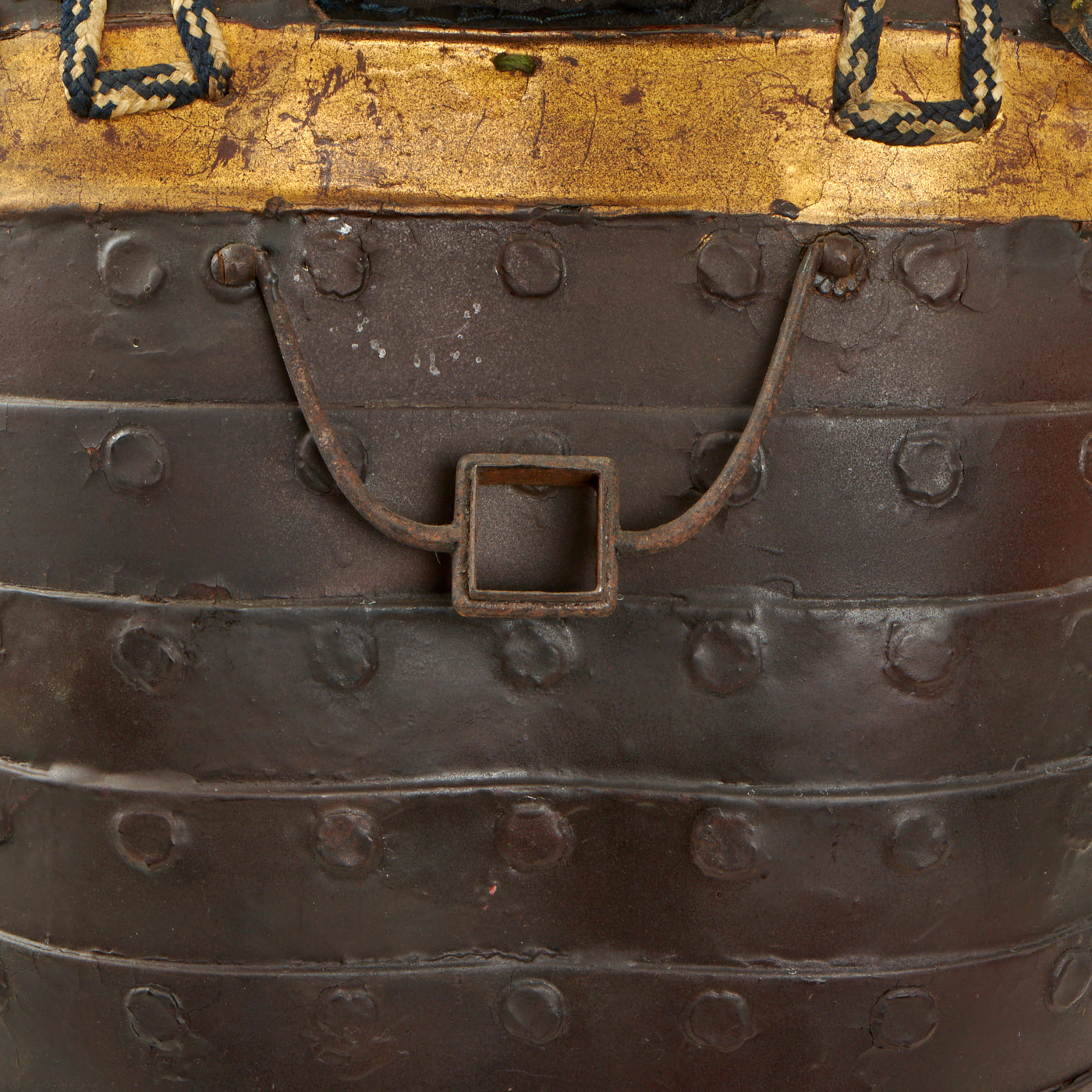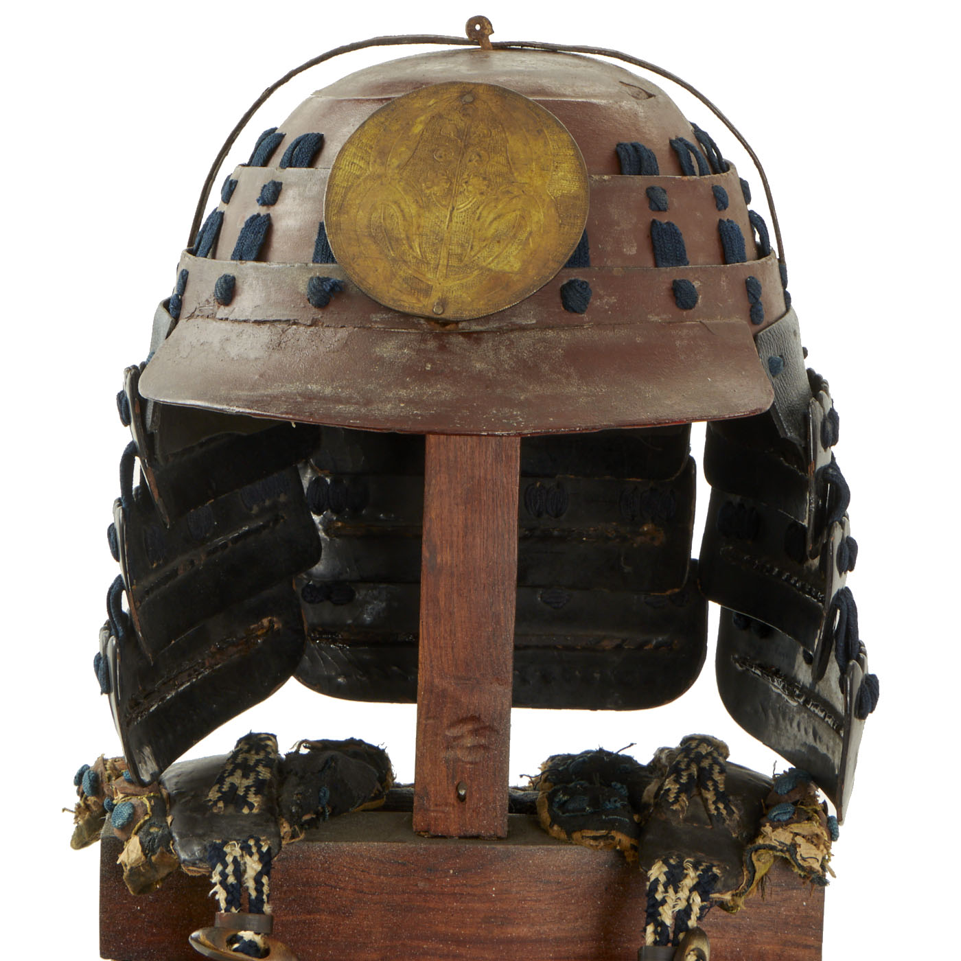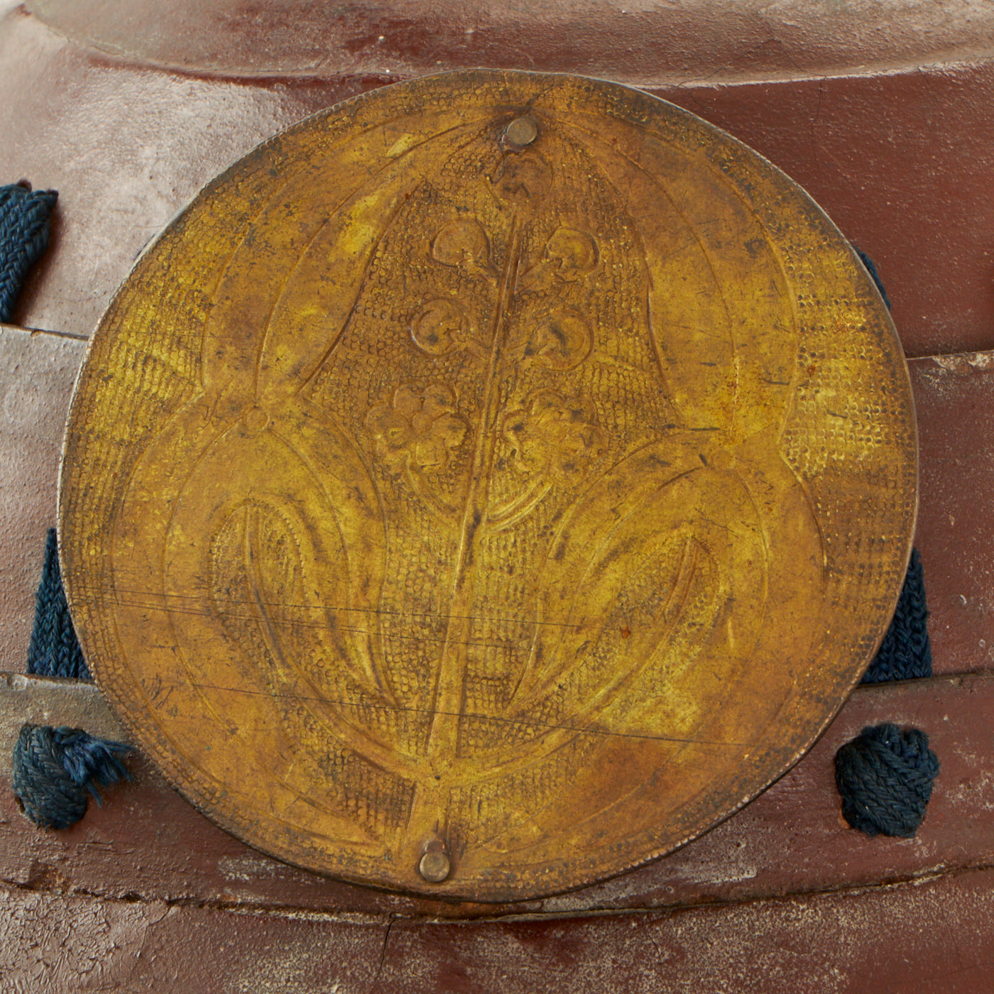 This example is offered in very good condition. The main portion of the helmet is made of blacksmith forged iron which has been lacquered with a rust brown finish. The plates are connected with blue cloth woven connection cords. The right, left and rear scaled protectors are made of Black lacquered leather, which is also suspended by the same blue fabric cording. It should be noted that the leather mounting the side scaled portions has been replaced, which makes sense, as this portion of the leather was not lacquered for the purpose of flexibility, and therefore has deteriorated over the years. This being said, the replaced leather does not detract from the outward displayability of the helmet. The front of the helmet is mounted a removable brass engraved family crest which is backed with blackened copper and slides onto an iron hook on the front of the helmet.