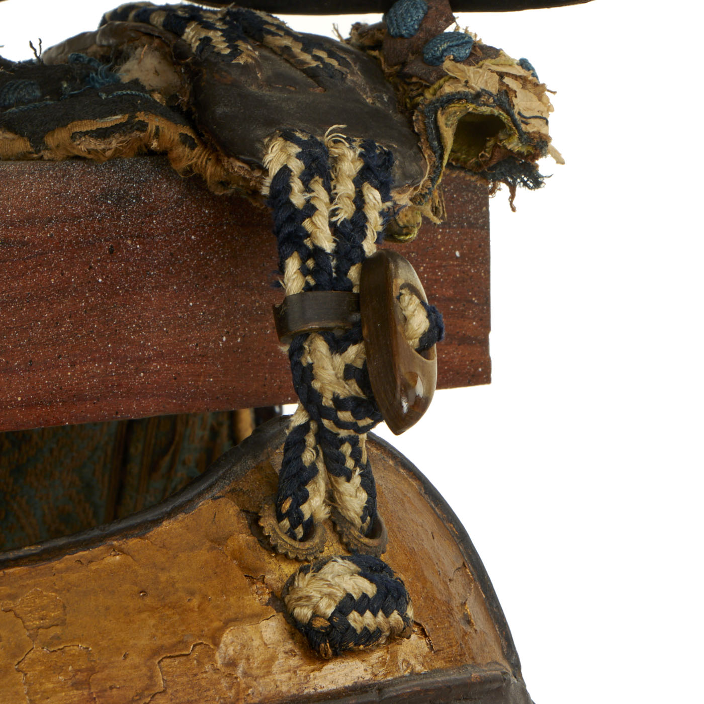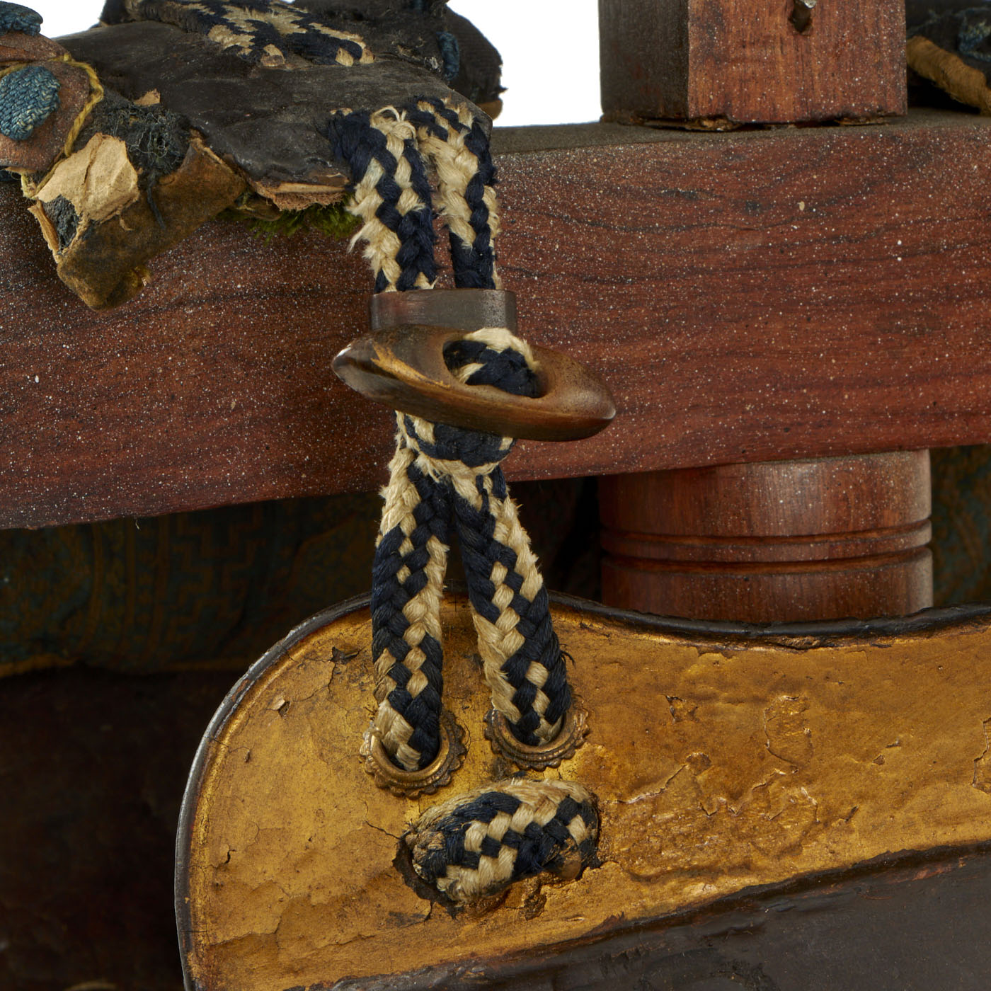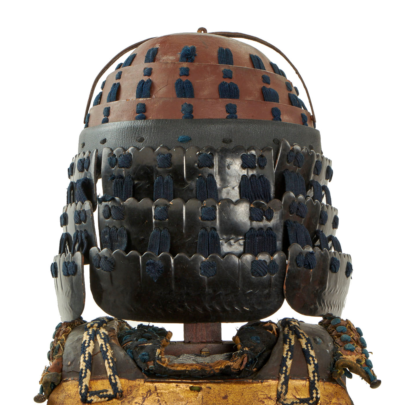 This example is offered in very good condition. The main portion of the helmet is made of blacksmith forged iron which has been lacquered with a rust brown finish. The plates are connected with blue cloth woven connection cords. The right, left and rear scaled protectors are made of Black lacquered leather, which is also suspended by the same blue fabric cording. It should be noted that the leather mounting the side scaled portions has been replaced, which makes sense, as this portion of the leather was not lacquered for the purpose of flexibility, and therefore has deteriorated over the years. This being said, the replaced leather does not detract from the outward displayability of the helmet. The front of the helmet is mounted a removable brass engraved family crest which is backed with blackened copper and slides onto an iron hook on the front of the helmet.
