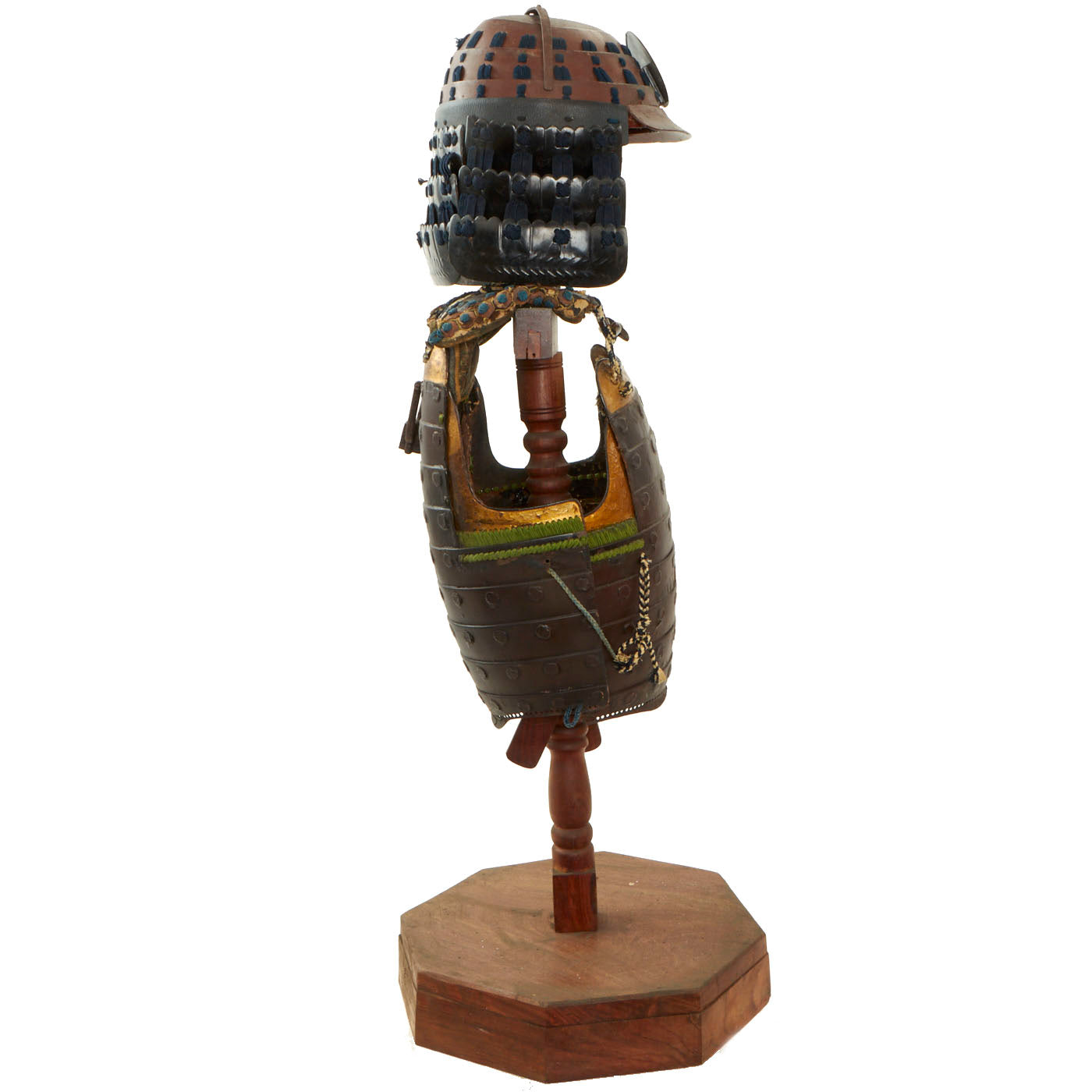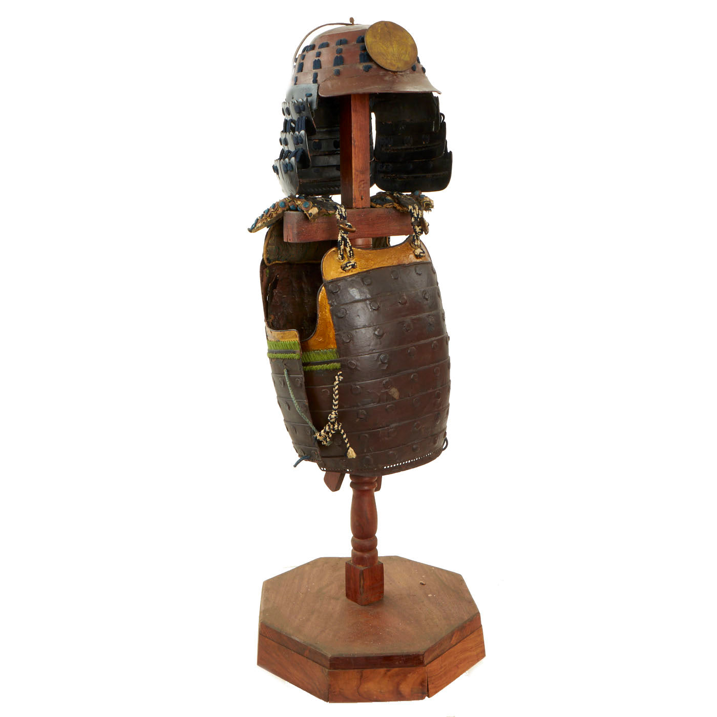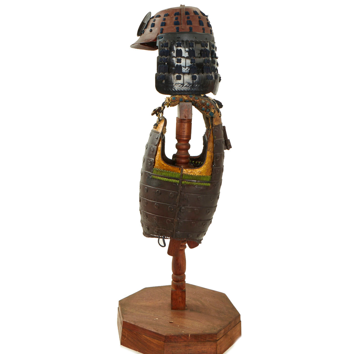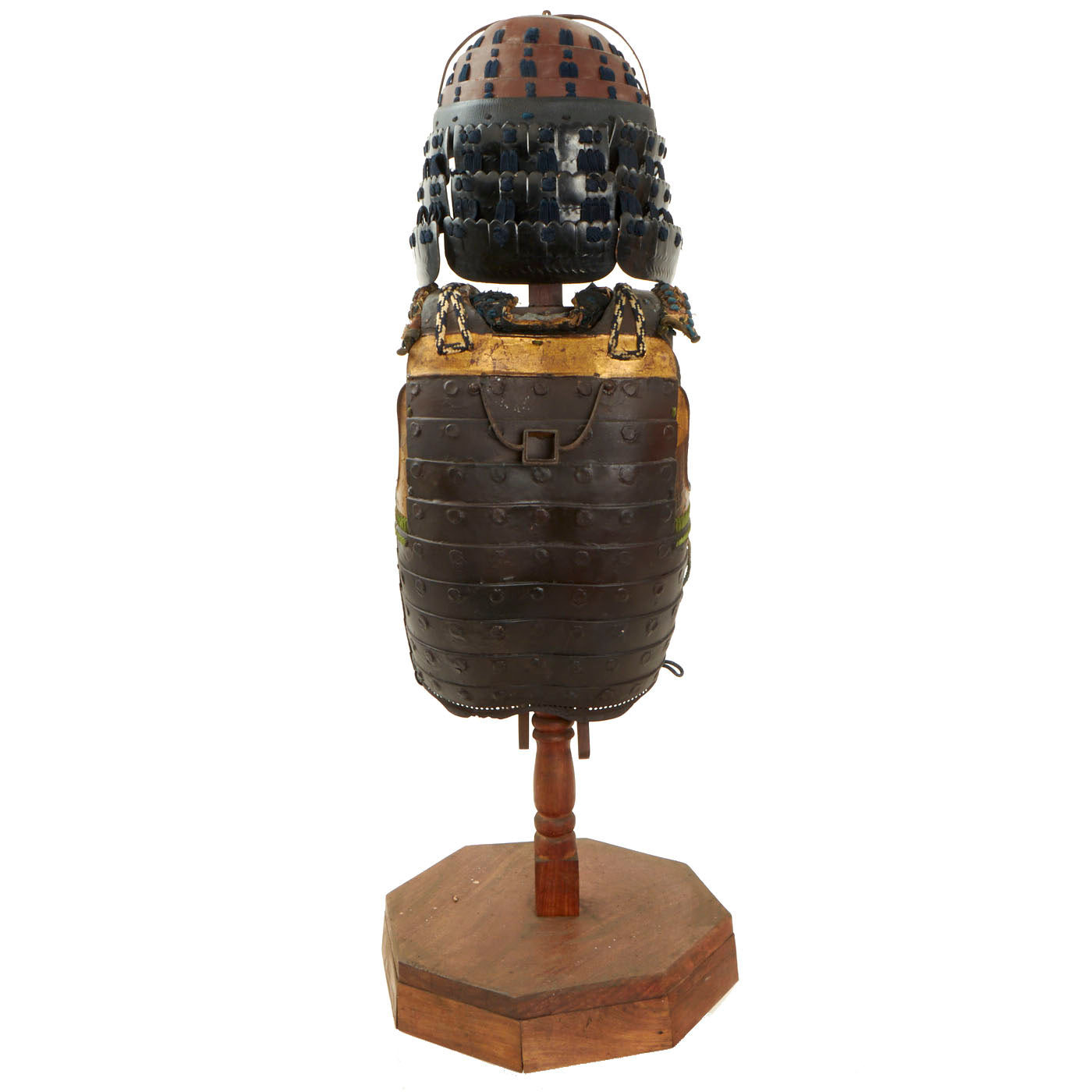 Colors are black, gold, rust brown, and green. Dates from the first half of the 19th century during the Edo period. The chest plate constructed of riveted scales of lacquered iron, which hinge open on the left side. The interior of the armor is lined with a thin layer of lacquered handlayed paper, which appears to mimic the appearance of calfskin leather. Shoulder scales and armpit protectors are lacquered leather. Shoulder pieces are of hexagonal pieces of iron sewn into a decorative fabric pattern. The main means of securing the armor is via the blue/white fabric fastened with toggles made by horn. The toggle on the right side chest of the armor is unfortunately missing, but does not detract from the displayability of the armor. On the reverse of the breastplate is an iron hinged mount to which a pole could be secured to display a banner. The armor shows obvious signs of honest wear and age, but regardless, displays handsomely especially when paired with the helmet.