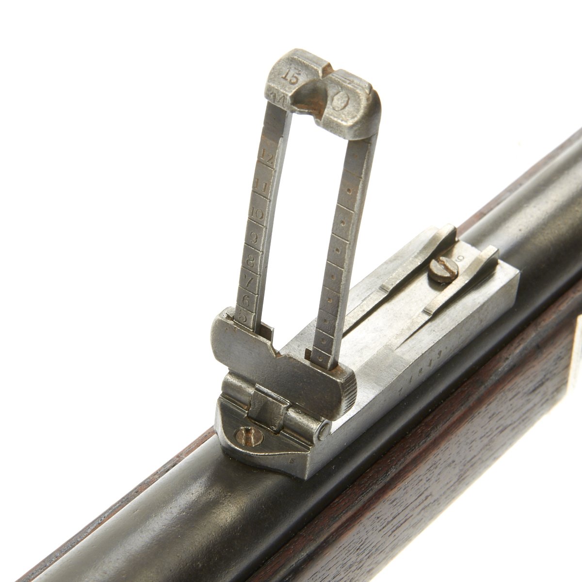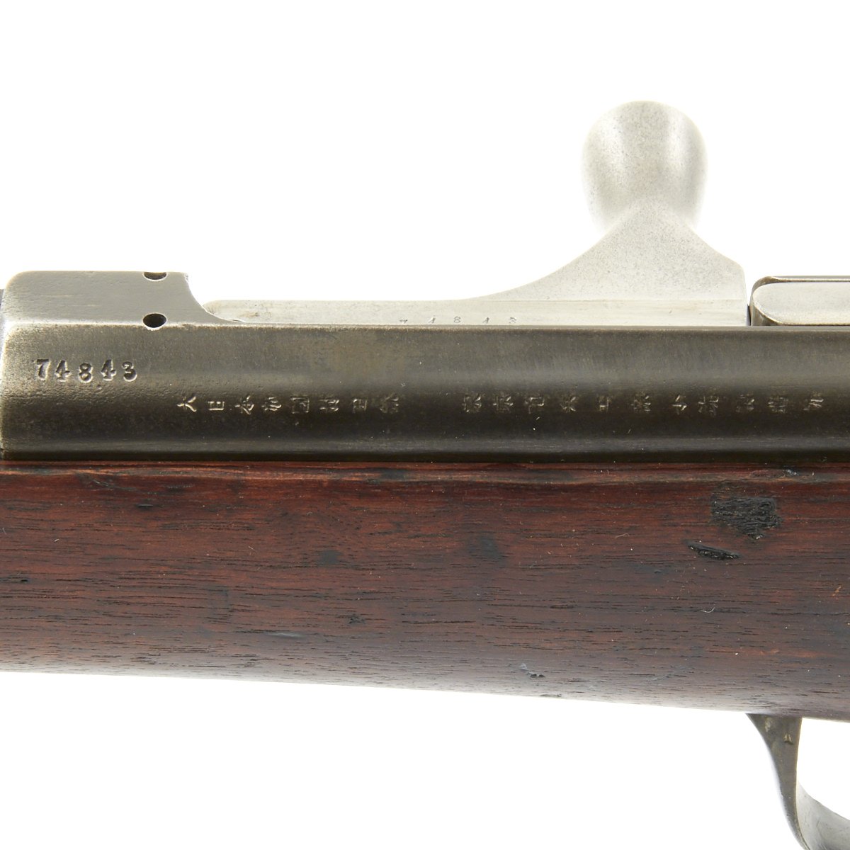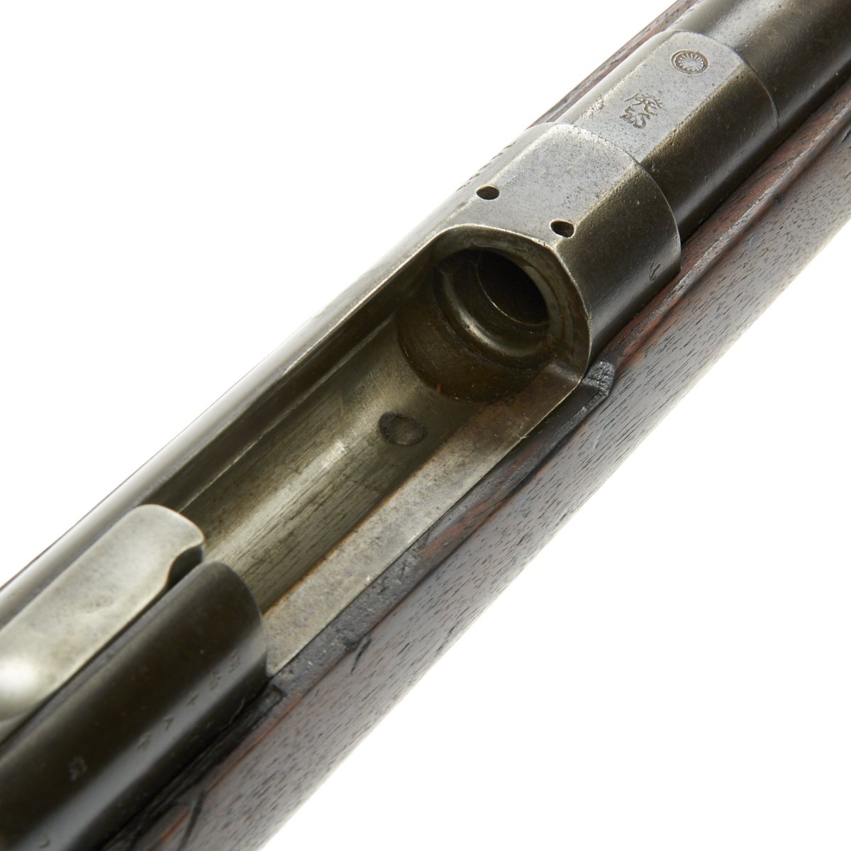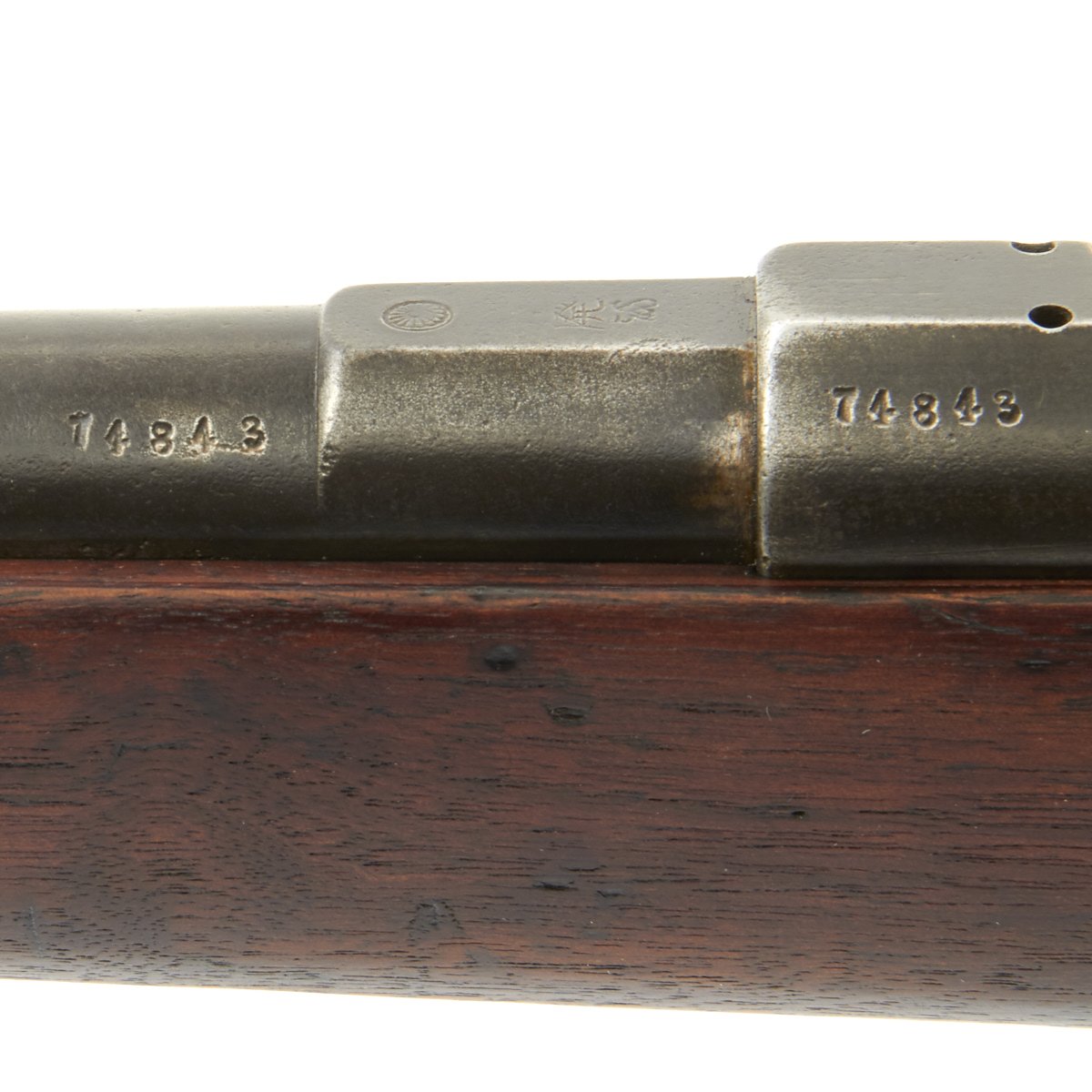 Even more rare however is the INTACT CHRYSANTHEMUM marking above the chamber, and the fully matching serial number of 74843. In imperial Japan, small arms were required to be stamped with the imperial chrysanthemum crest (菊花紋章, kikukamonshō or kikkamonshō), as they were considered the personal property of the emperor. When being taken or sold out of service, this marking was to always be removed, but this one was not, something we have not seen before on a Murata rifle.