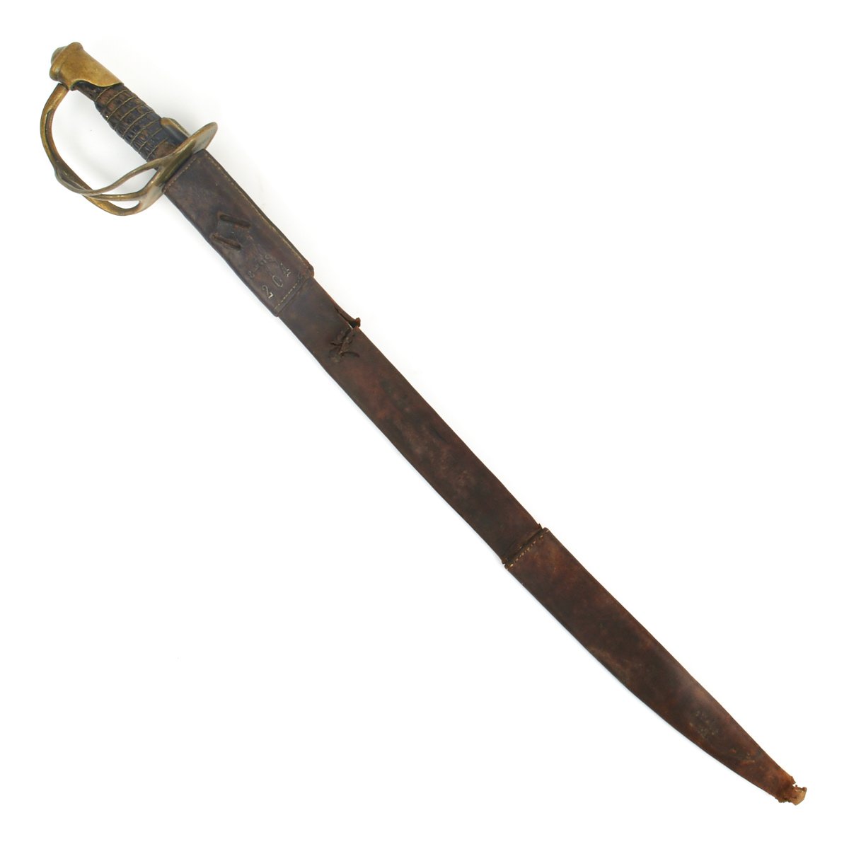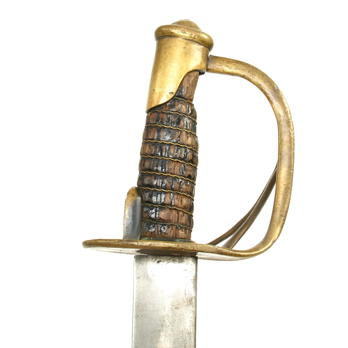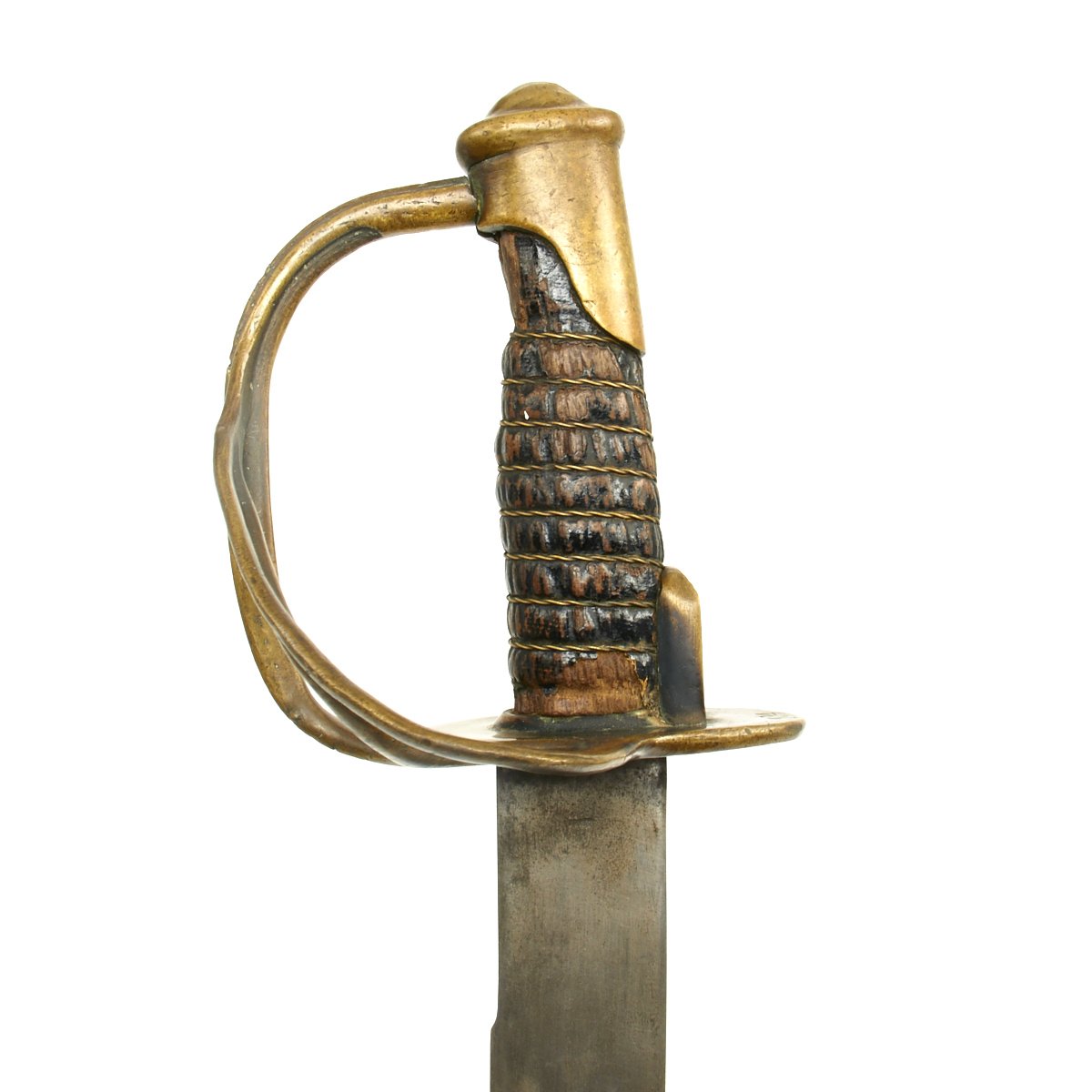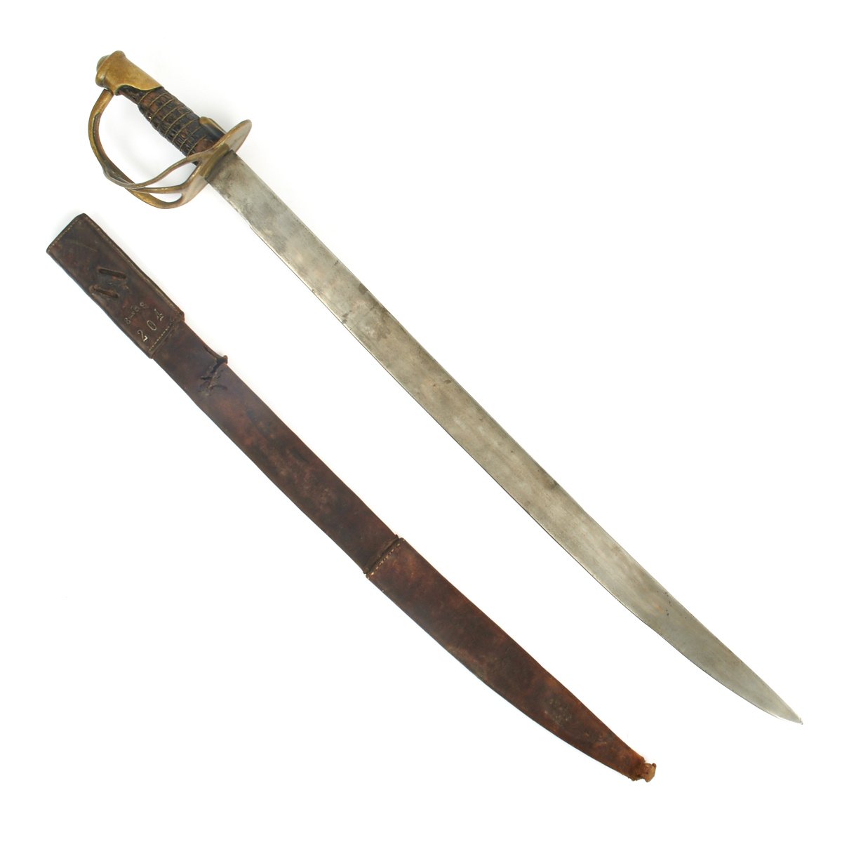 Original Item: Only One Available. This is a most unusual Infantry sidearm we've not encountered before. It features a French style 1822 brass three branch guard surrounding a ray skin covered and brass wire bound grip. The "cutlass" style unfullered blade is 28" in length. Overall length is 33". The most interesting feature is the addition of a brass thumb rest to the upper side of the grip directly behind the guard. The Cutlass comes with typical French brass mounted hard leather scabbard.