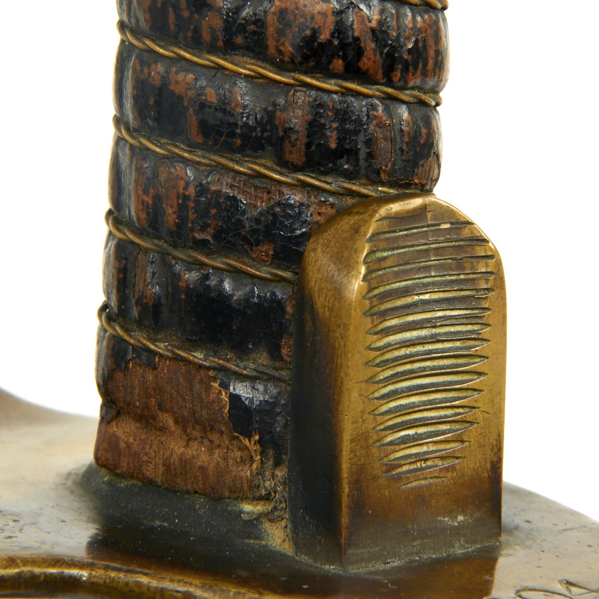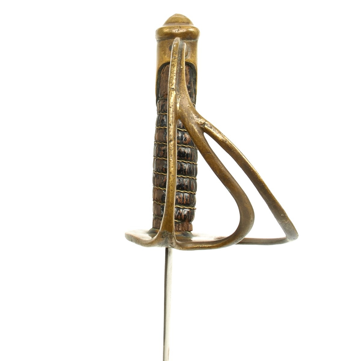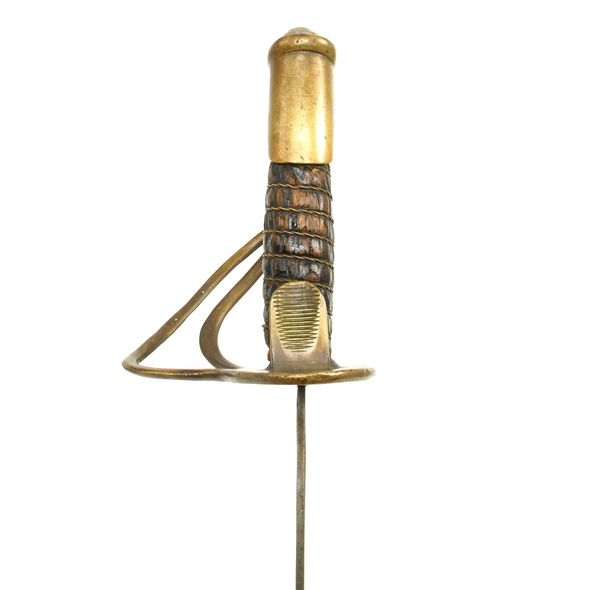Original Item: Only One Available. This is a most unusual Infantry sidearm we've not encountered before. It features a French style 1822 brass three branch guard surrounding a ray skin covered and brass wire bound grip. The "cutlass" style unfullered blade is 28" in length. Overall length is 33". The most interesting feature is the addition of a brass thumb rest to the upper side of the grip directly behind the guard. The Cutlass comes with typical French brass mounted hard leather scabbard.