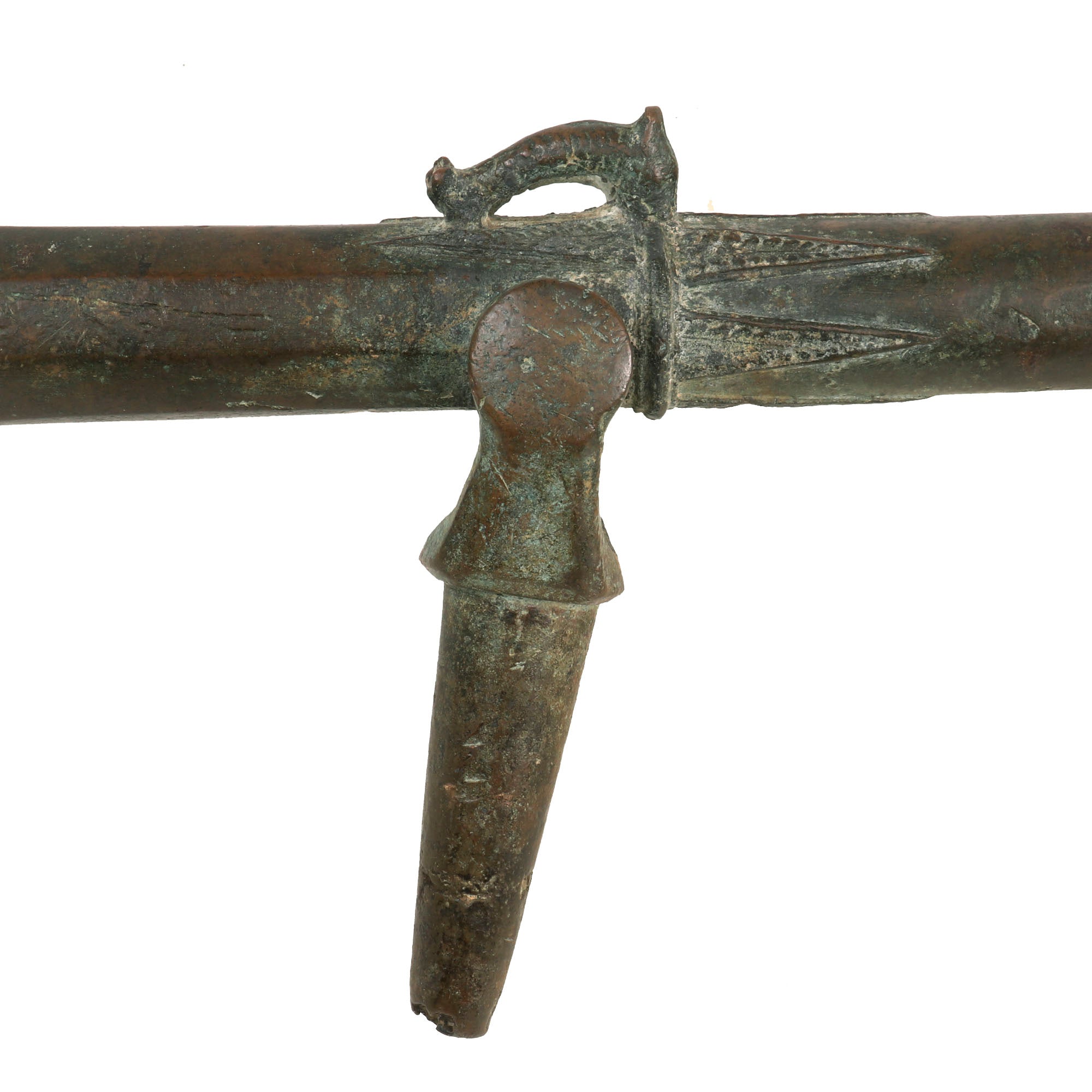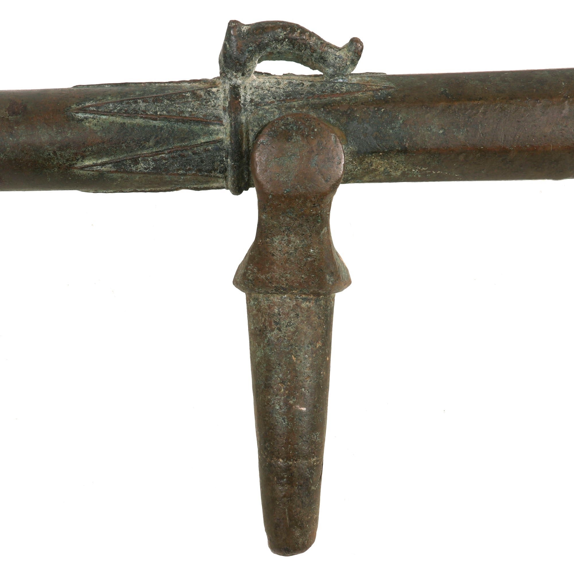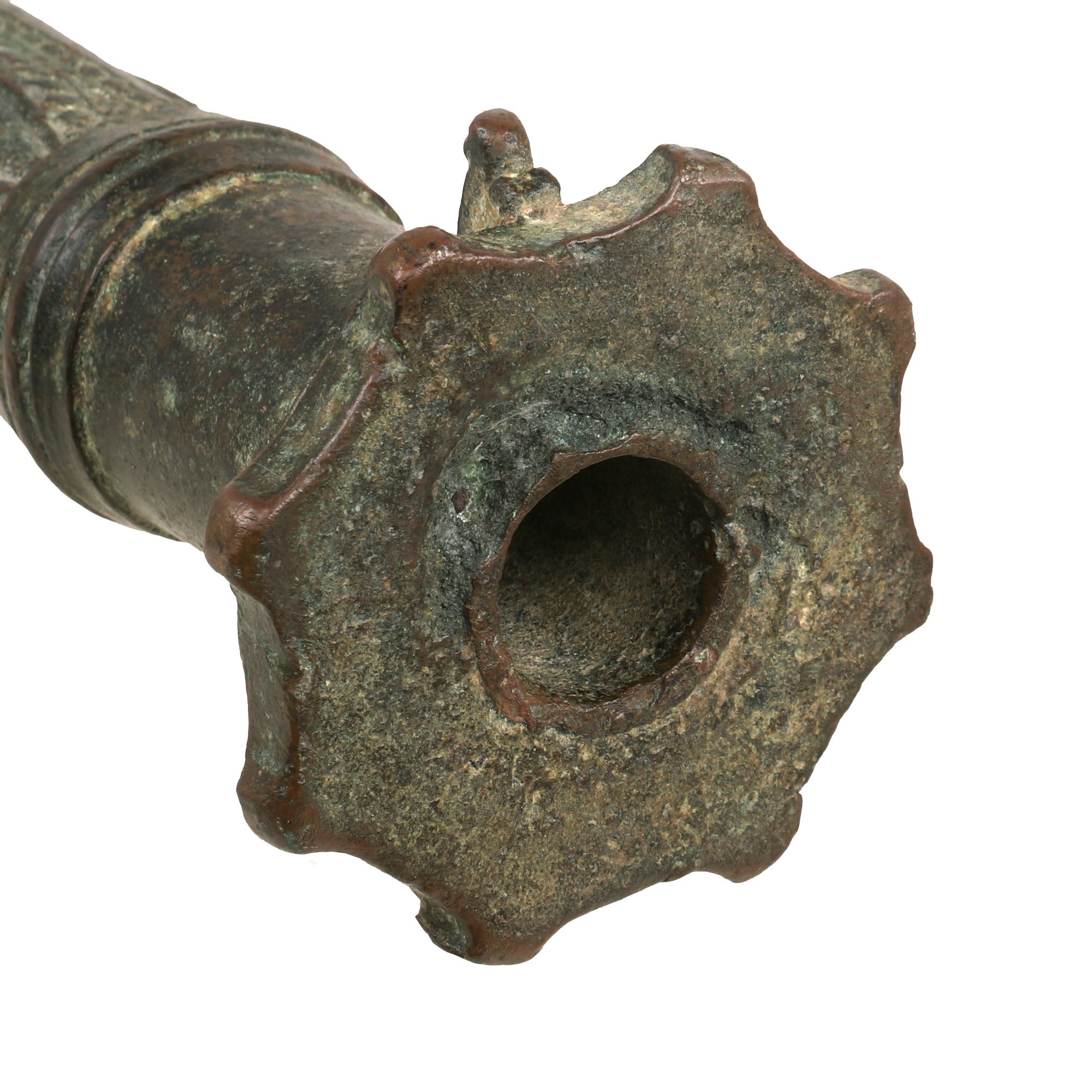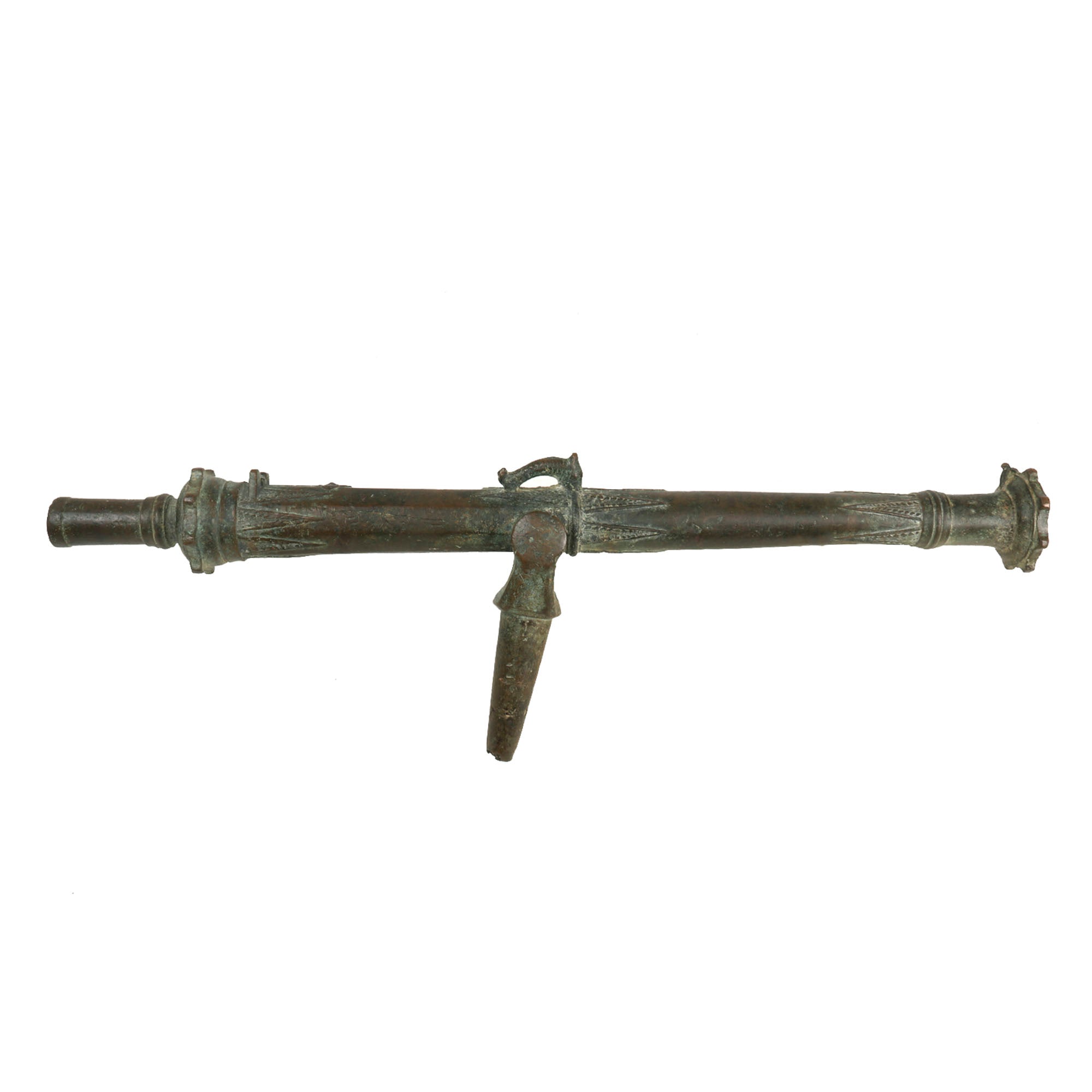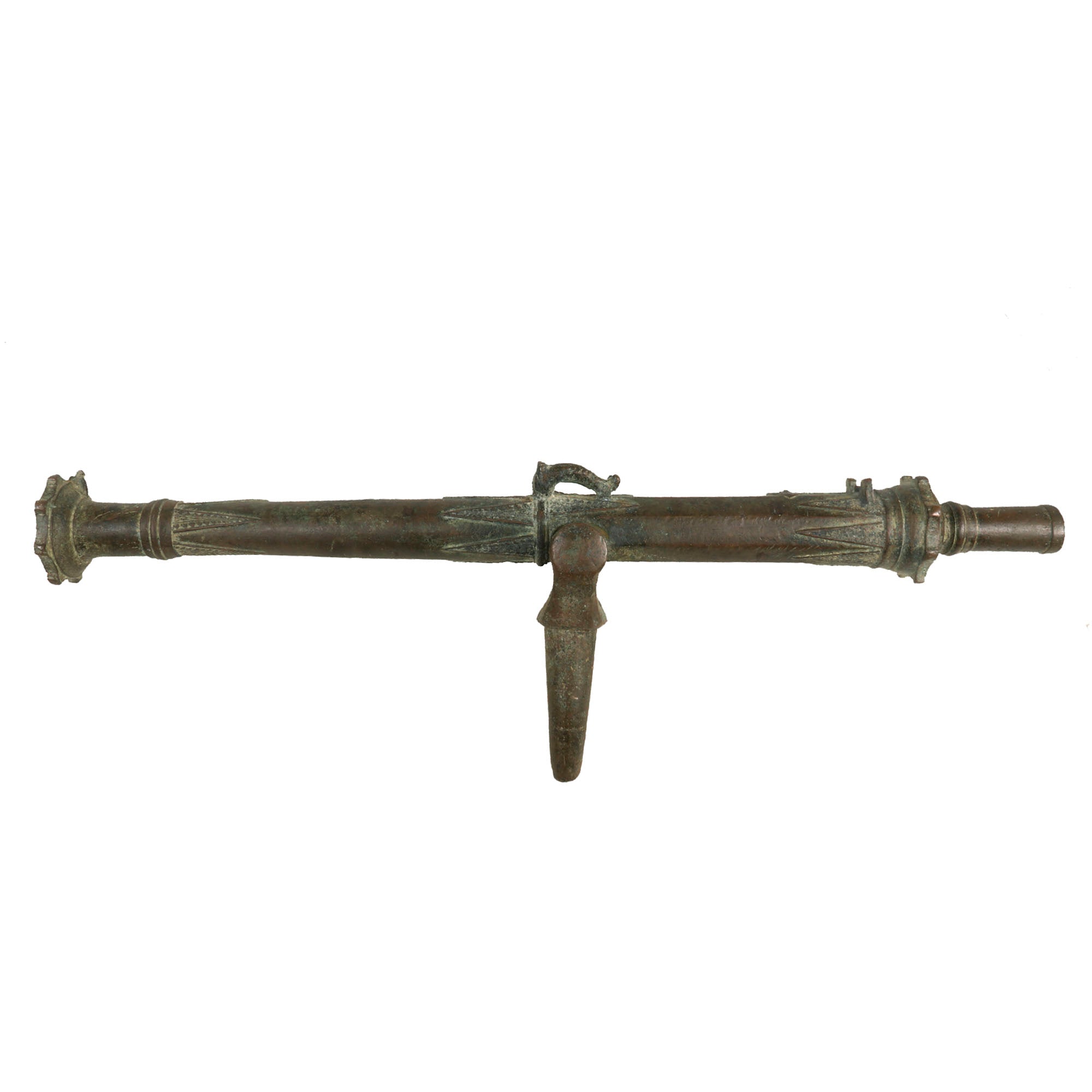 Our example measures 33 ¾" in length and has a 1 ⅛" bore, built to traditional lines it has a muzzle flared out to 3 ¾". Bearing much cast in decoration, the cannon comes complete with an integral swivel mount for use at sea or land fortification. It also has two lovely dolphin ornaments on top. much like those seen on European cannon of the era. These originally had a wooden handle on the end, however as with most it is missing, and only the socket remains.