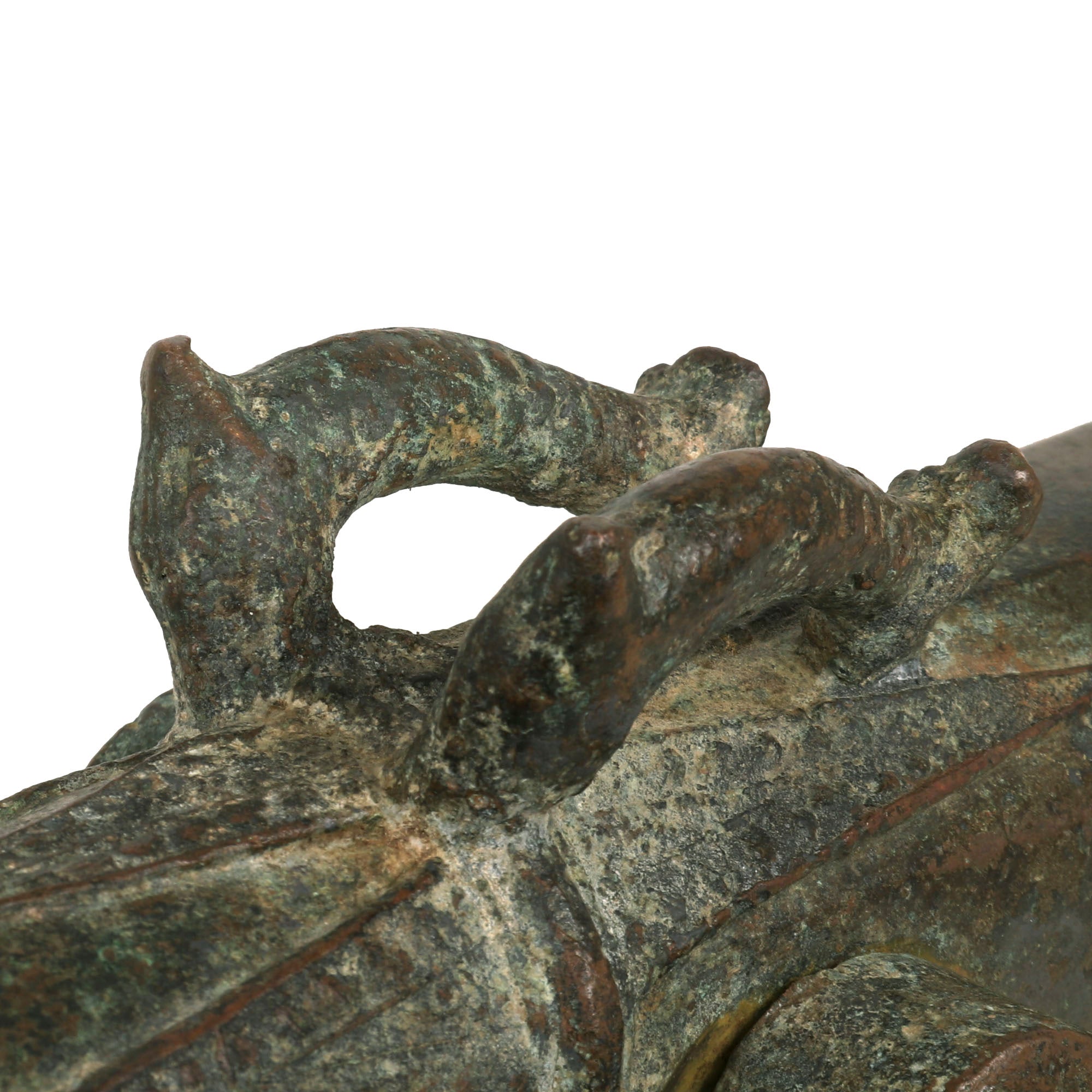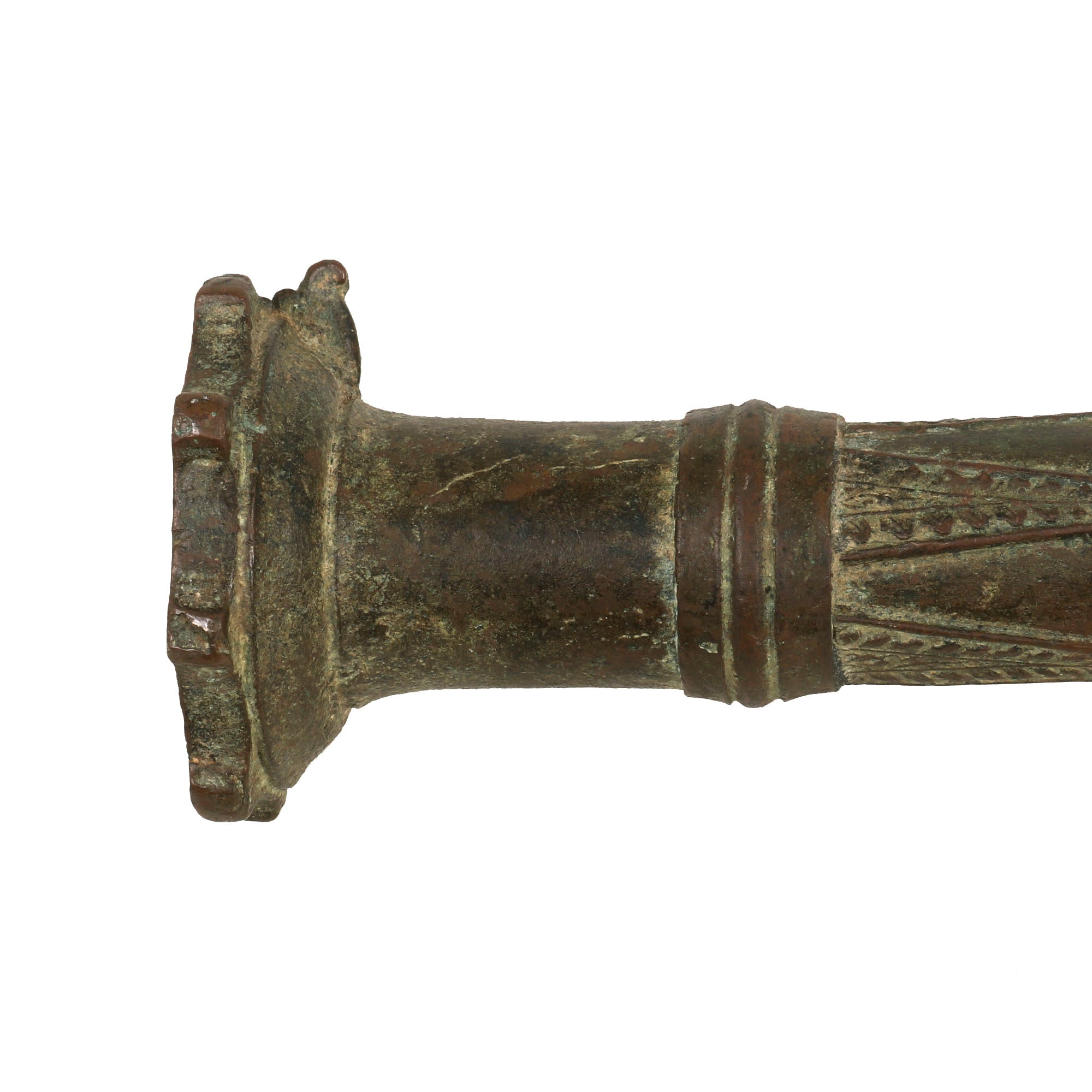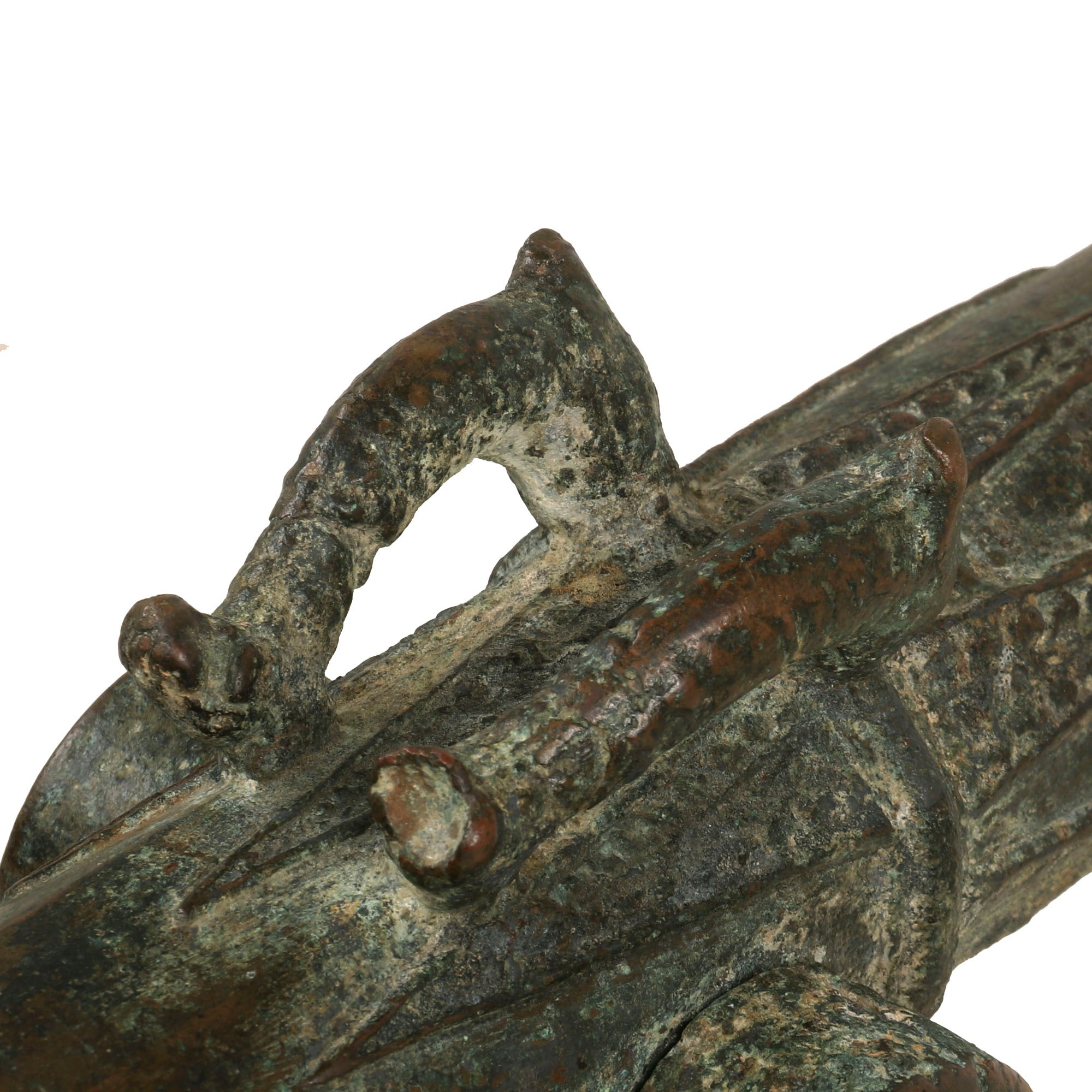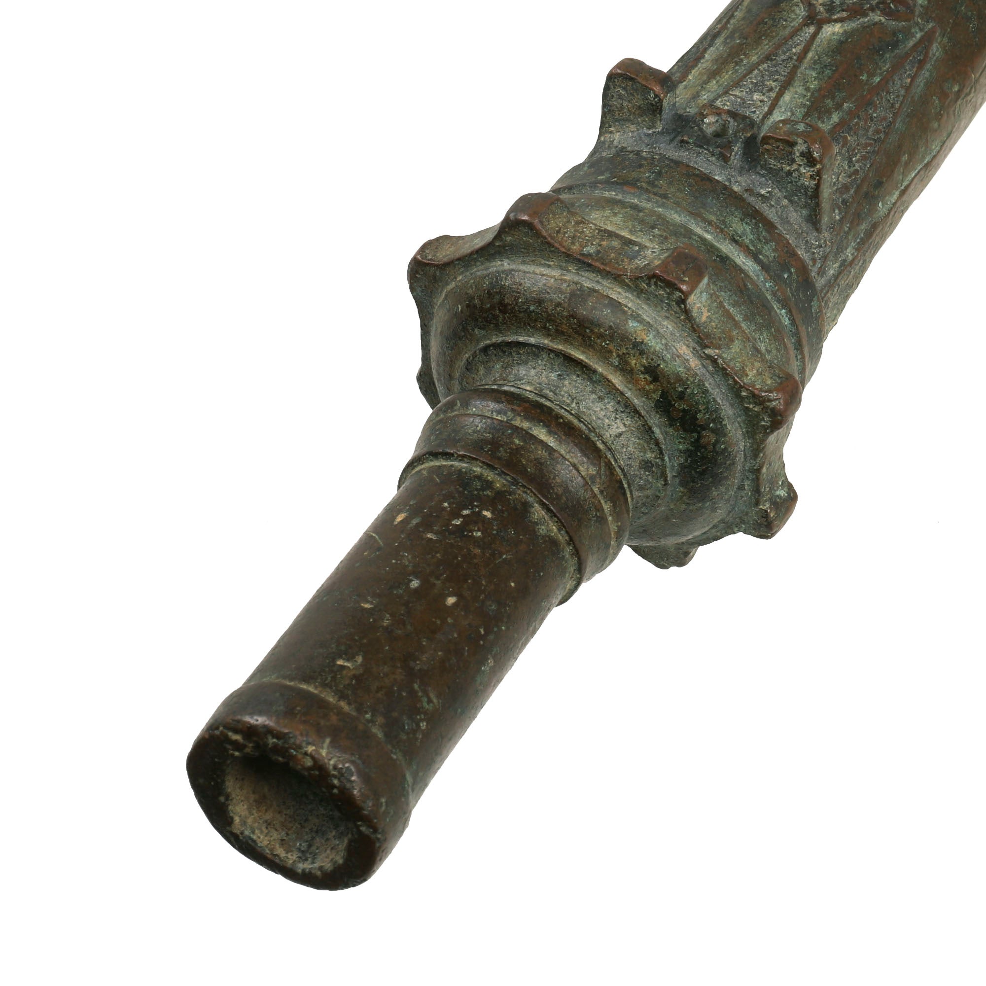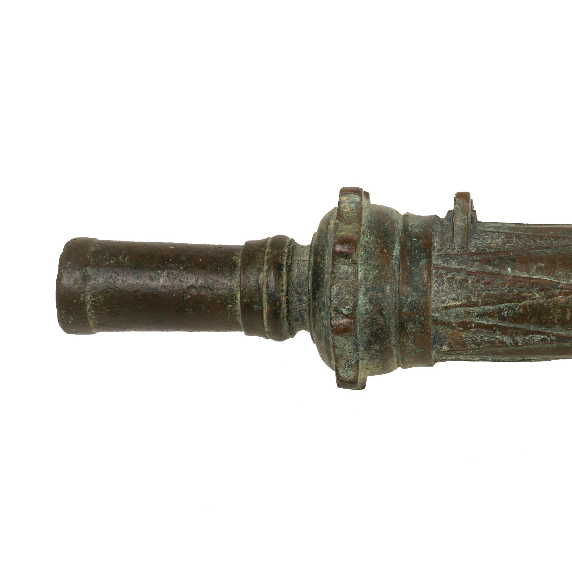 Our example measures 33 ¾" in length and has a 1 ⅛" bore, built to traditional lines it has a muzzle flared out to 3 ¾". Bearing much cast in decoration, the cannon comes complete with an integral swivel mount for use at sea or land fortification. It also has two lovely dolphin ornaments on top. much like those seen on European cannon of the era. These originally had a wooden handle on the end, however as with most it is missing, and only the socket remains.