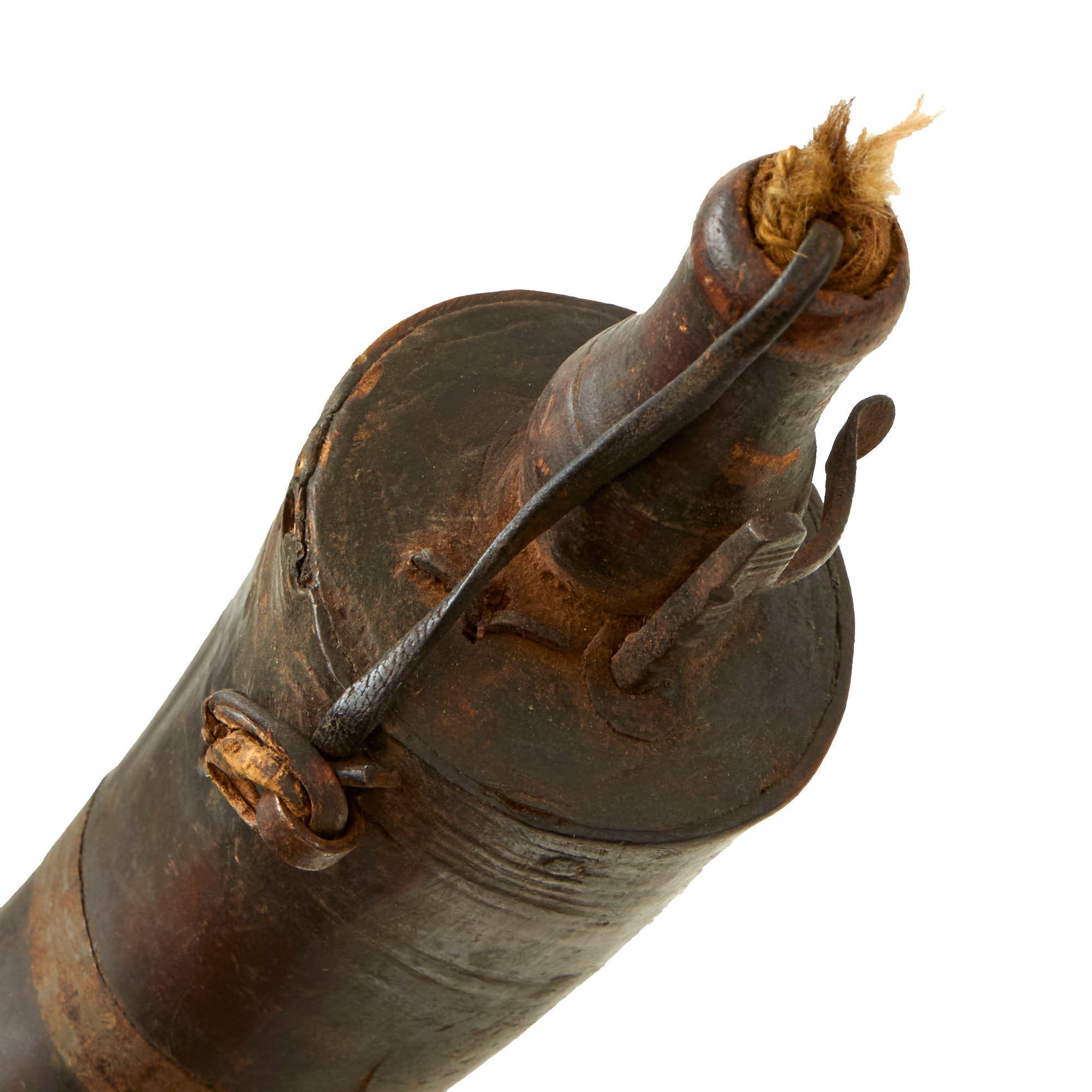 The powder horn measures roughly 20 1/2 inches long around the outer curve, or 12 3/4 inches straight across, and is is fit with a combination of brass, copper and iron. It definitely looks to have had some possible repairs and modifications over its many years of existence. It has two small metal rings for a shoulder strap, and unlike most we see, this horn is set up with a spout at the larger end, built into the wooden plug. This still has a stopper in it, but more importantly, there is also a lever attached to a cutoff on the interior, so the flow of powder out of the horn can be controlled. This is definitely not something we typically see on powder horns from this era, and is definitely a point of interest!