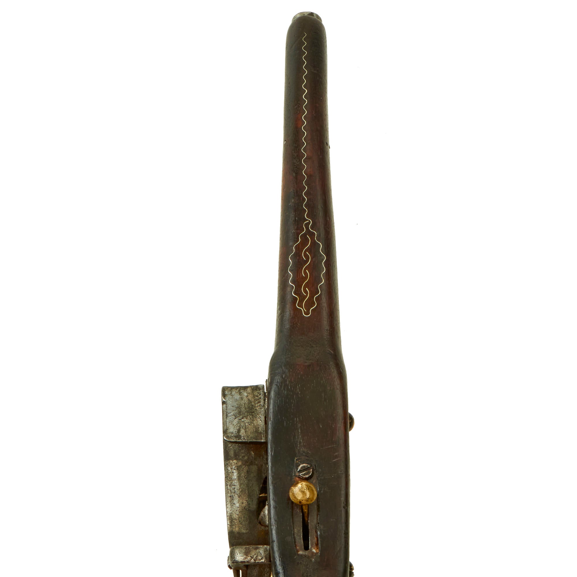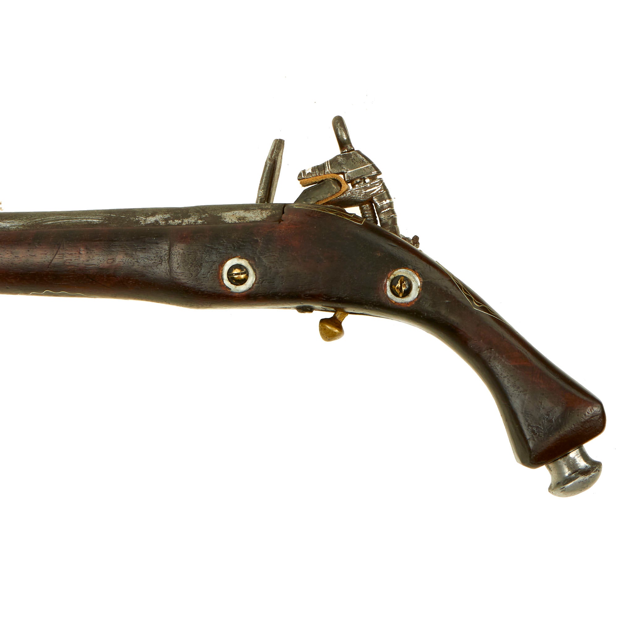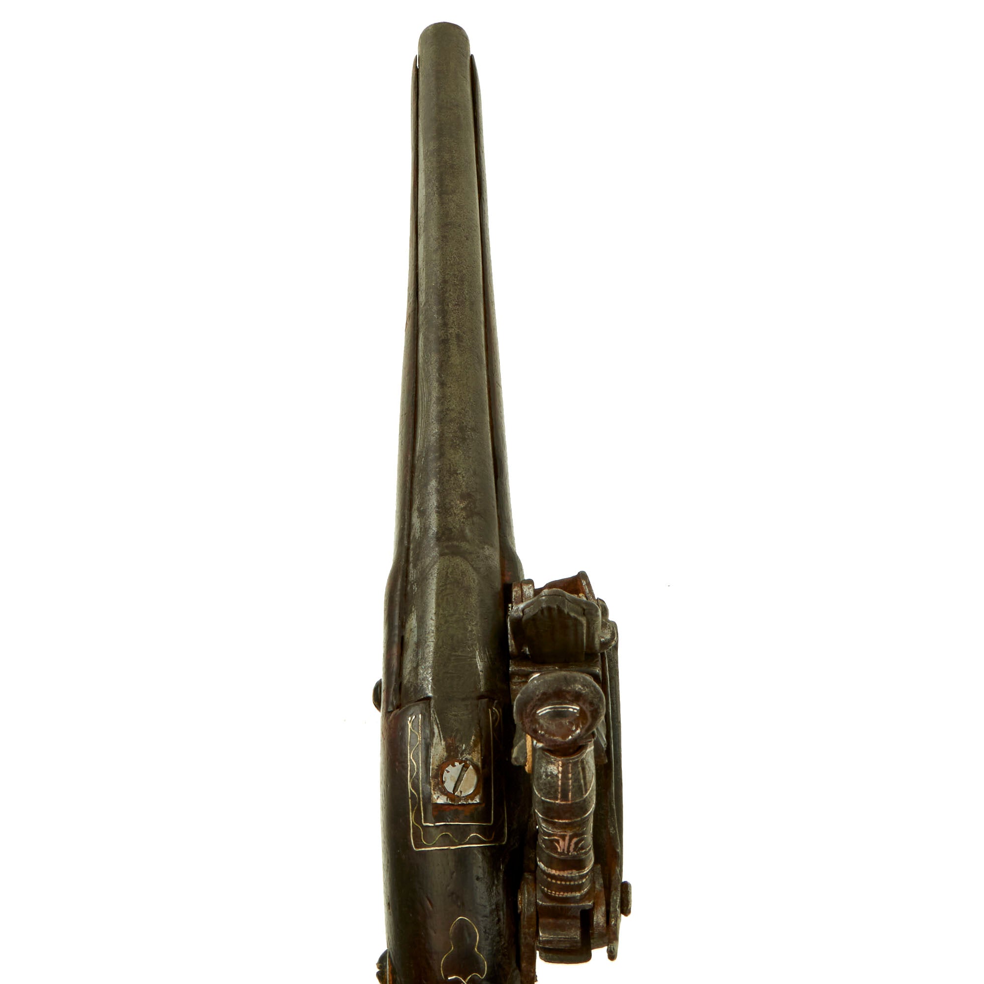Original Item: Only One Available. This is a very nice OTTOMAN Empire Turkish miquelet flintlock pistol, most likely made circa 1850. The lock definitely appears to pre-date that, probably originating from the mid 1700s, and probably from a musket based on the size. The pistol definitely has some interesting characteristics that we don't usually see, such as the rectangular bottom of the butt, as well as the white metal stud attached to it.