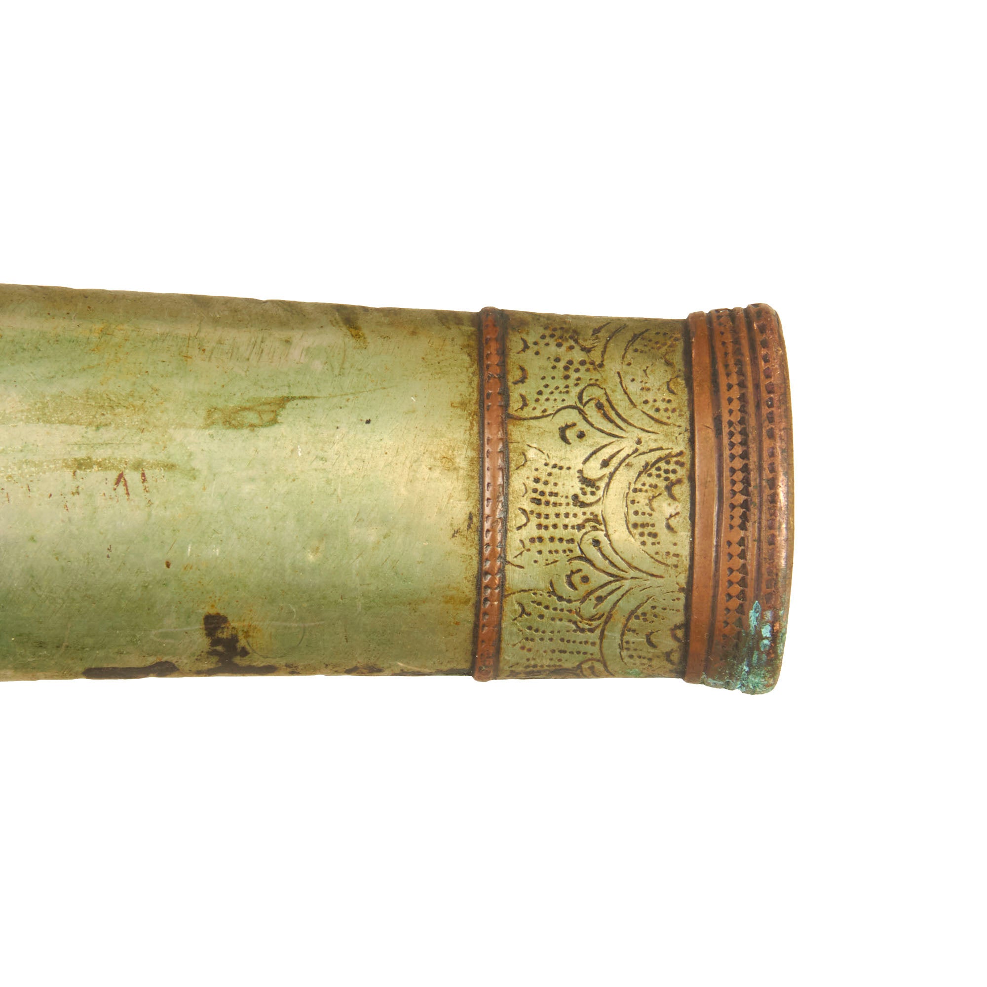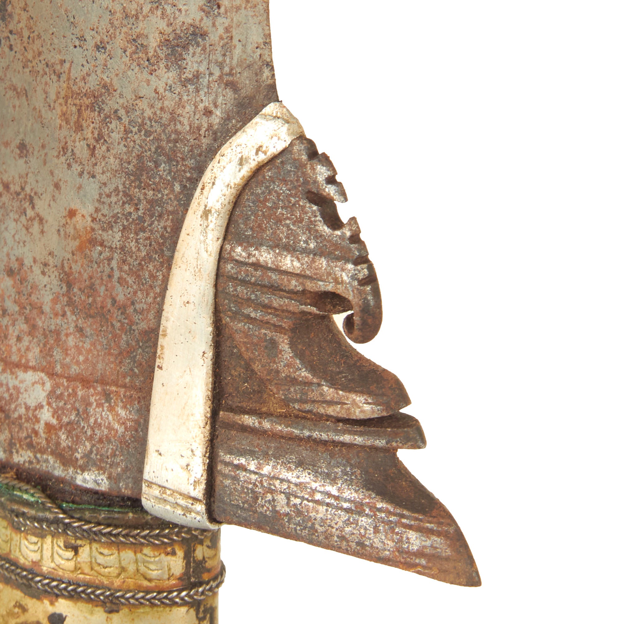 It comes contained in the original wood scabbard, made from two pieces of wood held together by but sheet nickel fittings at the top, middle, and bottom, which also has some copper bands and embossed designs. The top of the scabbard is a separate piece of wood, called the sampir, which protects the crossguard of the blade. It fits it like a glove on this lovely example. The scabbard is really lovely, with the only issue being the crack and missing portion near the middle band.