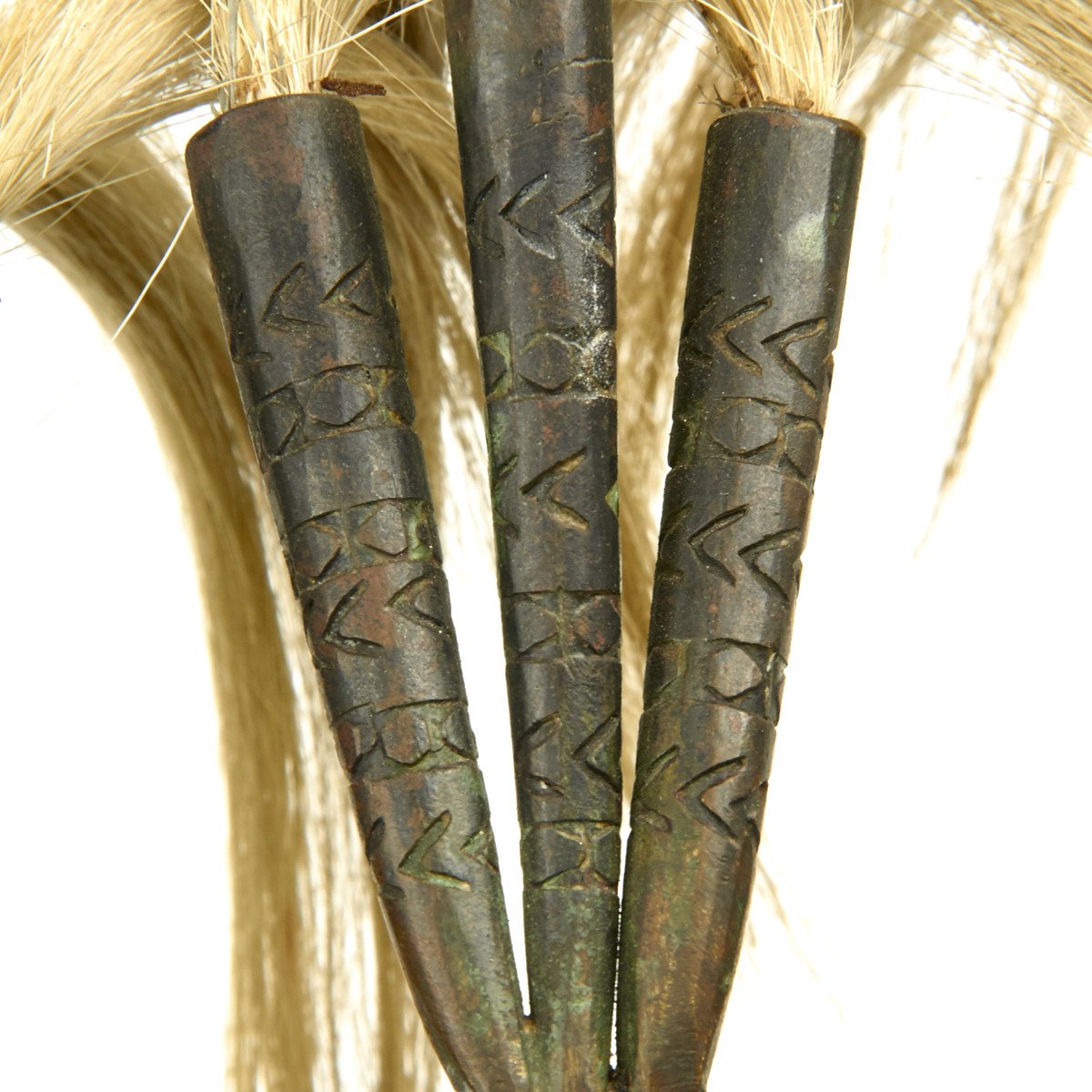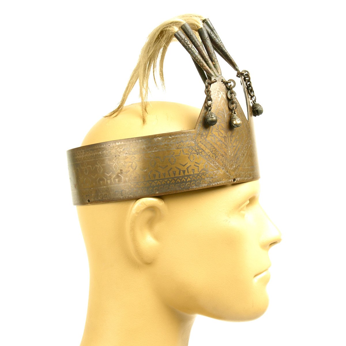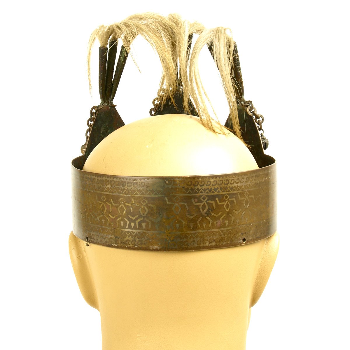 Our headdress is made of hand beaten brass profusely inlaid with silver of substantial construction consisting of a wide two inch band surrounding the head with three 4.5 peaks to the front like teeth each topped with a flute from which spouts tufts of, apparently, human hair.