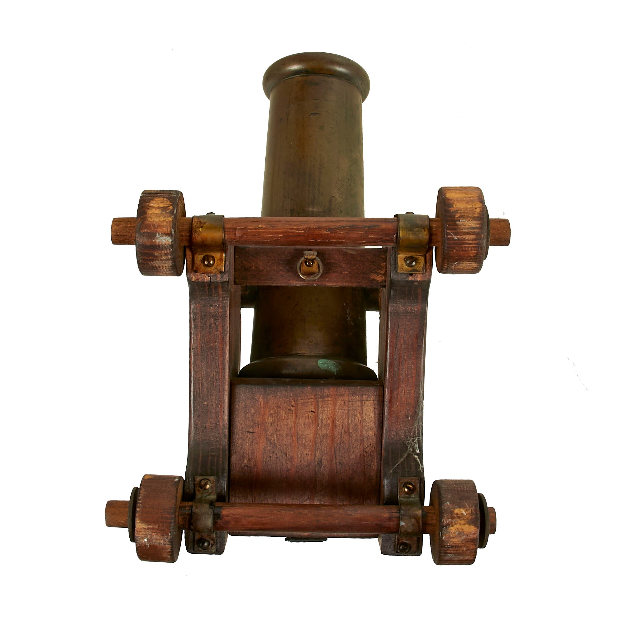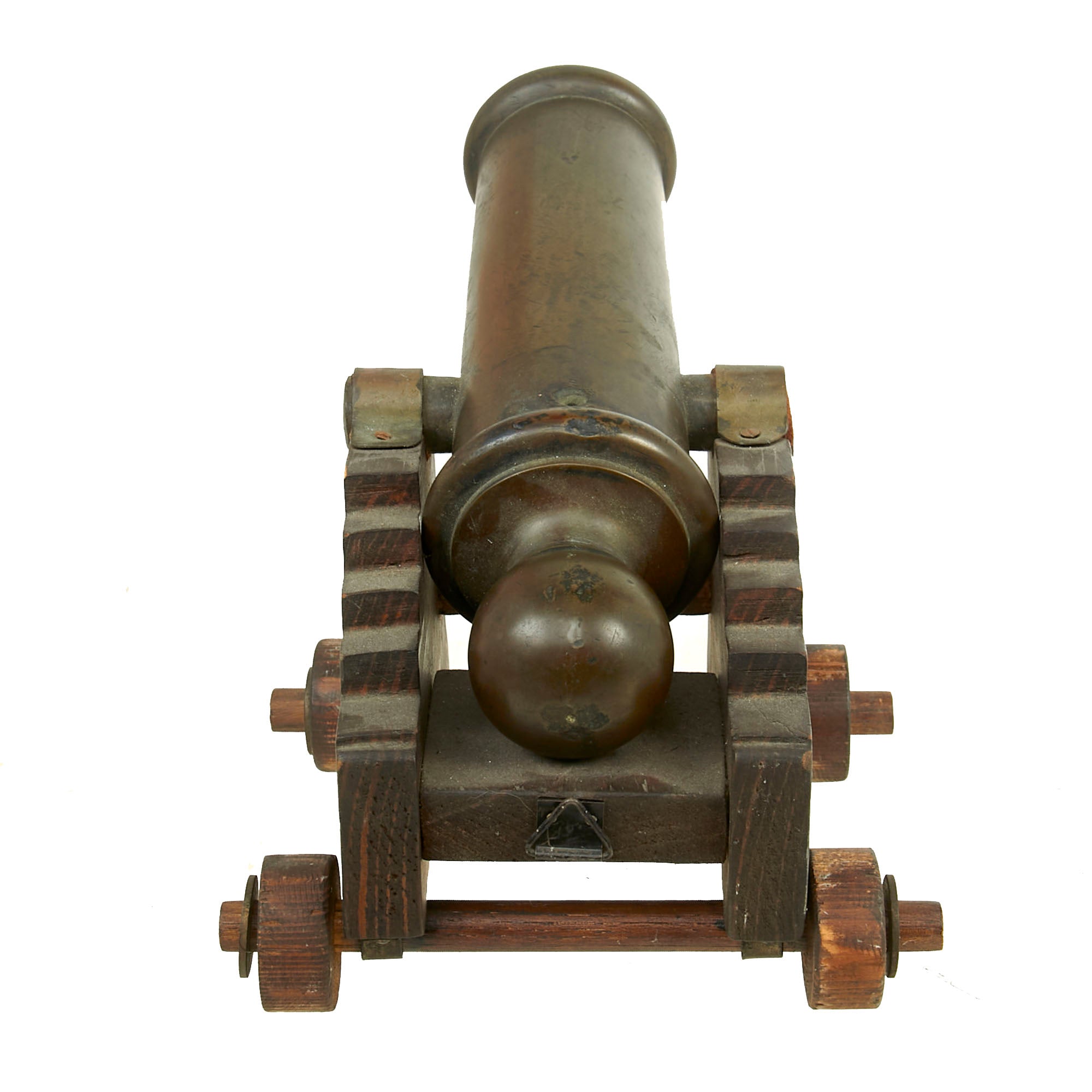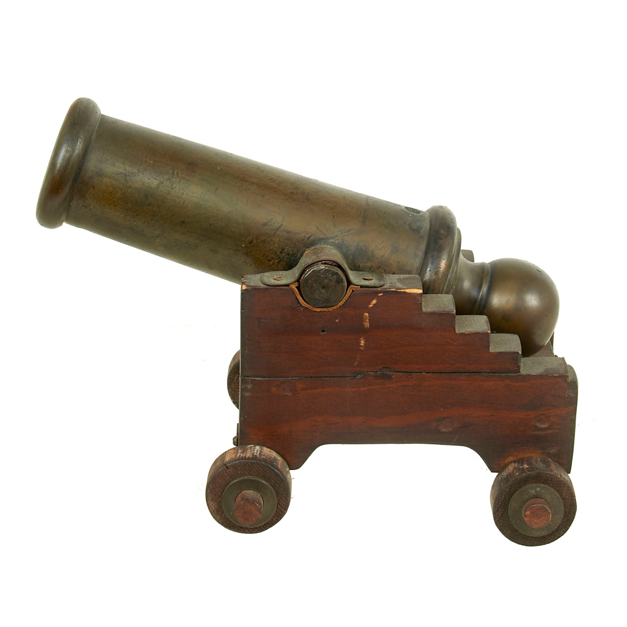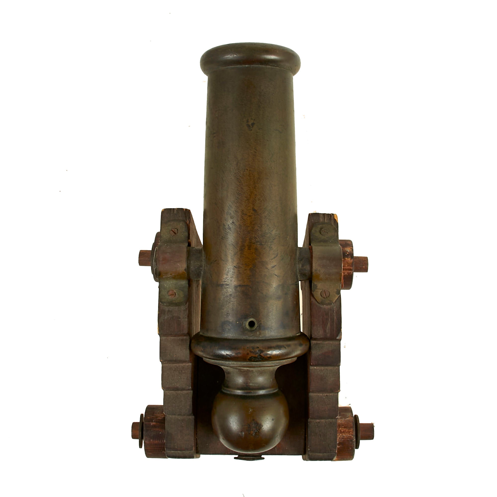 There are no markings on the cannon, so it was most likely custom made at some foundry during the late 19th century. At present there is no range or elevation control, and the cannon barrel itself does not have anywhere one might be fitted. The carriage was built specifically for display. The carriage measures 6½ x 5 x 7”.