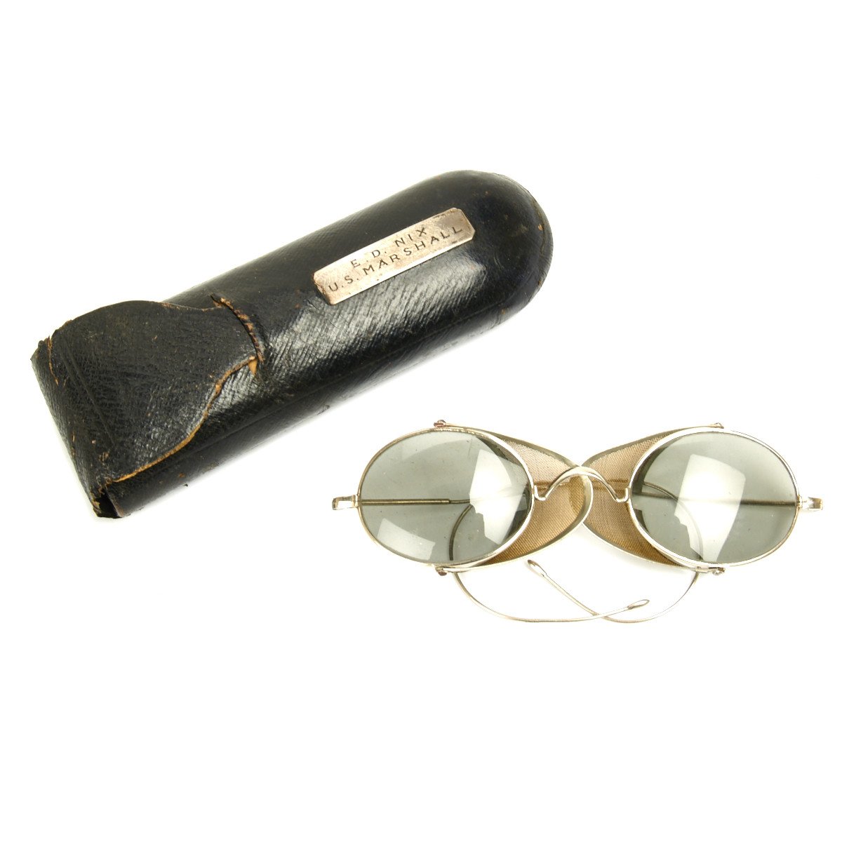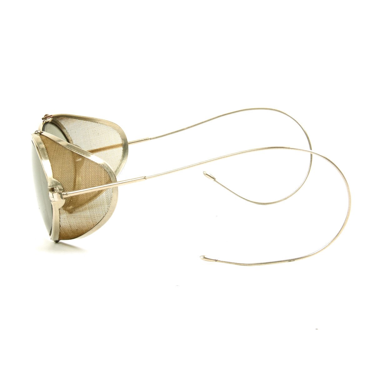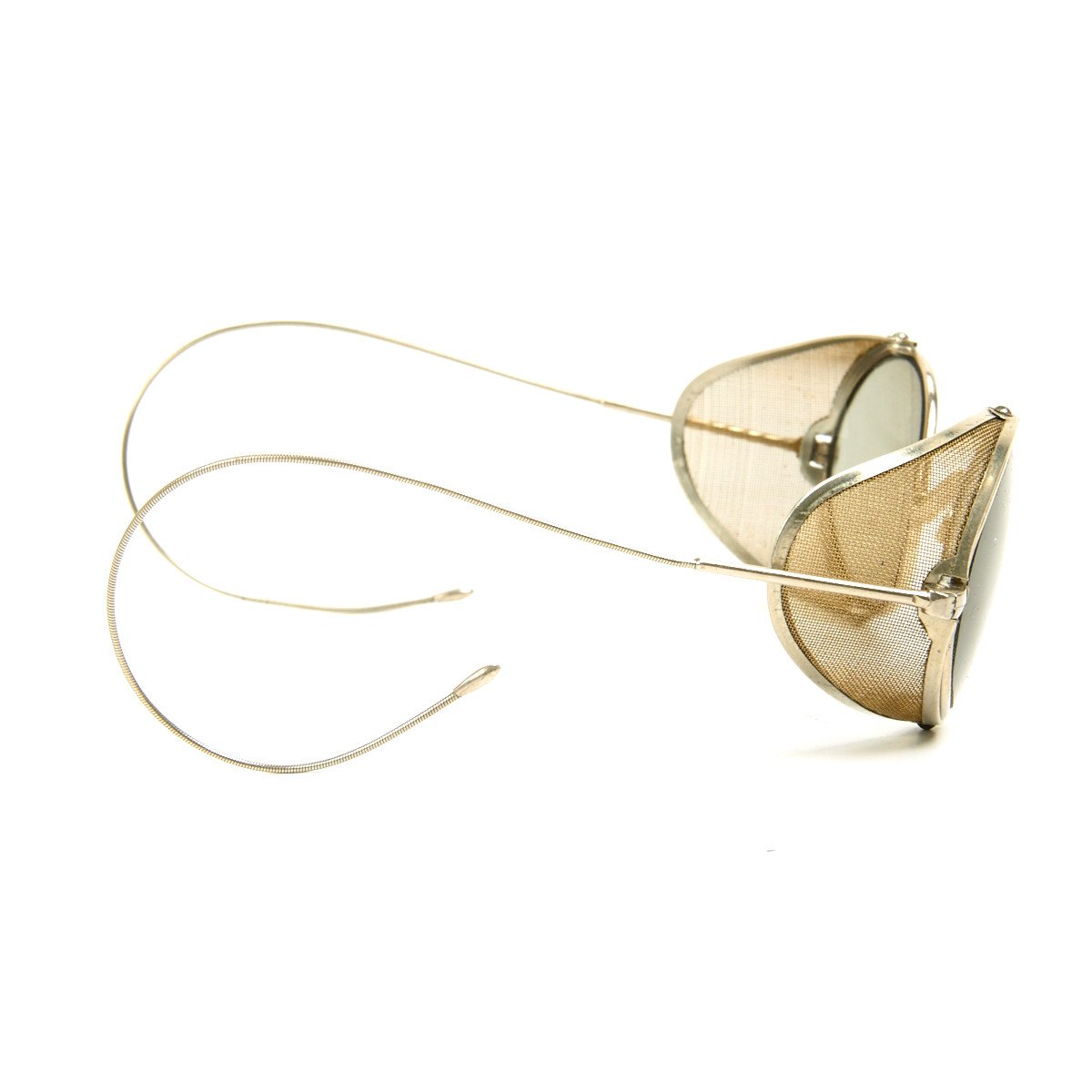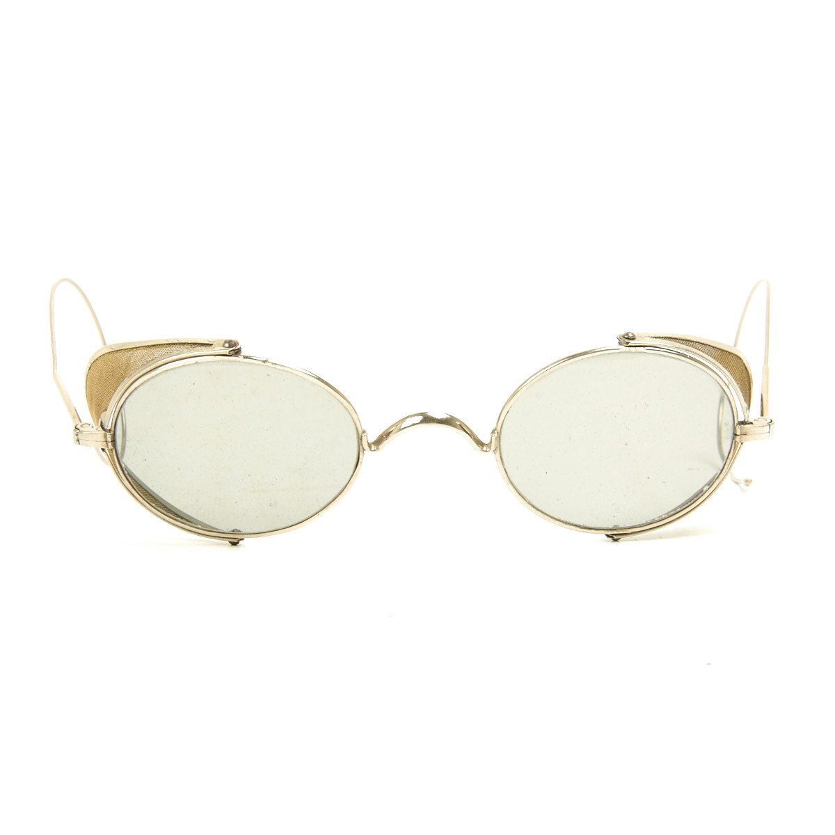 of eyeglasses from the late 1800s. Complete with steel net side shields the lenses are slightly tinted and have typical wire wrap around ear pieces.