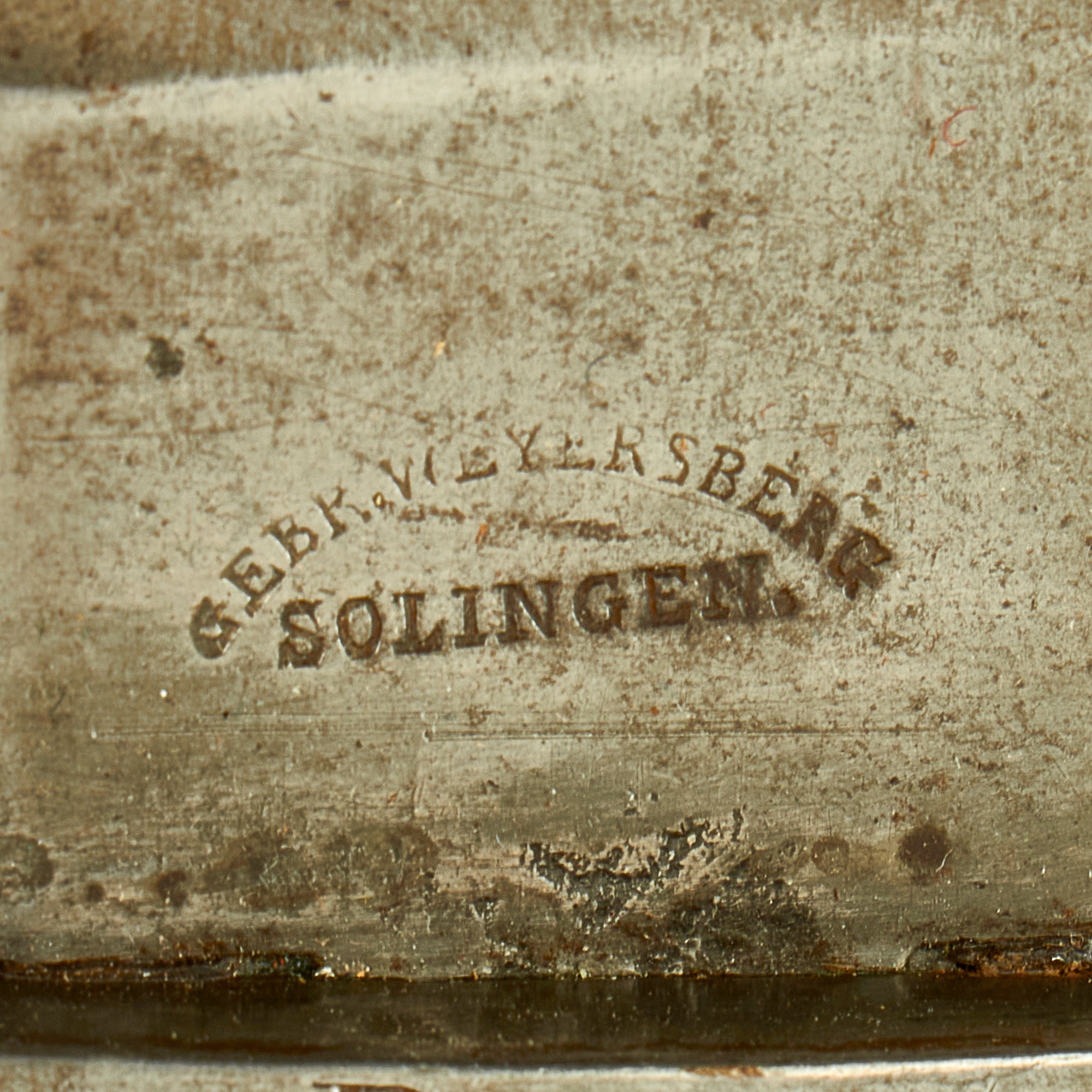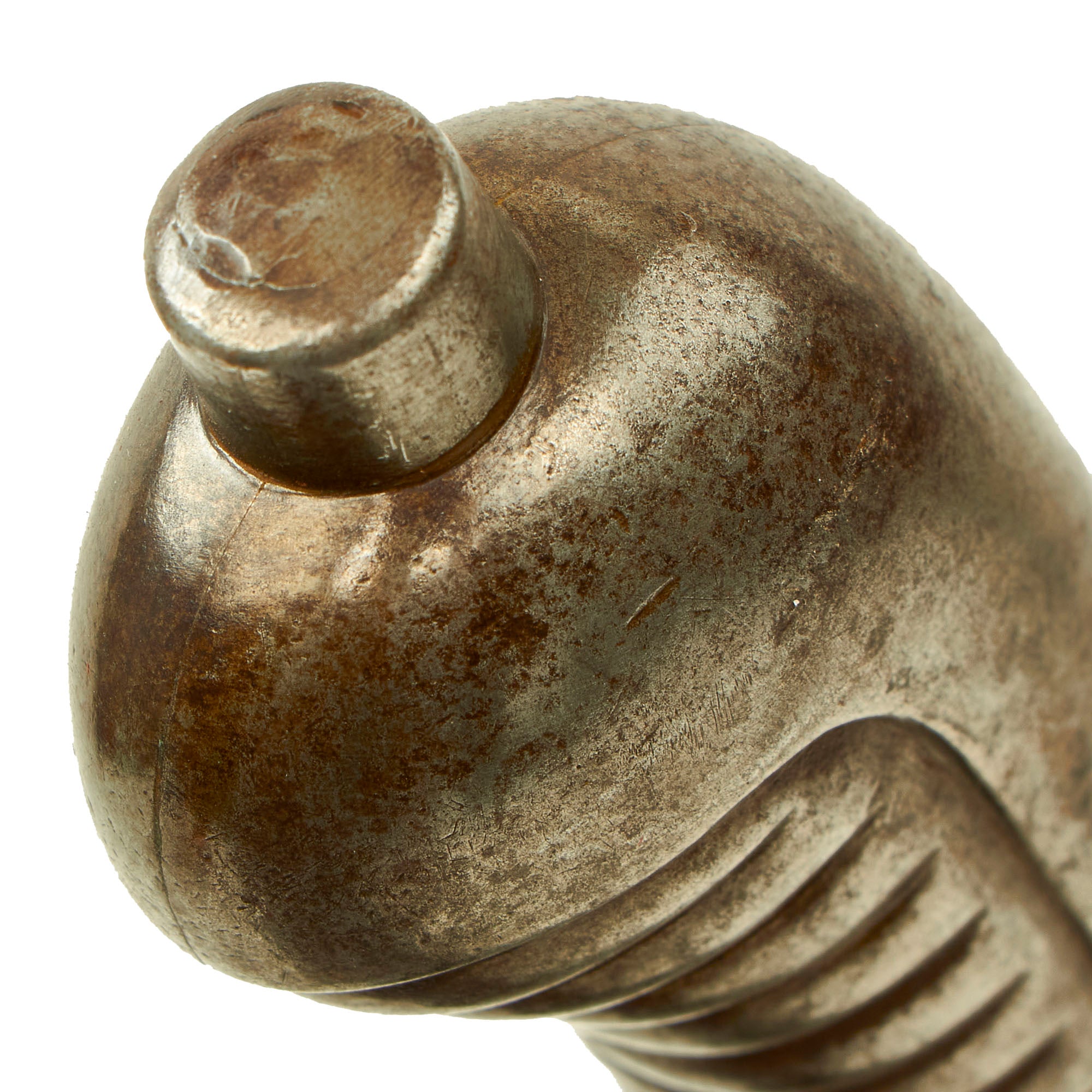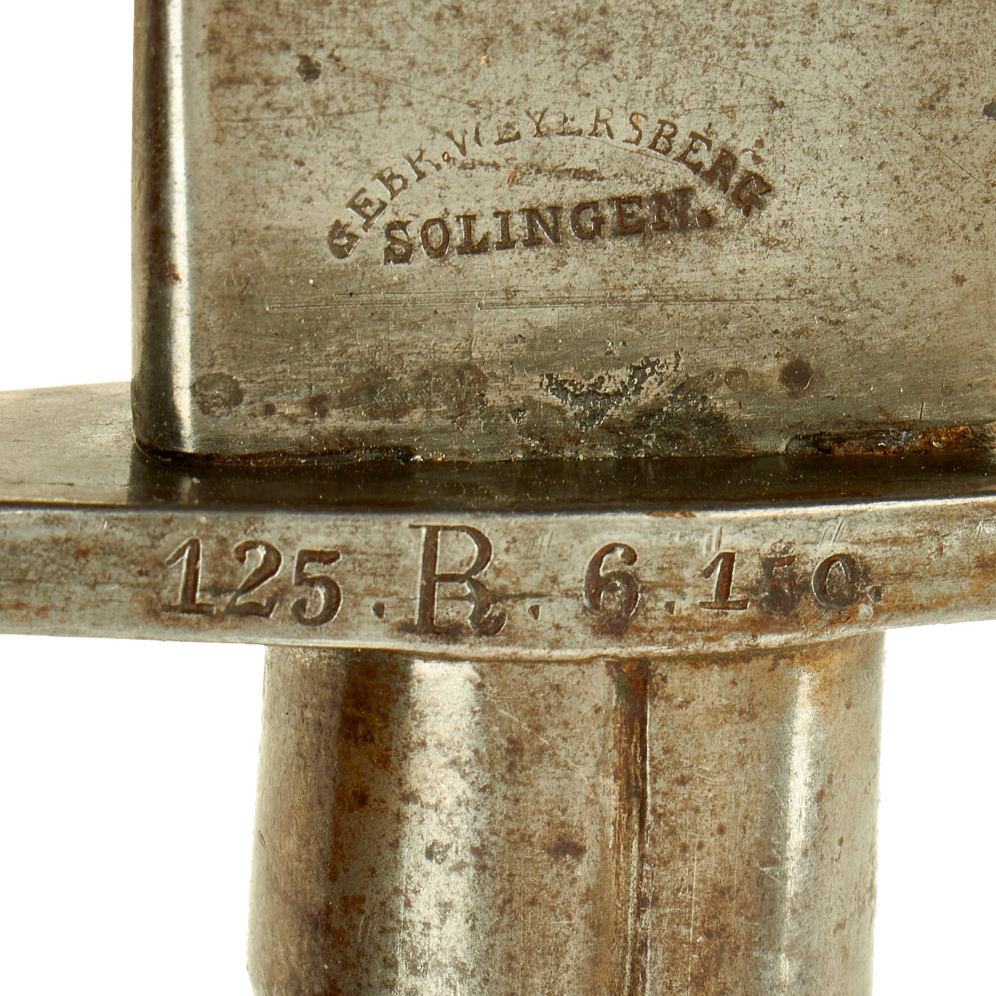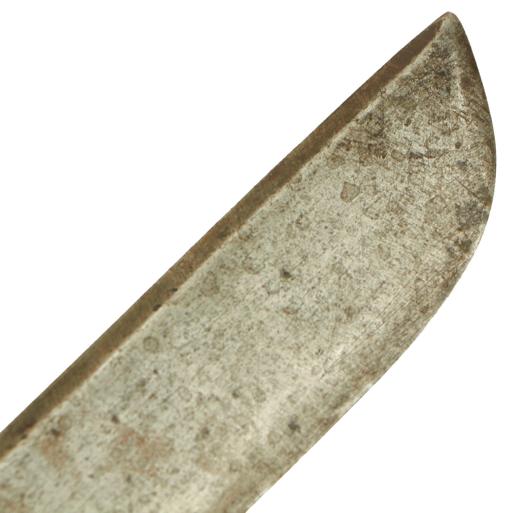 Condition is very good, especially considering the age. The blade has some areas of light staining, as well as a few edge dents, but is still quite sound. The steel fitted leather scabbard is solid, with intact stitching, and even still has the "button" on the bottom, which is usually lost.