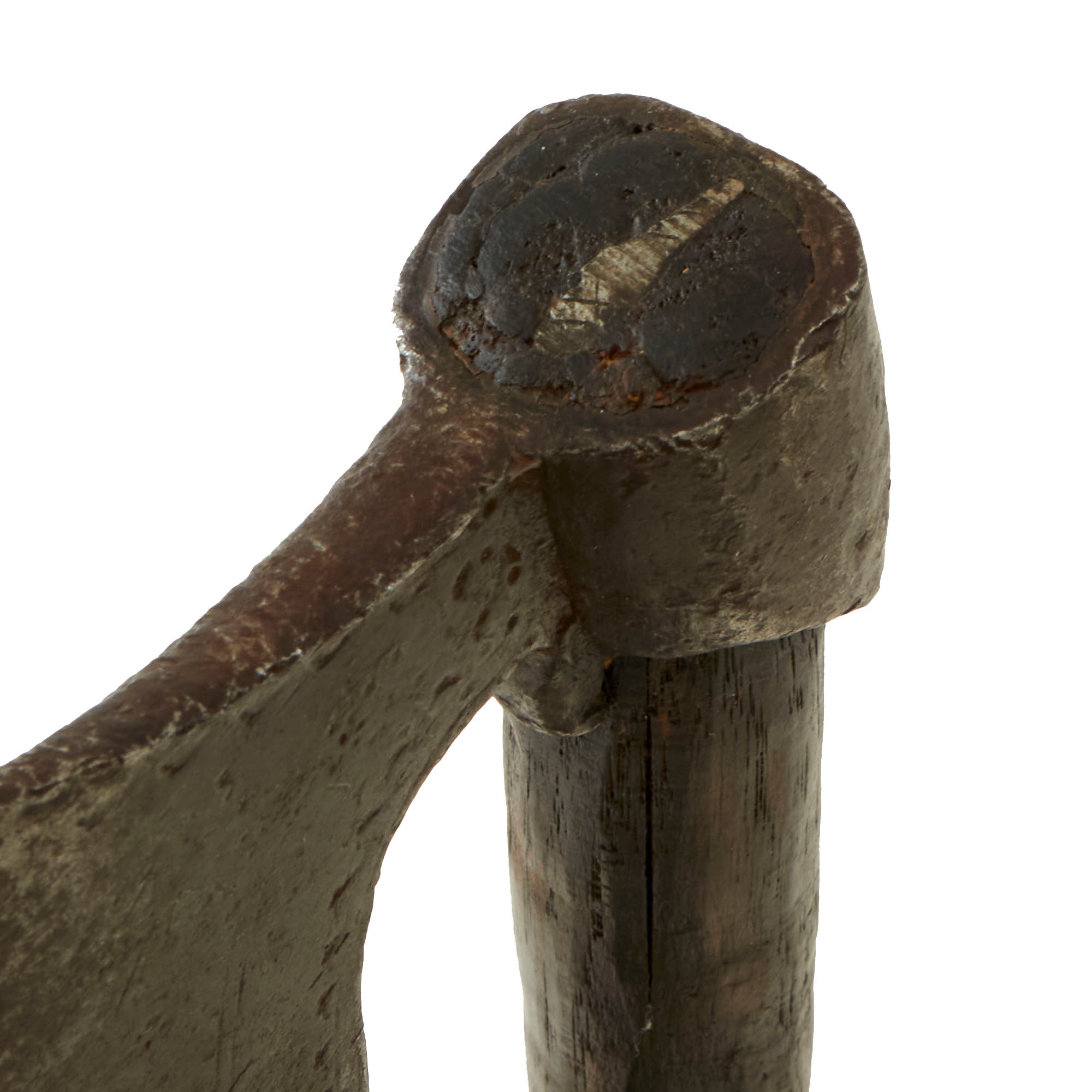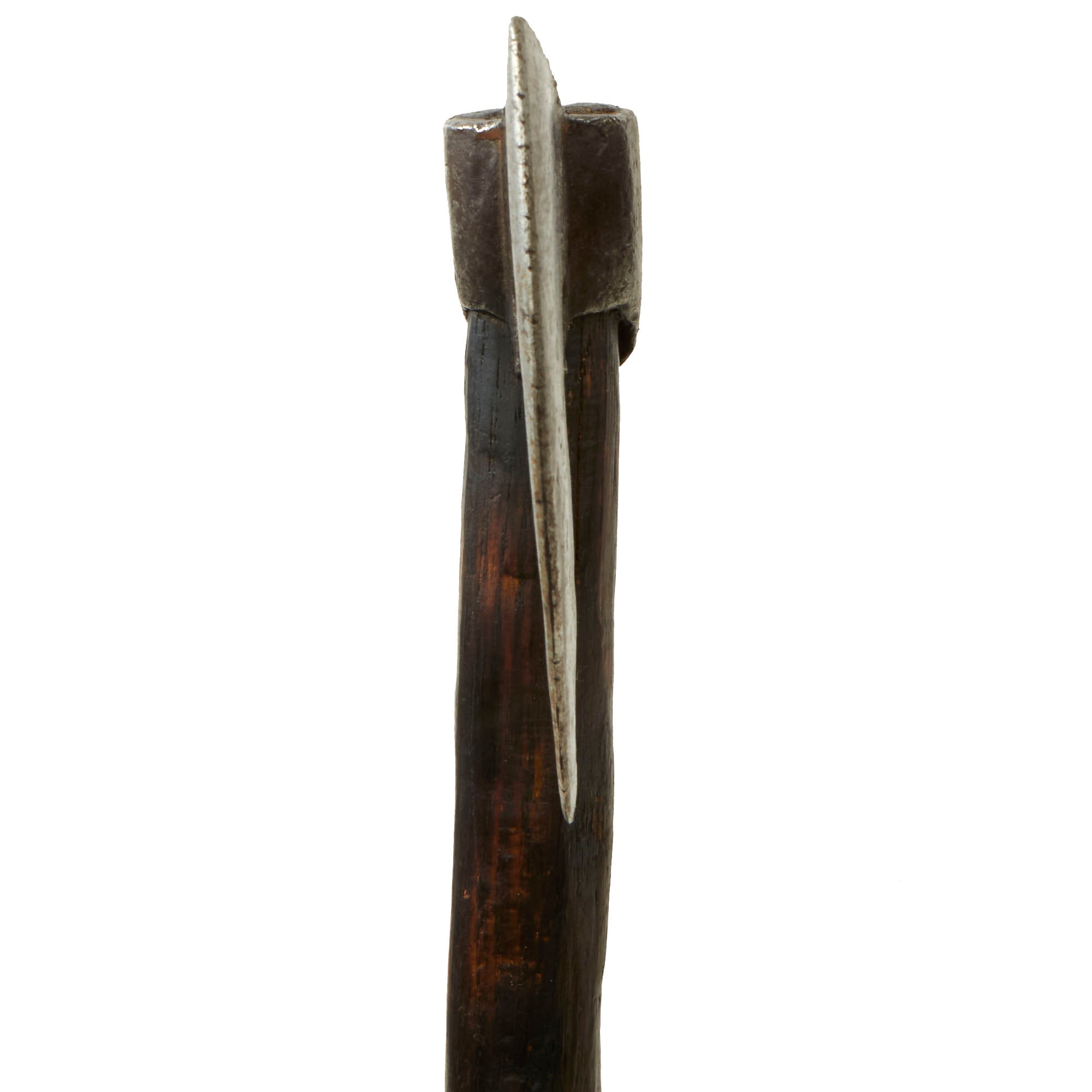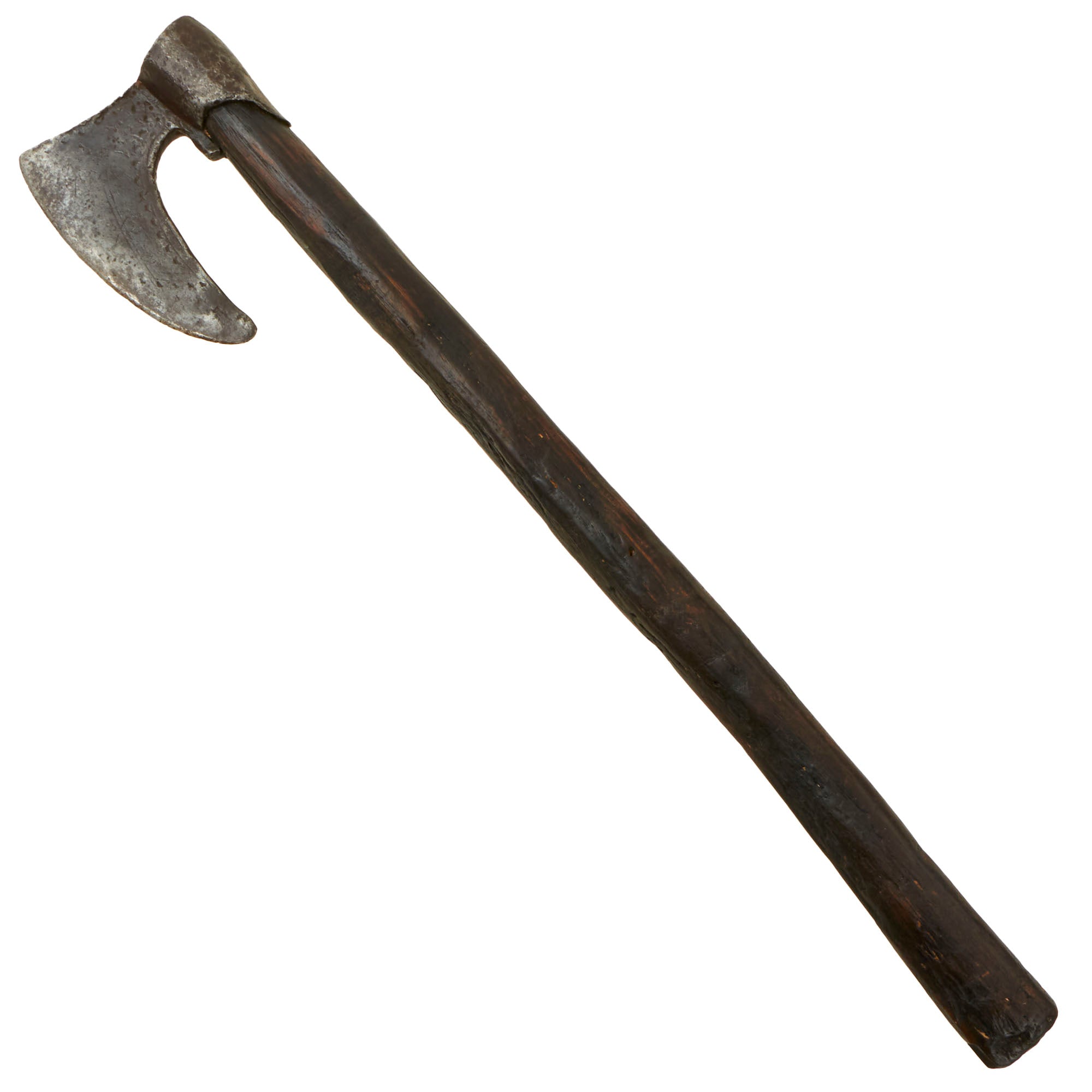 This is an outstanding example of a 9th-10th Century Bearded Battle axe with a shaft that is likely not period and an early replacement, as it shows very heavy age & wear with some woodworm holes. The shaft is certainly at least 200+ years old and could be older. The entire ax is about 20½” long with the head measuring 4½” long. The head is in fantastic non-dug condition with some great patterns along the sides. This is truly one of the most well-preserved viking weapons we have offered.