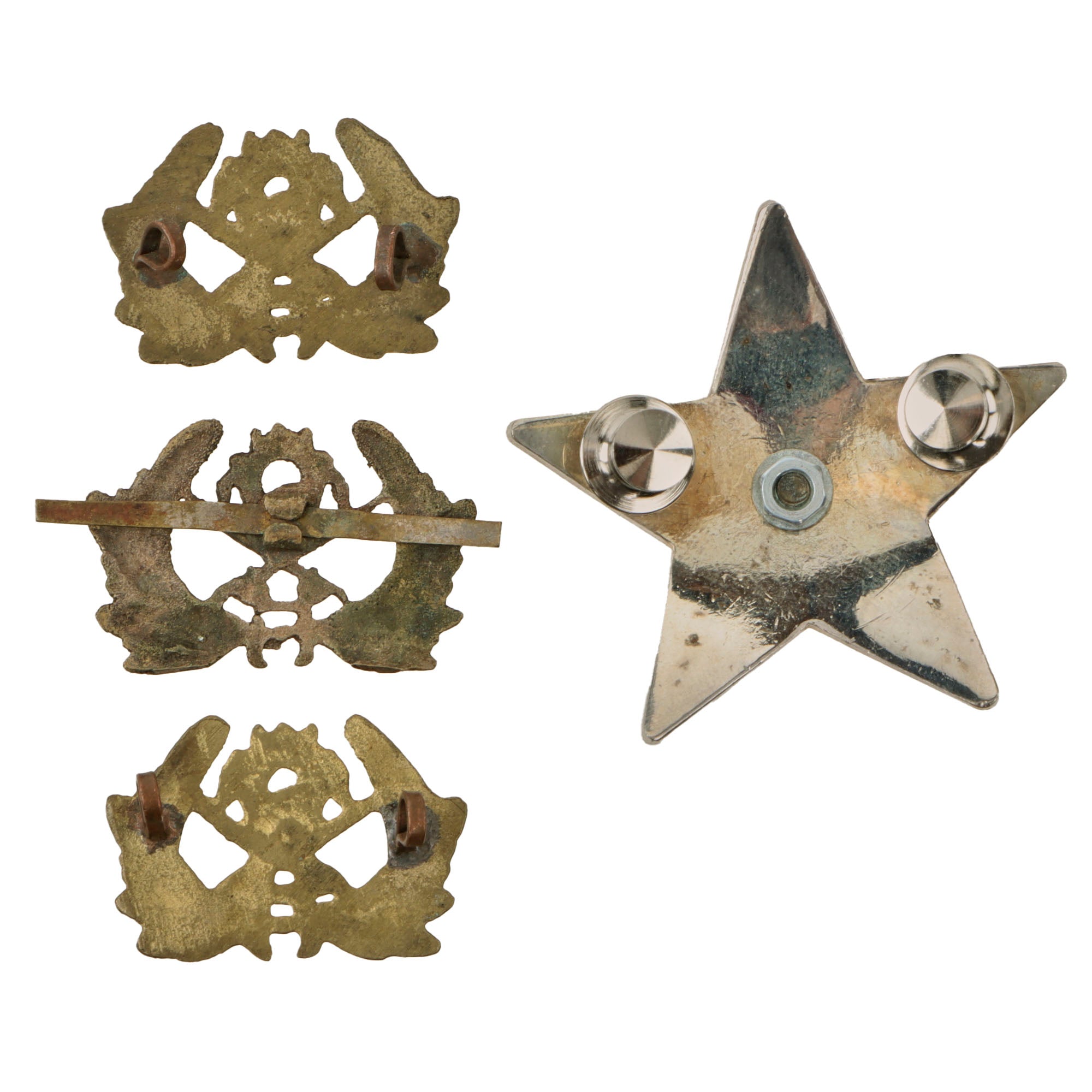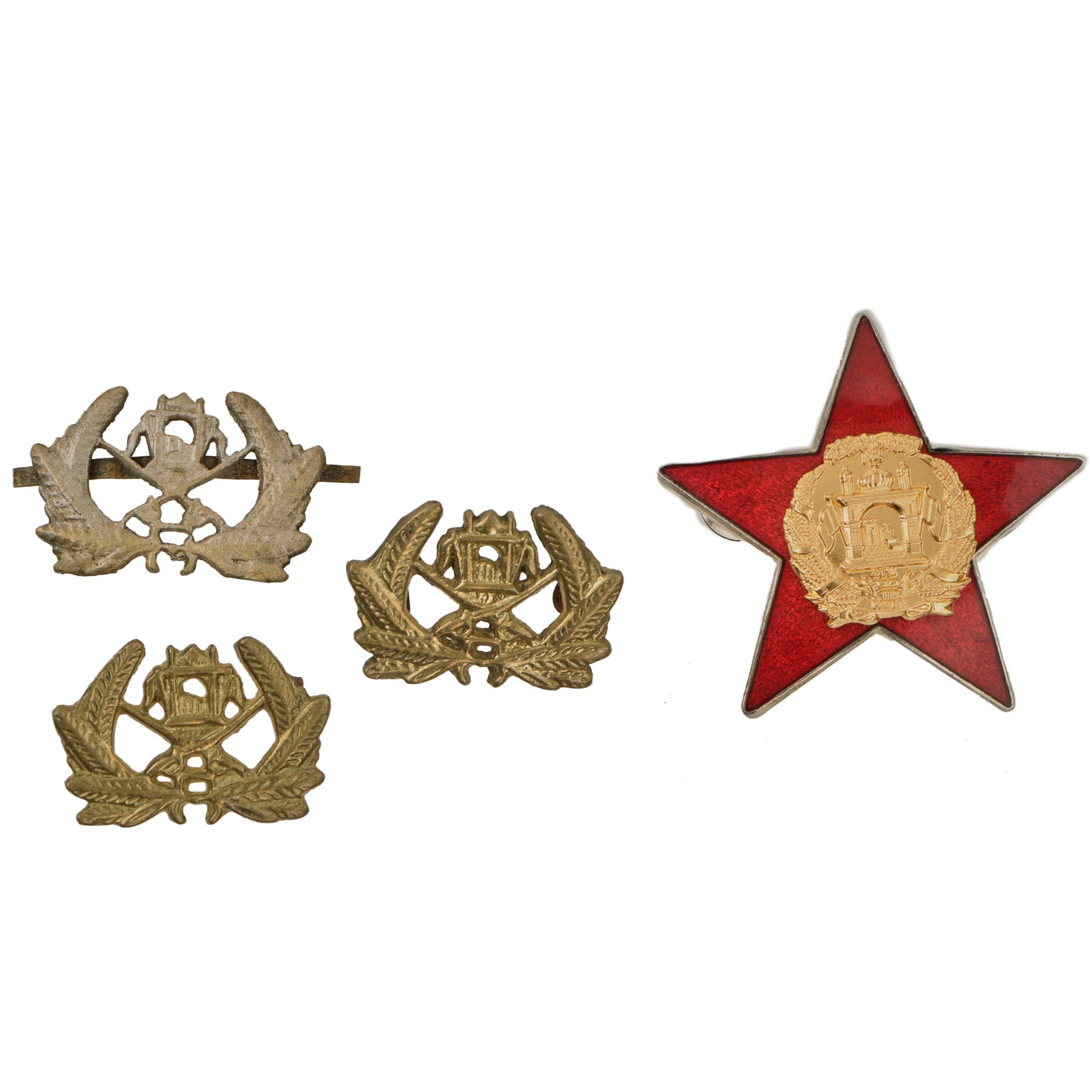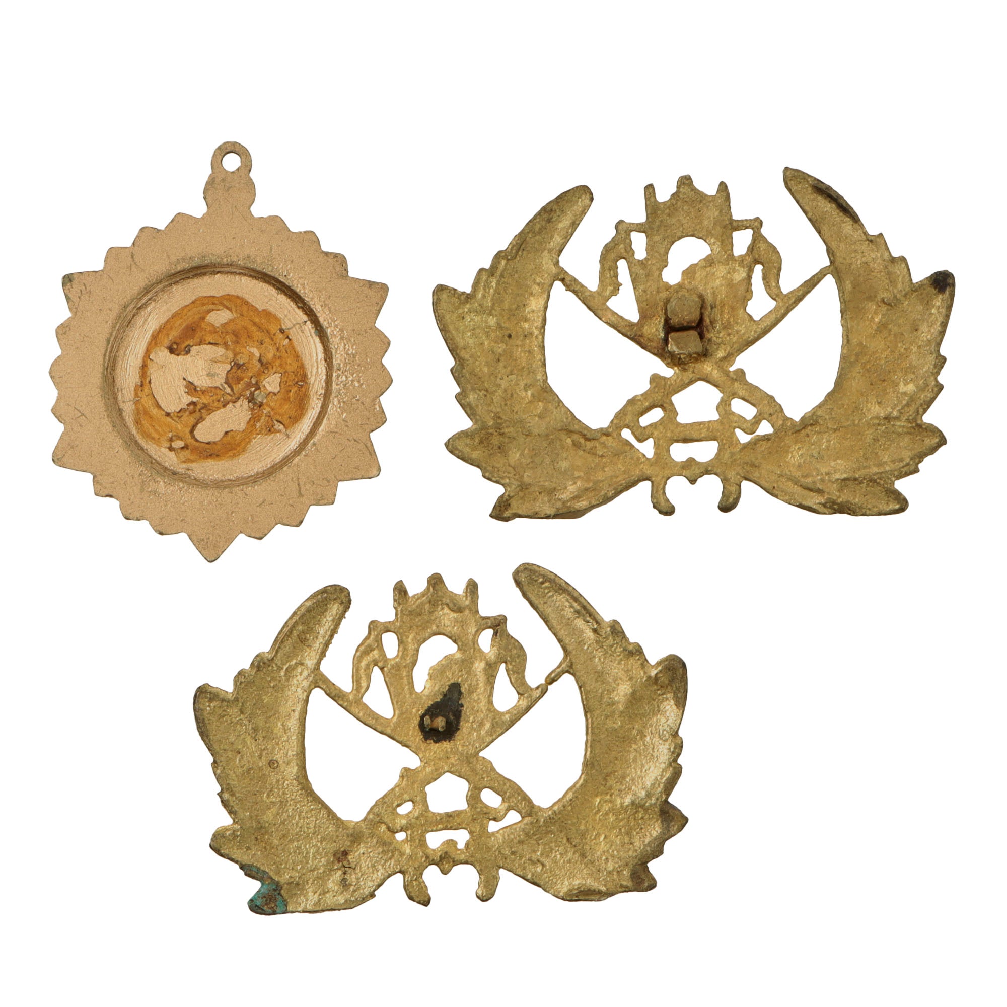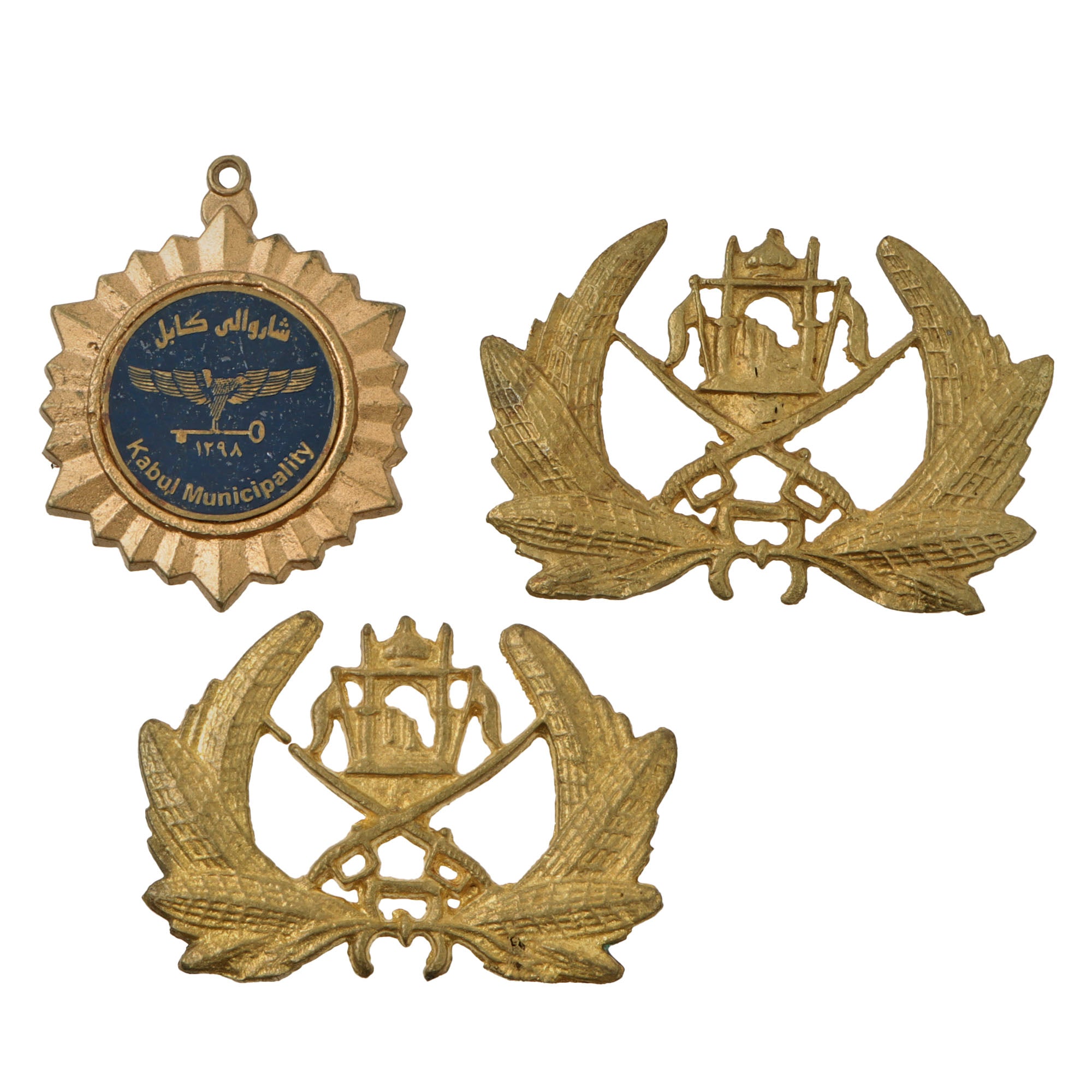 - Afghan Army golden badges, set of two small with loop backs and one small with metal strip back.
