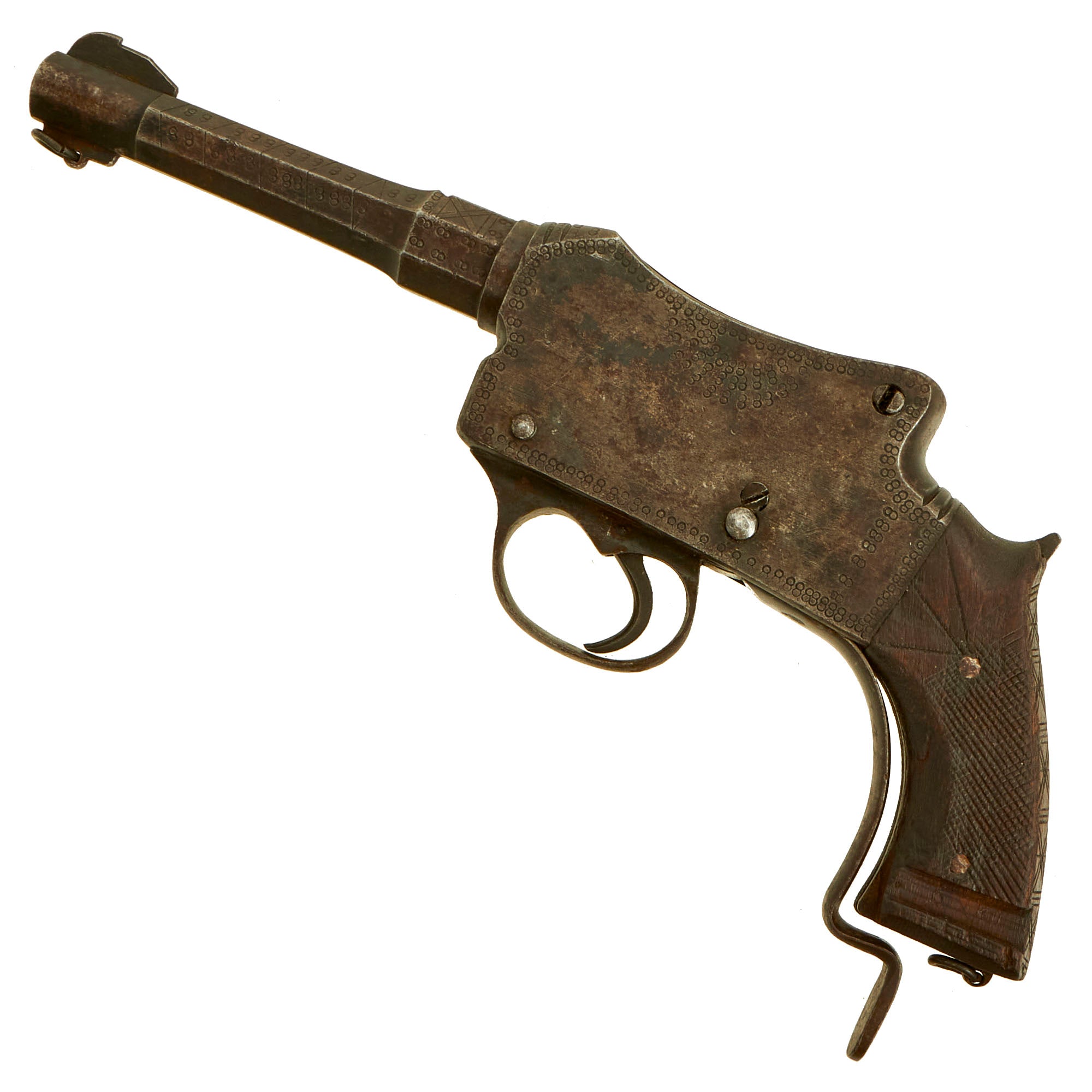 We were not able to find any British or European markings at all, but it is possible that they were removed. The quality of fabrication is actually quite high, however it is definitely NOT A GUN WE WOULD SHOOT, sold for Collection purposes ONLY. The metal used on these is definitely not the same quality as British Steel. Already 125 years old and rated "ANTIQUE". This will make a great wall hanger and conversation piece! Ready to display!