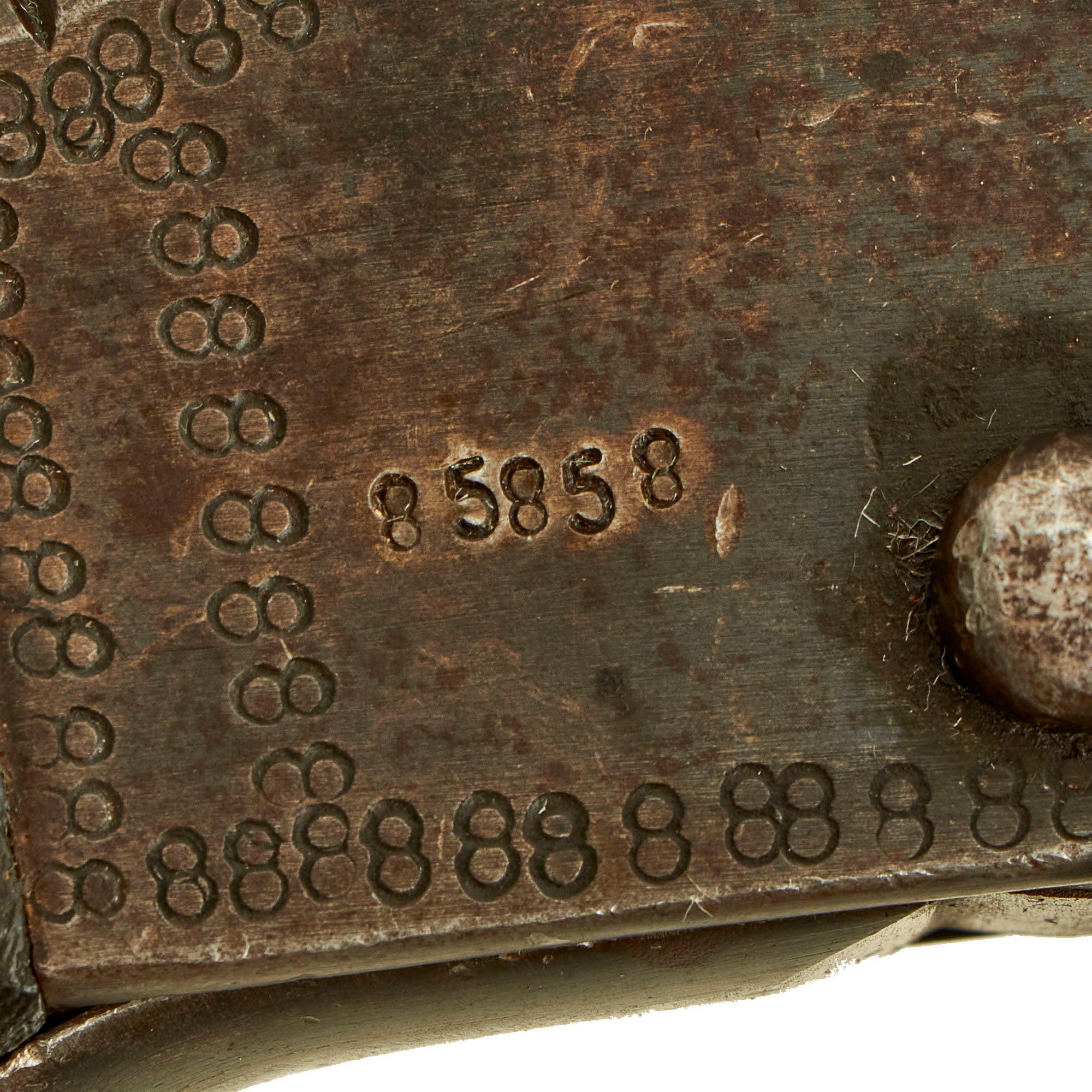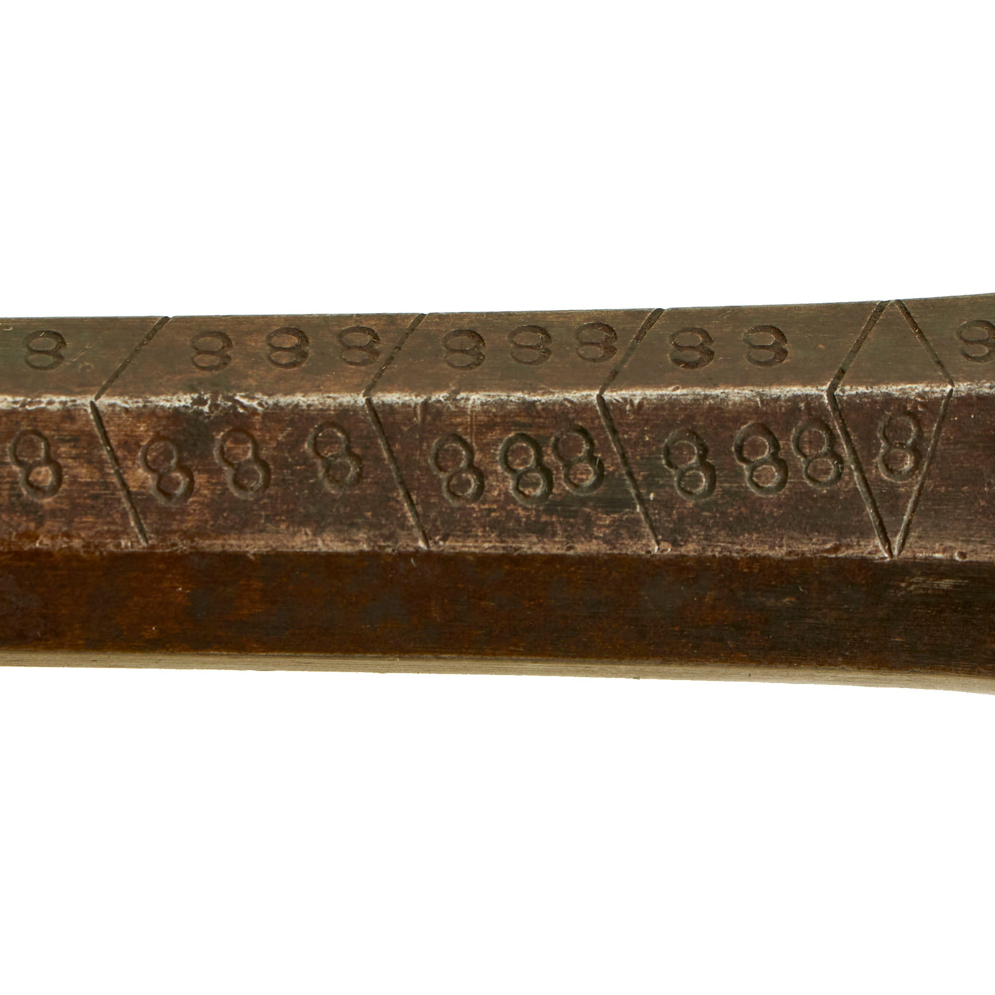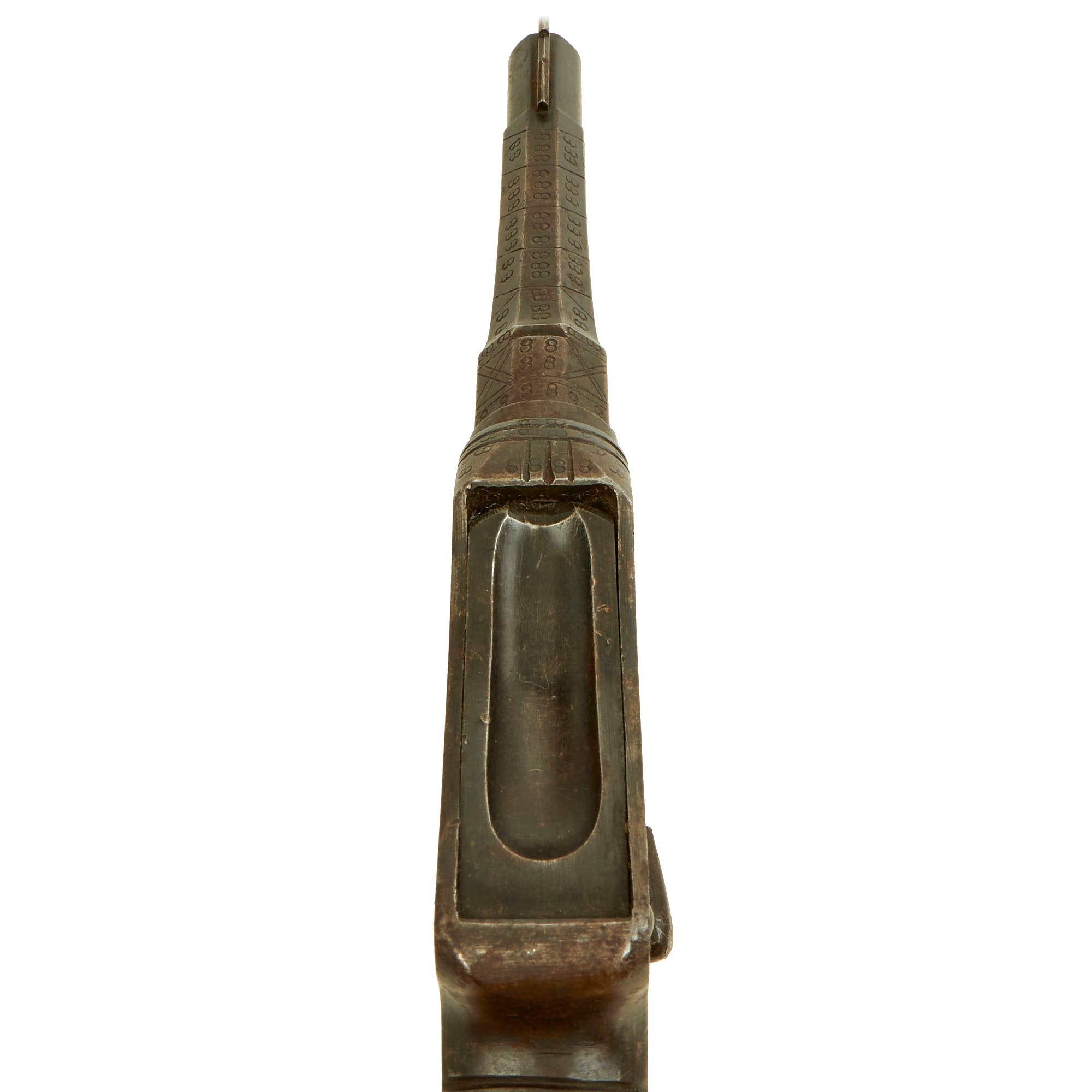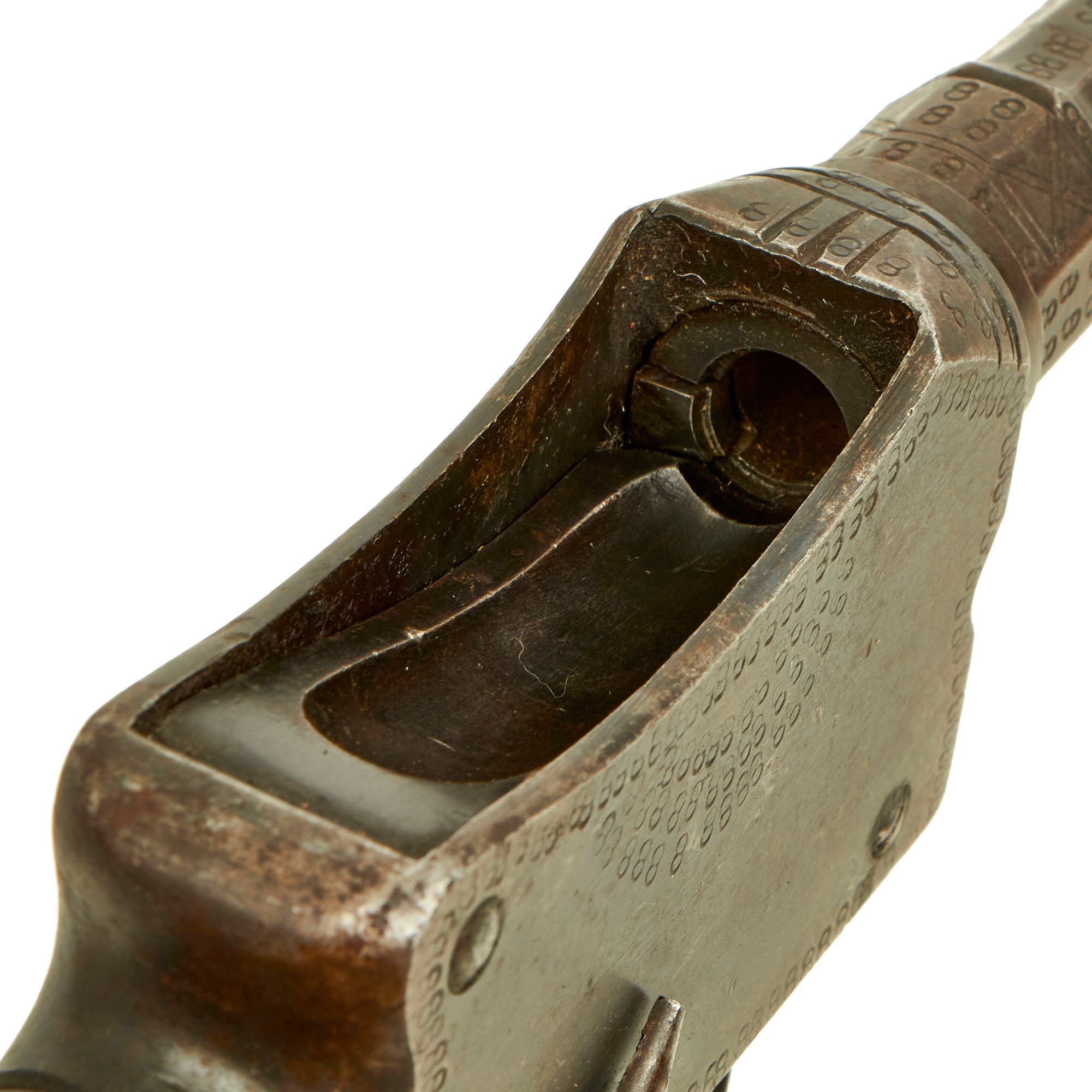 The overall condition is very nice, still retaining some of the original blued finish, and showing much decoration, all done with a number 8 metal stamp. The action does function correctly, with a strong dry fire, and the ejector does function. We checked the bore, and it actually does show rifling, though with the long .303 chamber, the actual rifled section is only about 3 inches long. Definitely not an ideal weapon by ANY stretch of the imagination, but extremely interesting nonetheless.
