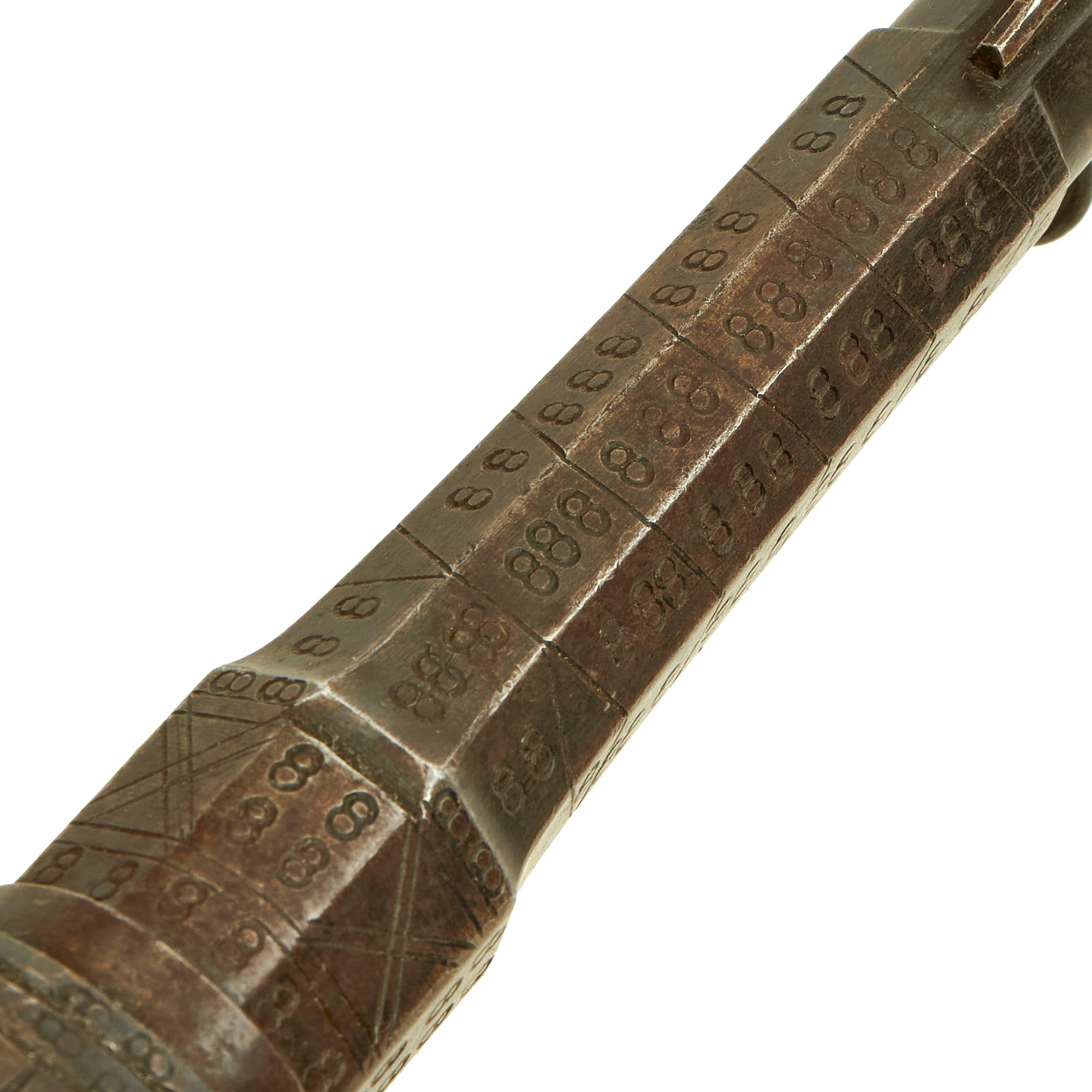 Traditionally the British converted .450/.577 Martini Rifles to .303 caliber, often turning them into carbines at the same time. However in this case, most likely in Northern India by the Khyber Pass, this pistol was constructed using a Martini style action, locally manufactured probably entirely by hand. Occasionally original British and European parts were used when acquired, and we do see a serial number of 85858, on the right side of the action, but we suspect this is a replicated marking.