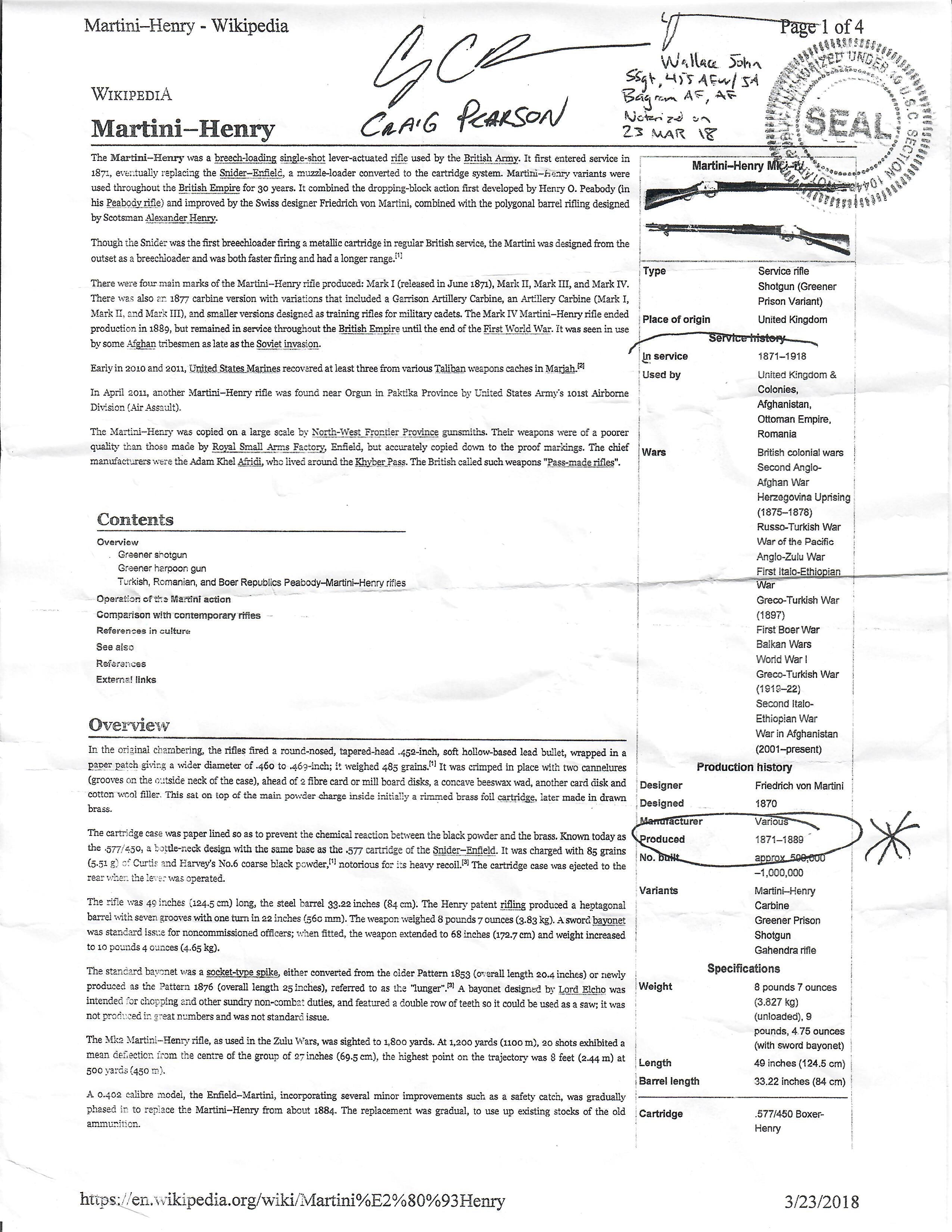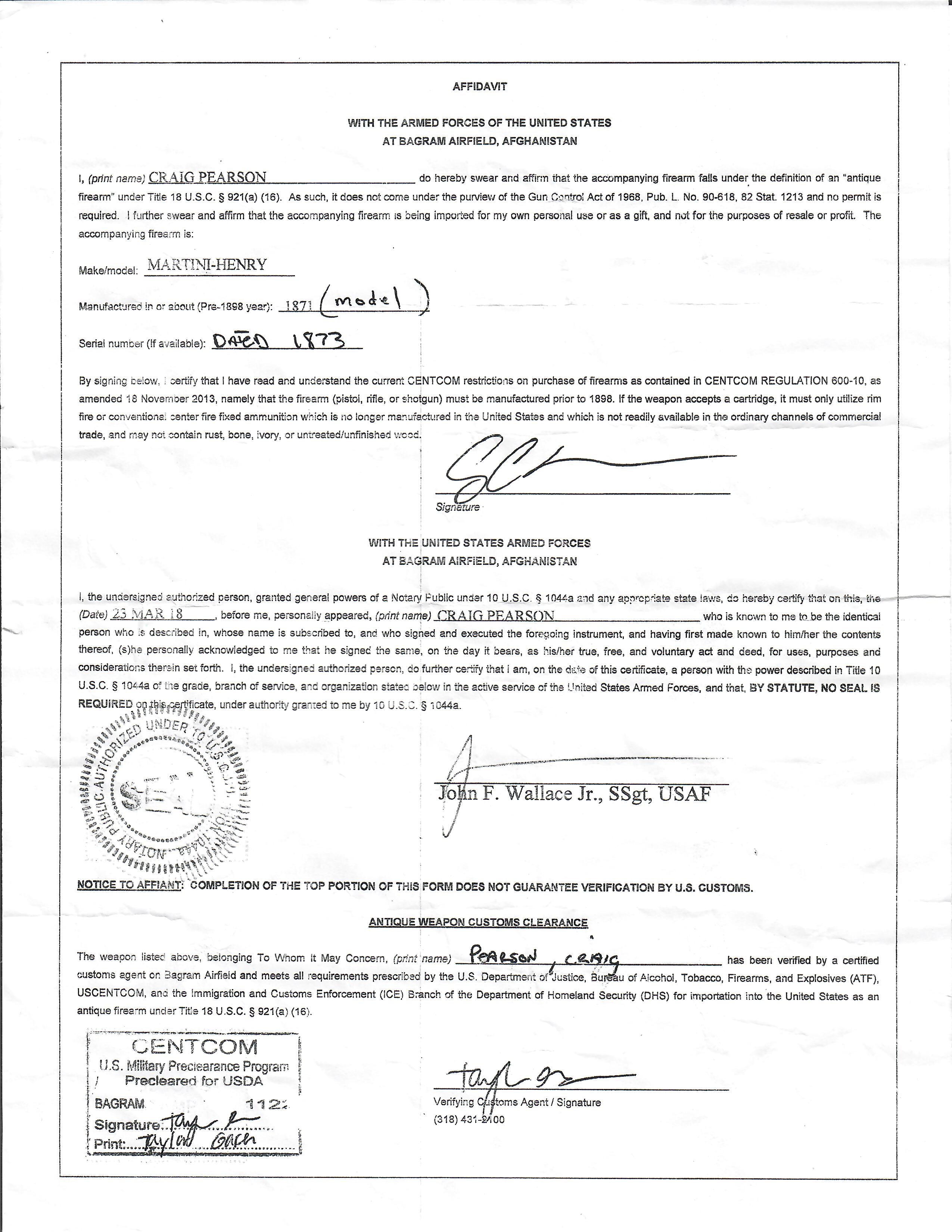 This rifle was brought back from Afghanistan by Craig C. Pearson of South Lyon, Michigan. It comes with a copy of the original bring-back forms, listing the rifle as a MARTINI-HENRY, and 1871 (model). Under "serial number" it is listed as DATED 1873, however we know that is just what is marked on it. The affidavit was notarized 23 MAR 18.