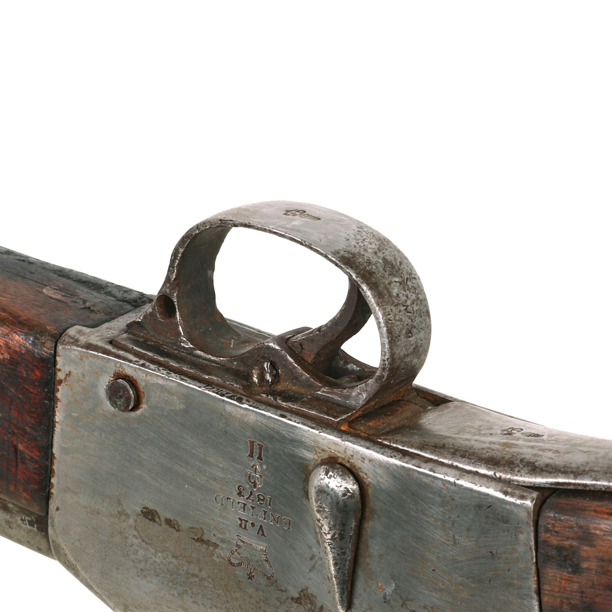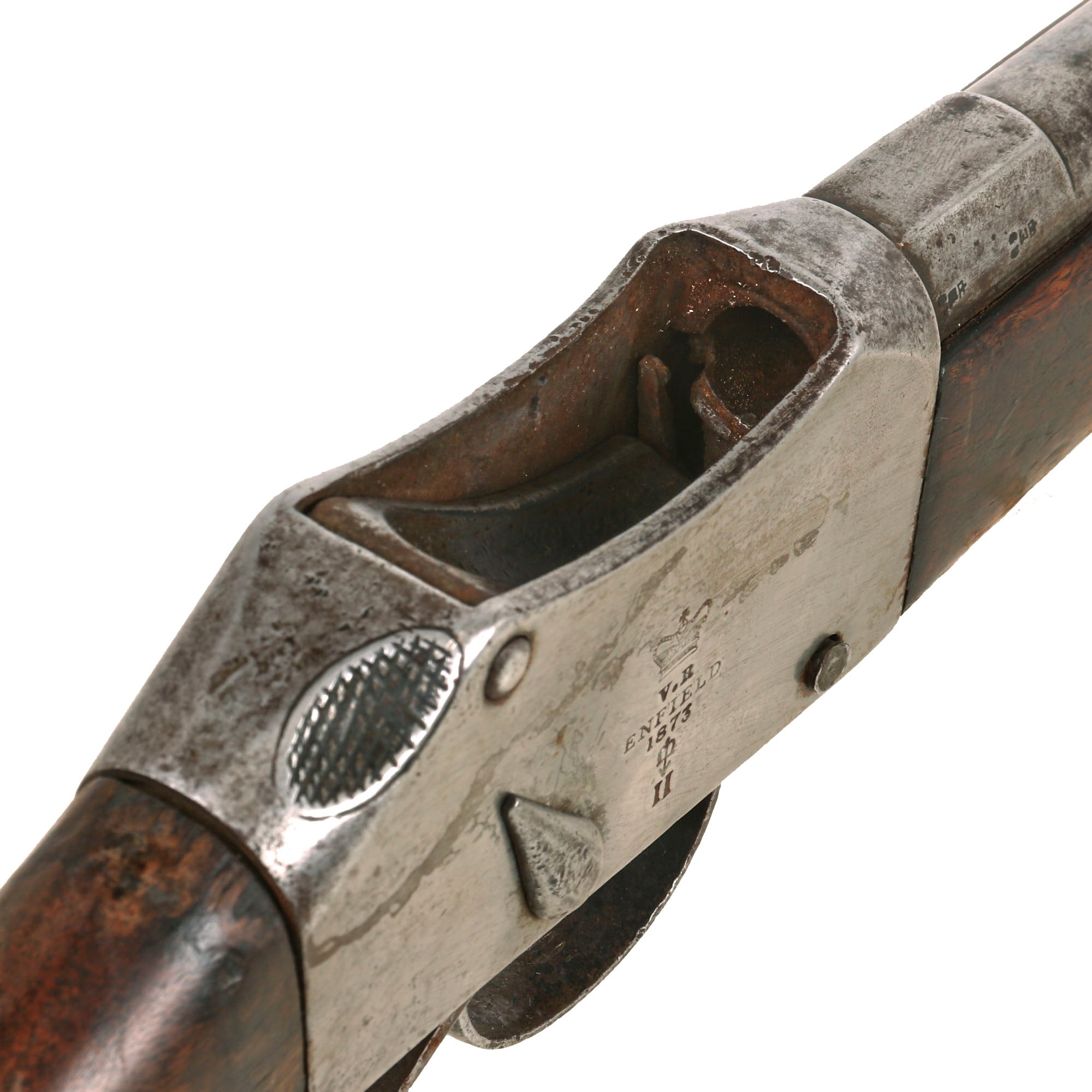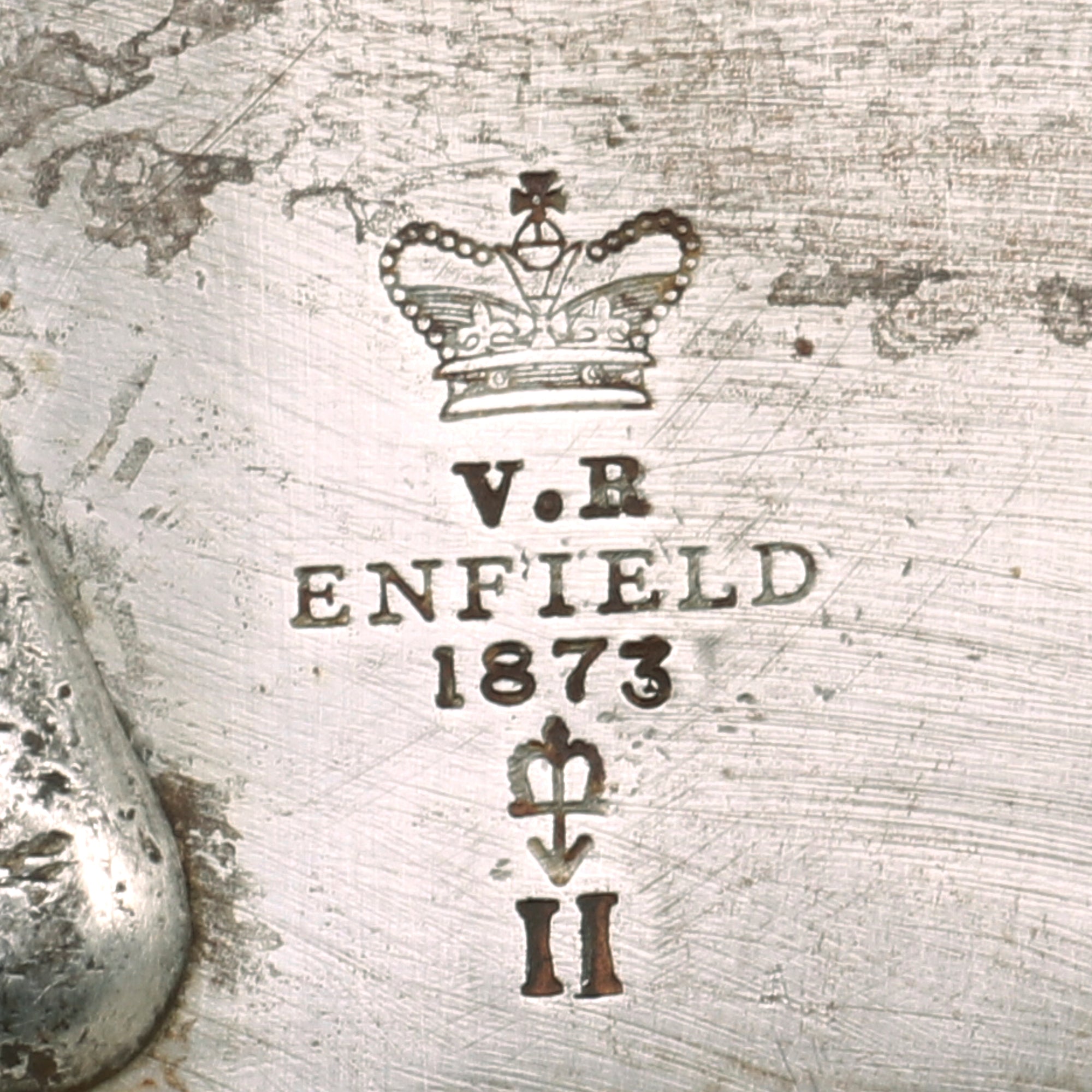 Inspection shows that the markings are definitely too low on the receiver, and the quality of the markings is definitely not correct, particularly the "CROWNED BROAD ARROW" lock viewer's mark. The Roman numeral "II" is also centered under the arrow, which is not correct for a Martini-Henry made in 1873. At the time they were producing mark I Martini-Henry rifles, almost almost of which were later upgraded to the Mark II, resulting in a "mark of arm" that is off center. They are also VERY crisp considering the condition of the side of the receiver, so it is very possible that they are a more recent addition.
