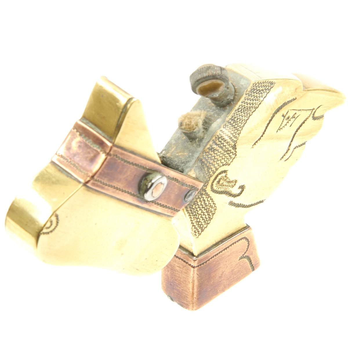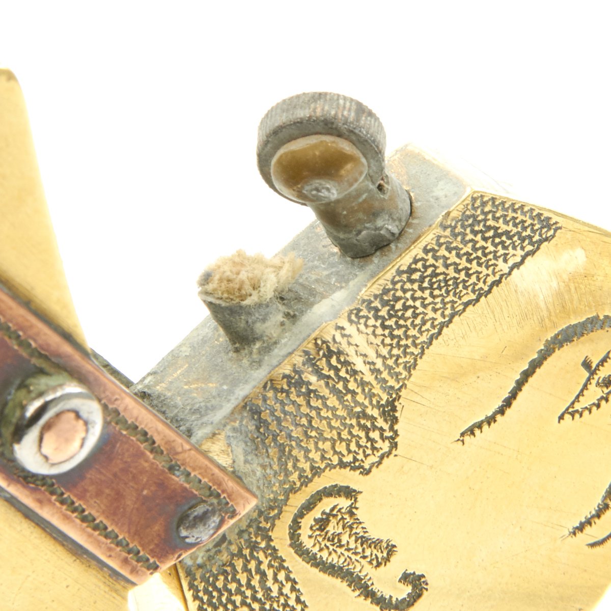 This very fine WW1 cigarette lighter is a profile of the Crown Prince, exaggerating his nose and lack of chin. On tipping his Visor Cap to the rear reveals the works and where the flint, striker and fuel cap are located. The flint is removable, so that it can be adjusted, and it is a bit loose in the lighter currently. On the upper surface of his cap there is engraved the name of an Allied WWI Pilot, most likely an American as it states:-