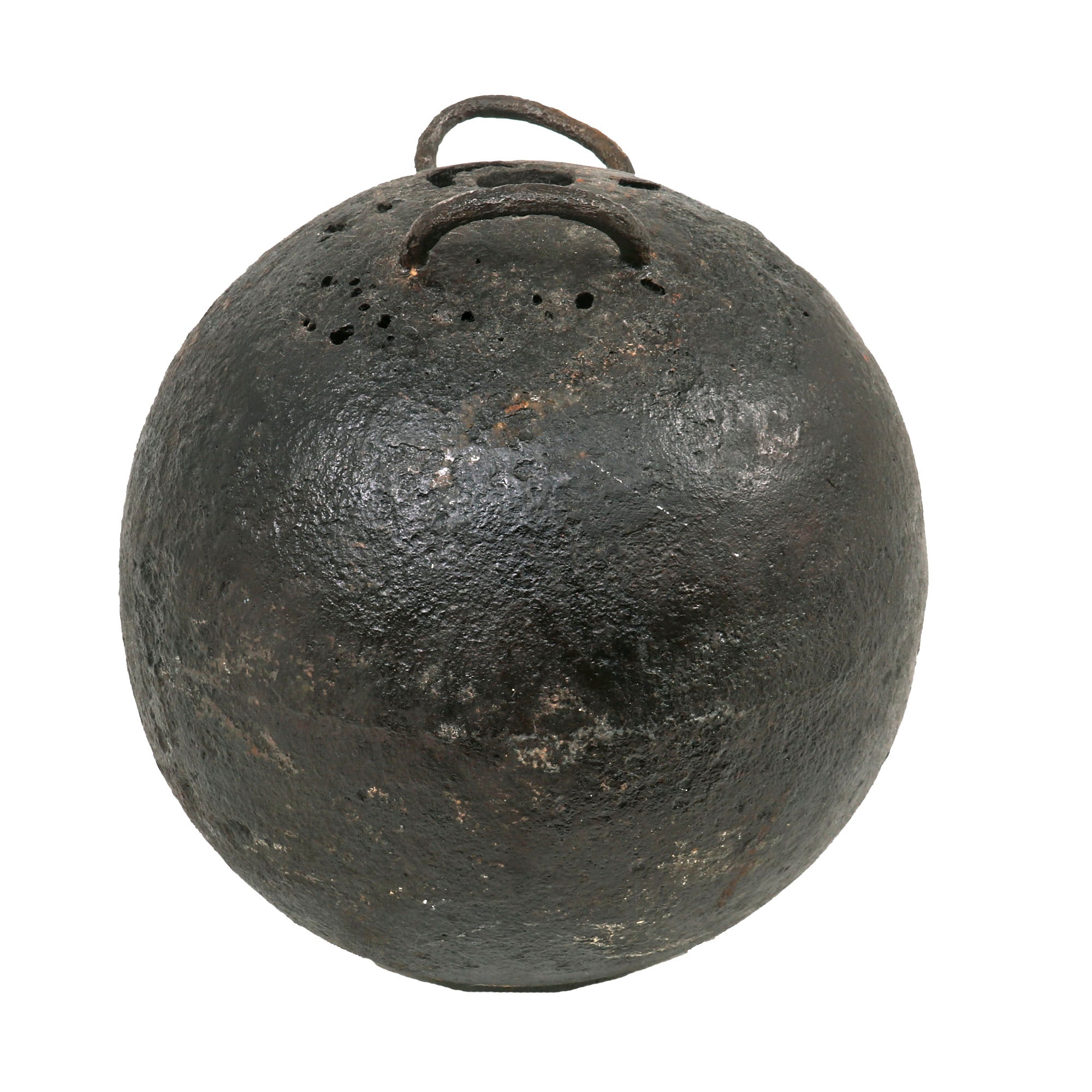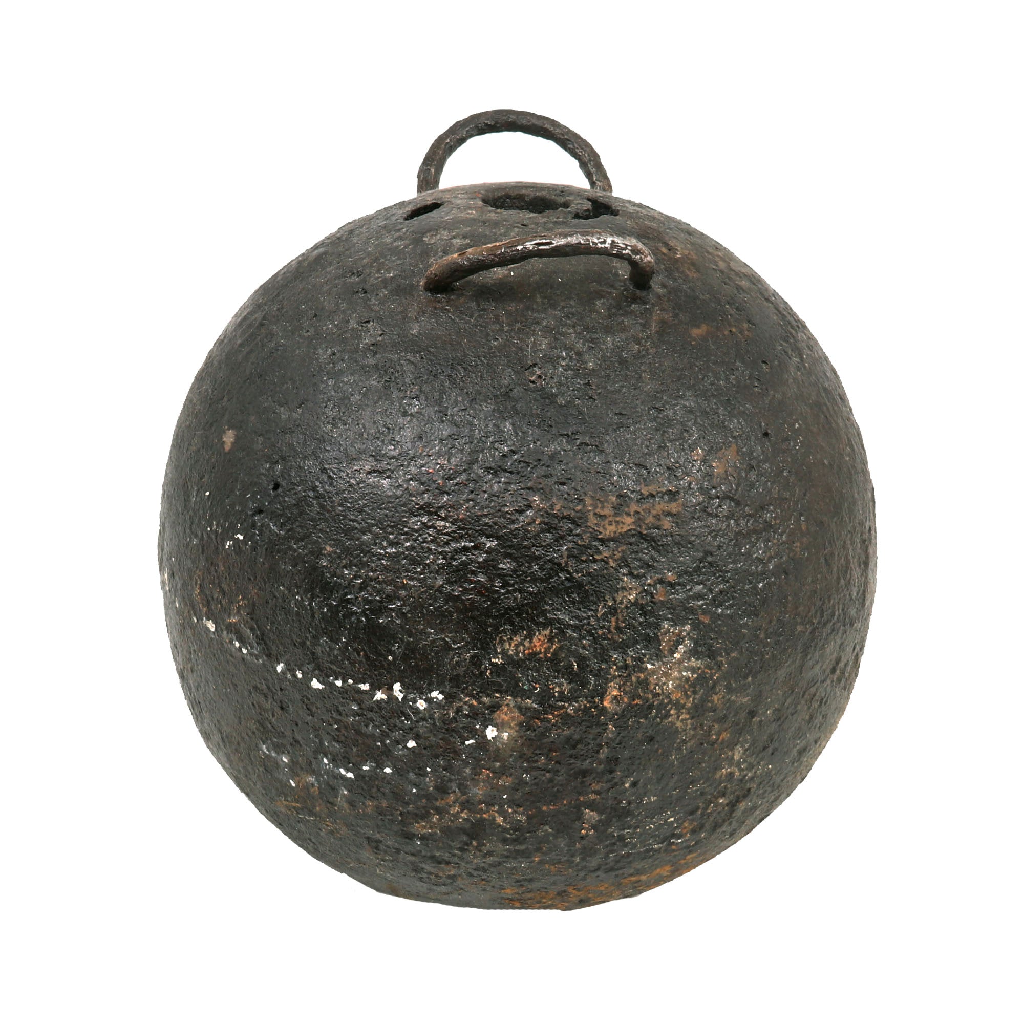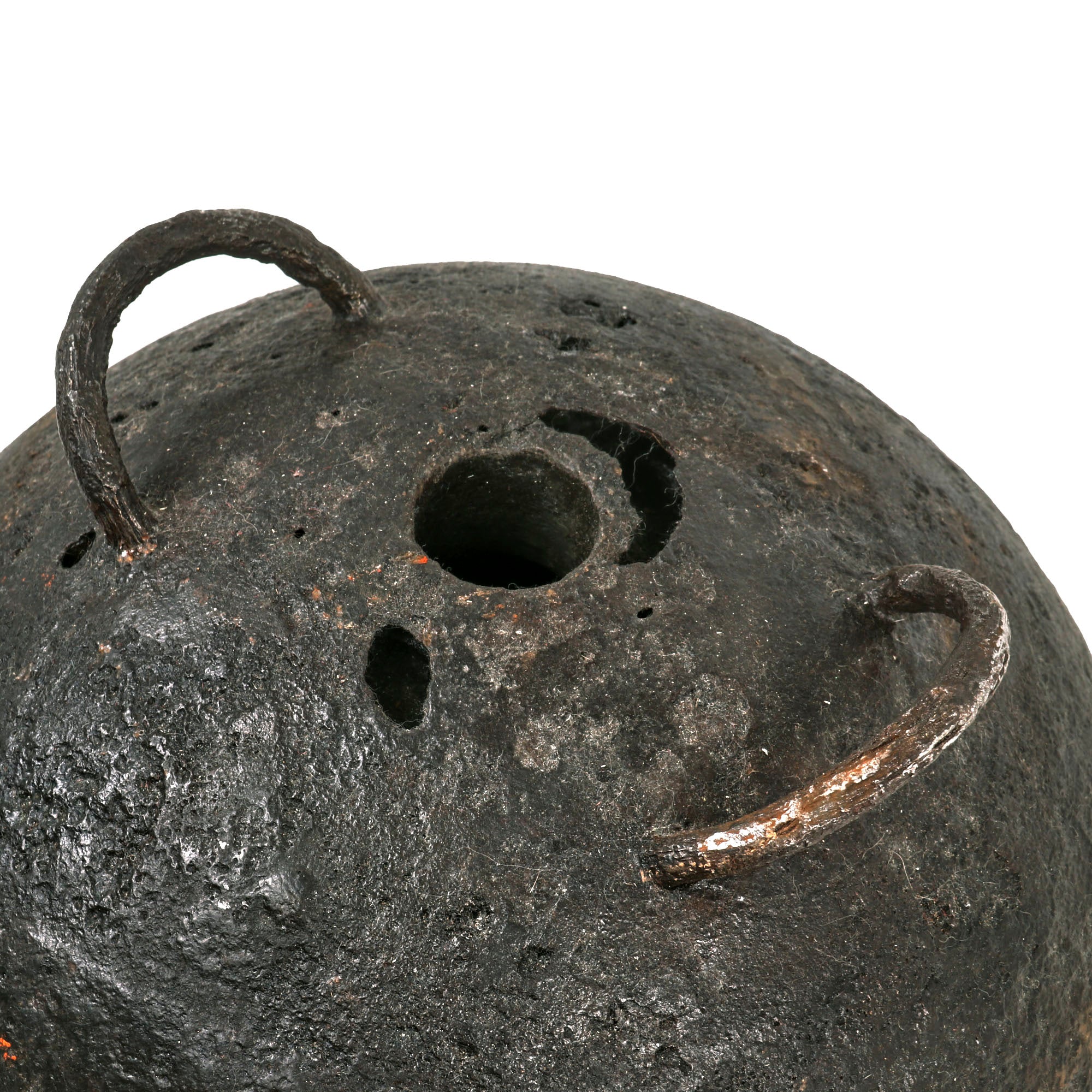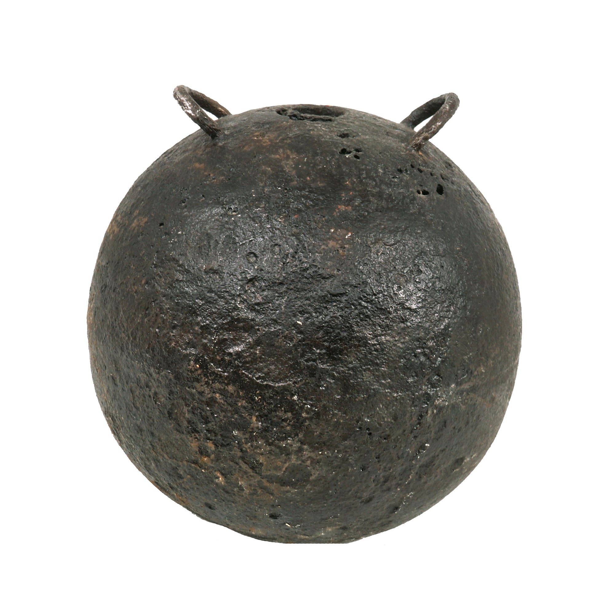 Original Item: Only One Available. Recently acquired from a prominent American collection, the is a fantastic example of a genuine French 18th or early 19th century 12 inch diameter hollow mortar bomb with two lifting rings or lifting "ears" still intact. The mortar is iron and has a faded word ending in LON (likely the arsenal or foundry where it was manufactured). The ball measures approximately 12 inches in diameters with a 39 inch circumference and weight approximately 100 LBS. Overall condition is good with areas of pitting and previous rust which has been eradicated. A very rare hard to find piece that dates from the American Revolution or Napoleonic Wars!