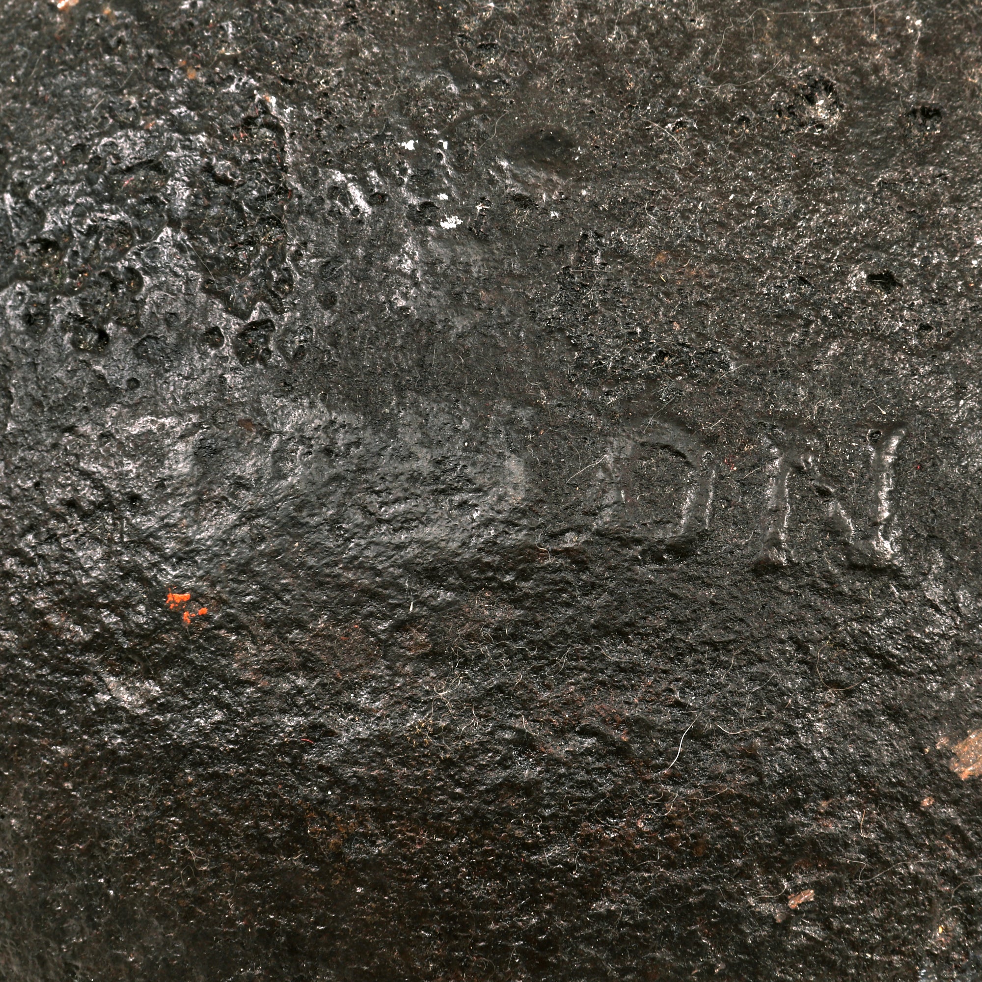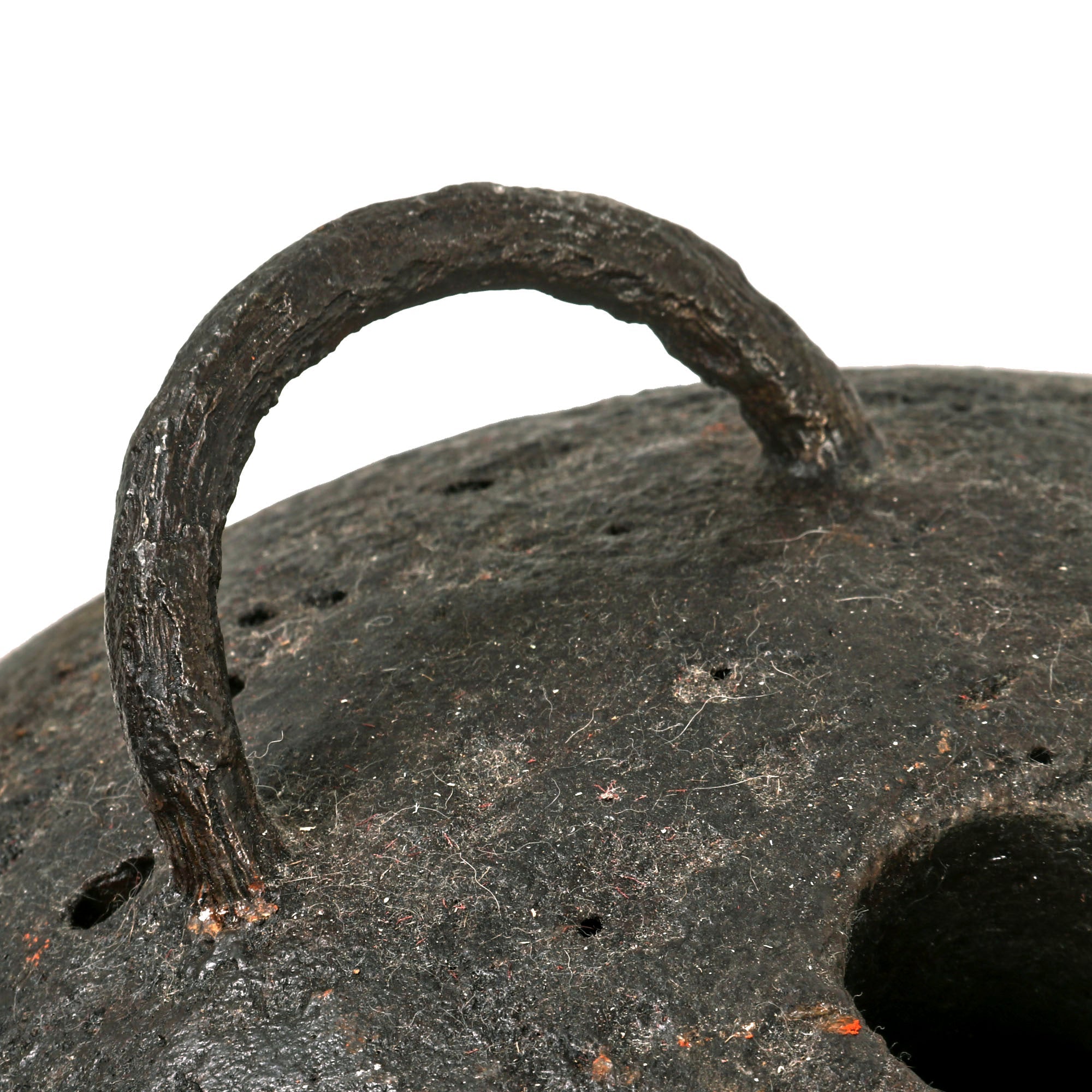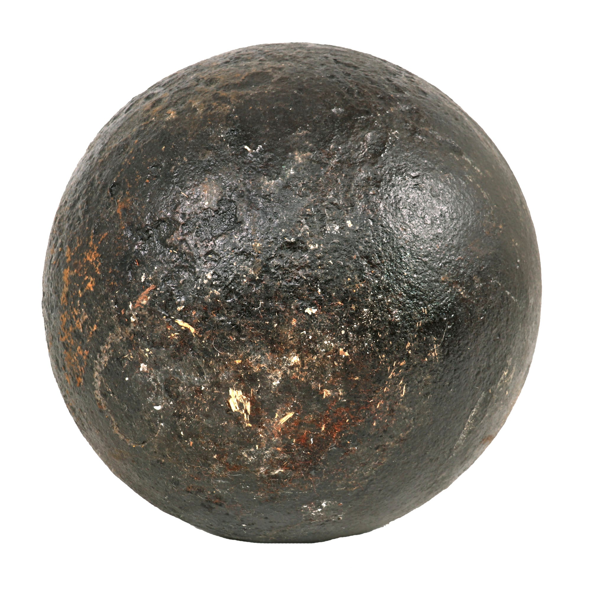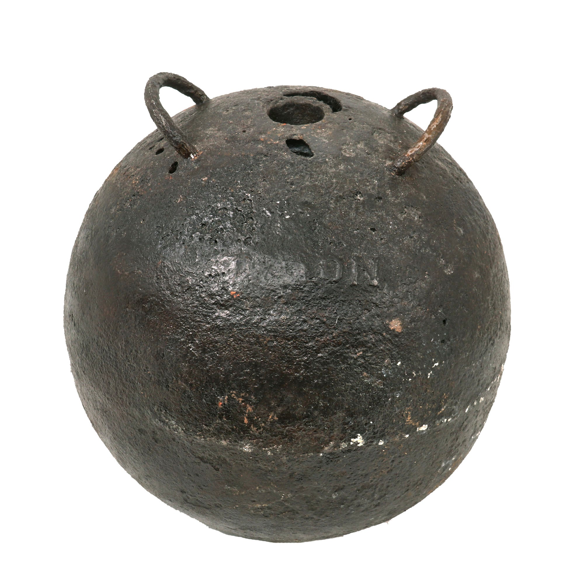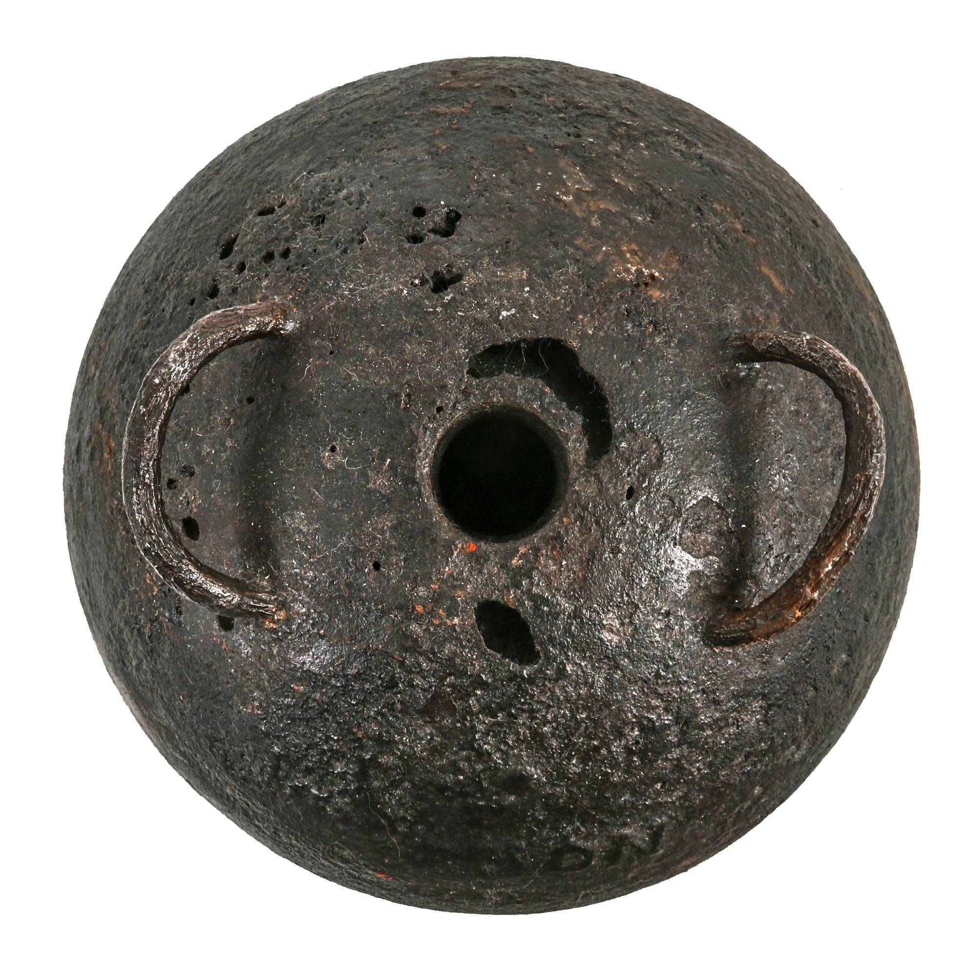 Original Item: Only One Available. Recently acquired from a prominent American collection, the is a fantastic example of a genuine French 18th or early 19th century 12 inch diameter hollow mortar bomb with two lifting rings or lifting "ears" still intact. The mortar is iron and has a faded word ending in LON (likely the arsenal or foundry where it was manufactured). The ball measures approximately 12 inches in diameters with a 39 inch circumference and weight approximately 100 LBS. Overall condition is good with areas of pitting and previous rust which has been eradicated. A very rare hard to find piece that dates from the American Revolution or Napoleonic Wars!