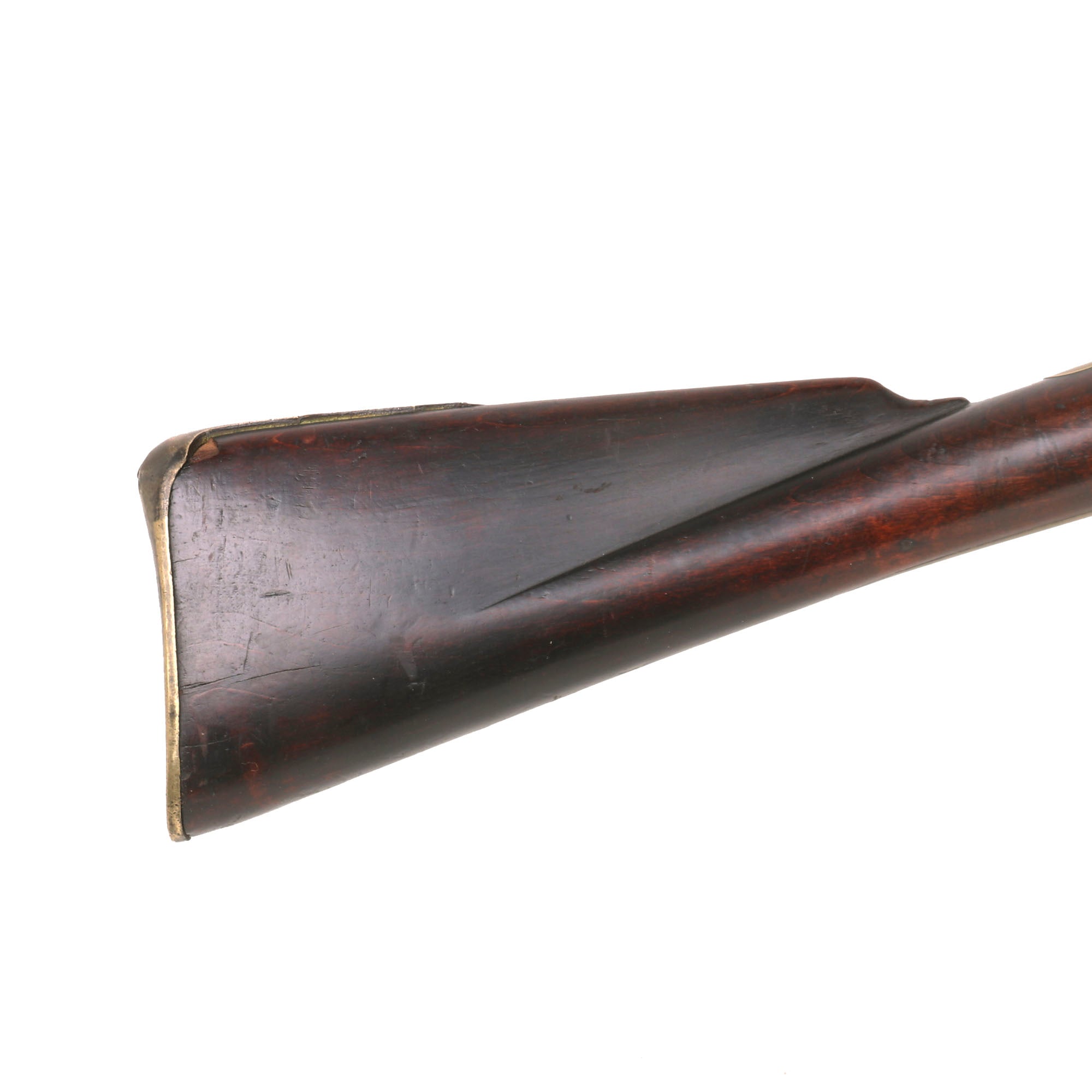Even better, it might have seen service on BOTH SIDES! This musket was definitely restocked in America, with a much slimmer profile stock that looks to be made from figured wood, possibly maple, very commonly used as a stock wood in early America. The stock design still retains the "bannister rail" butt stock, a feature that was basically done away with after 1807. However, there is no screw rising from the trigger guard to the escutcheon on the back of the wrist, and the ramrod pipes are definitely much less substantial than the British used at the time. There are also only three of them, when a musket this length would have usually had four. There is also a PHIL'A marking on the butt plate tang, possibly indicating it was used in Philadelphia after being reconstructed. Definitely some great deep research potential for this long arm!