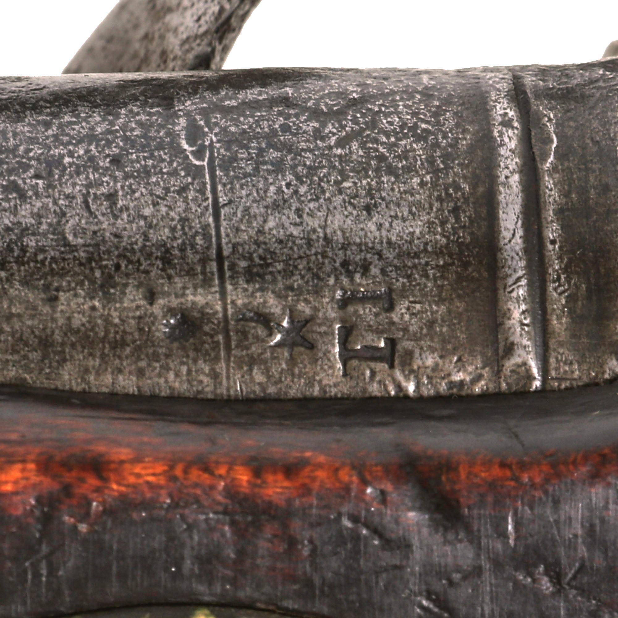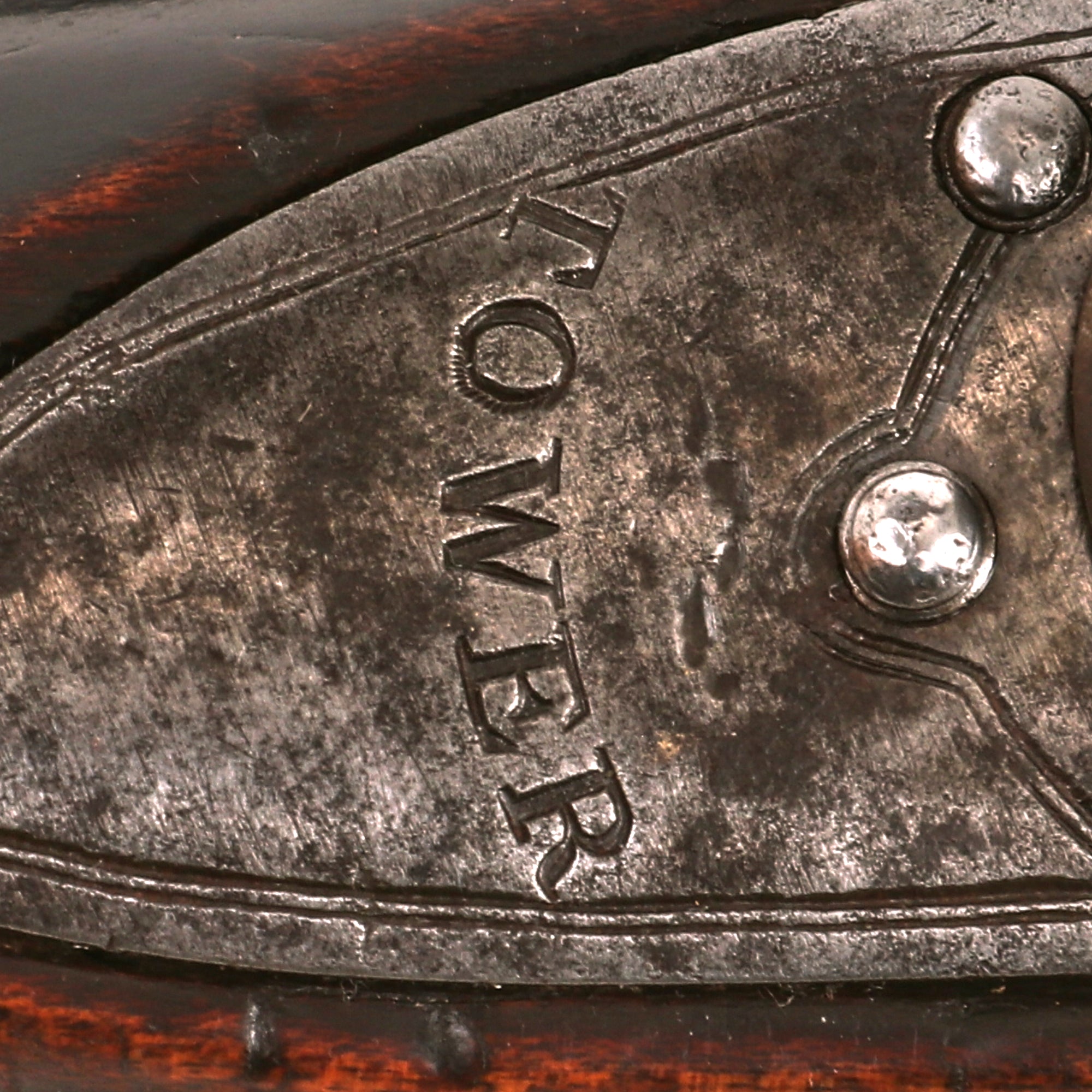 The early style lock plate is fully marked with CROWN / G.R. mid lock for King George III, with TOWER marked on the tail. It also has the CROWN / BROAD ARROW "Lock Viewer's" marking under the flash pan. The lock surface has the correct curved profile of Pre-1777 manufacture, which later turned to be flattened. The lock has a swan neck cock, indicating pre-1808 construction, however it does have a frizzen support bridle from the pan, so the lock itself most likely came from a different musket than the barrel. During the Revolutionary War, muskets made from captured British parts almost always had parts swapped. The lock is functional, however it will fire at both full and half cock.