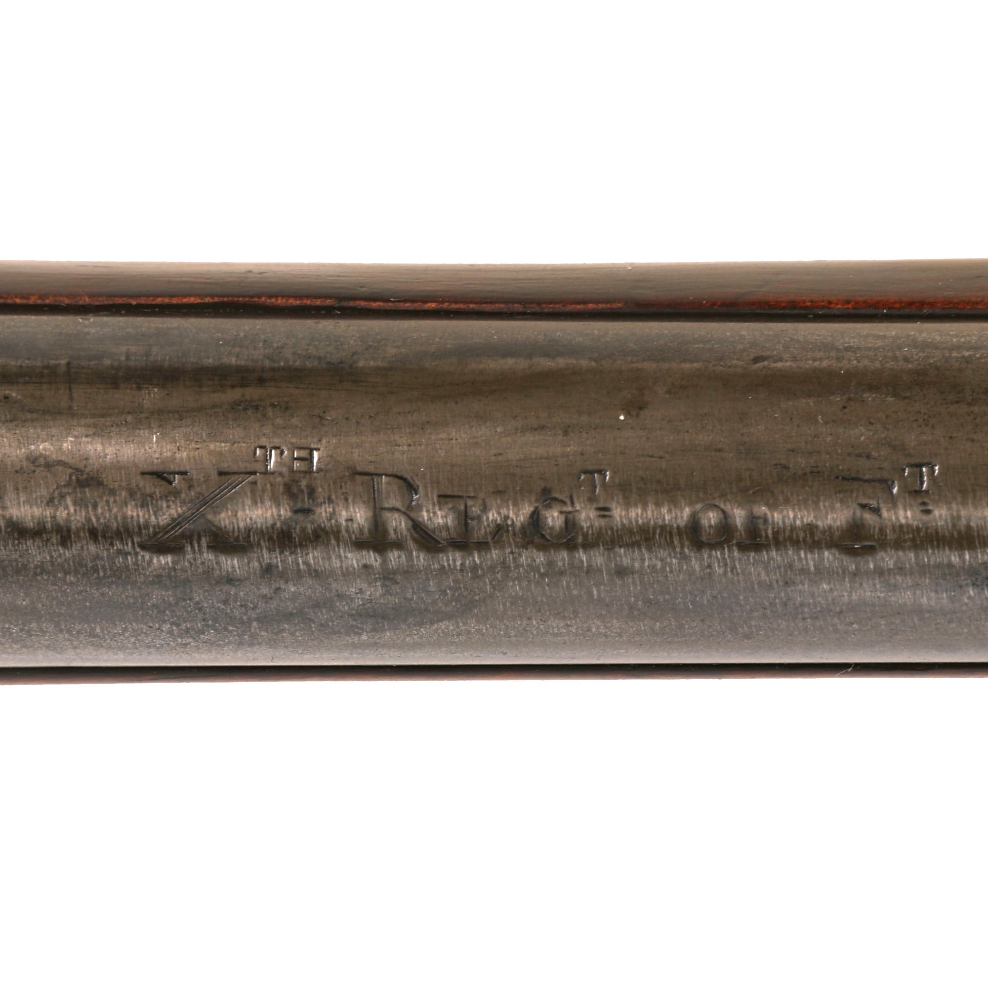 The musket has a full 46" regulation length, .75" smoothbore iron barrel, which bears some very faint proof marks, mostly worn away by powder burn. There is however a clear STAR / TI marking, most likely the initials of the maker of the barrel. The barrel marked on the top with X'TH REG'T of F'T, for issue to the British 10th Regiment of Foot, which saw extensive service in America during the revolutionary war.