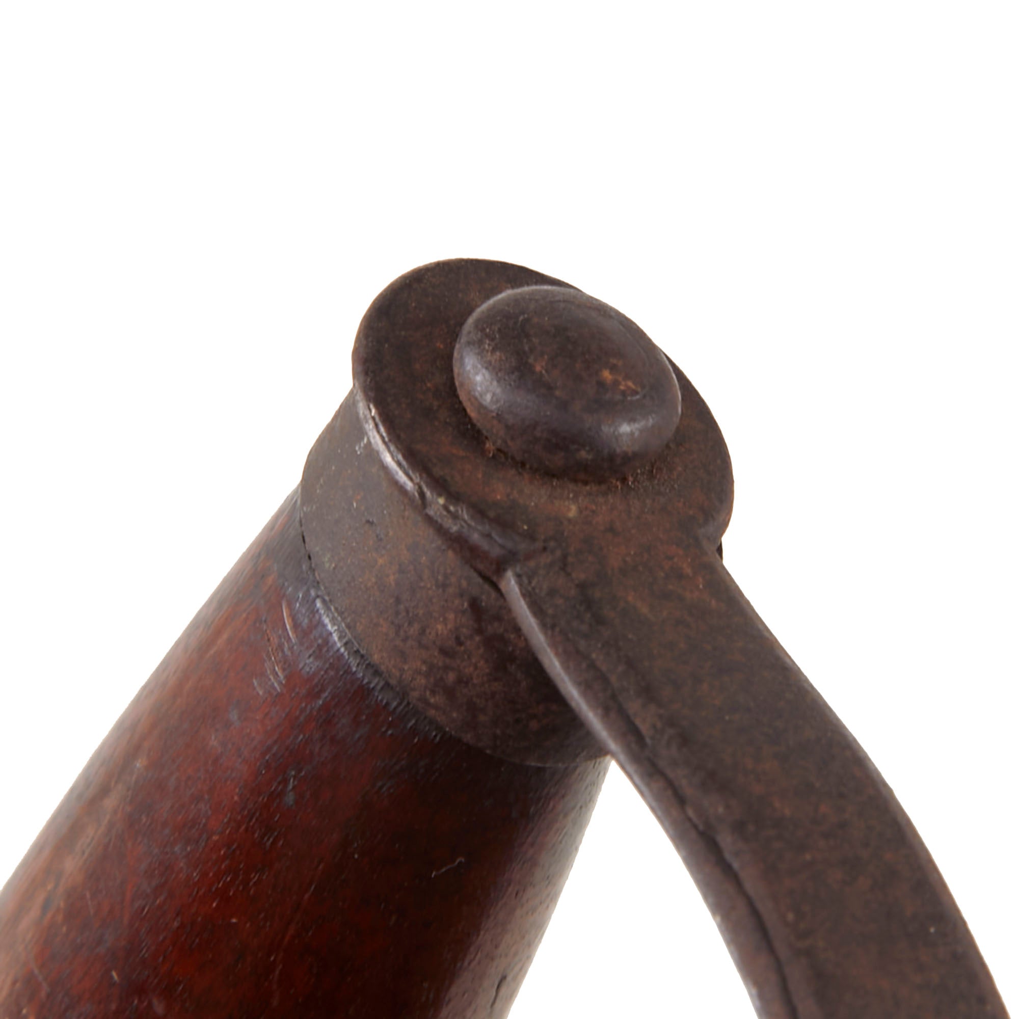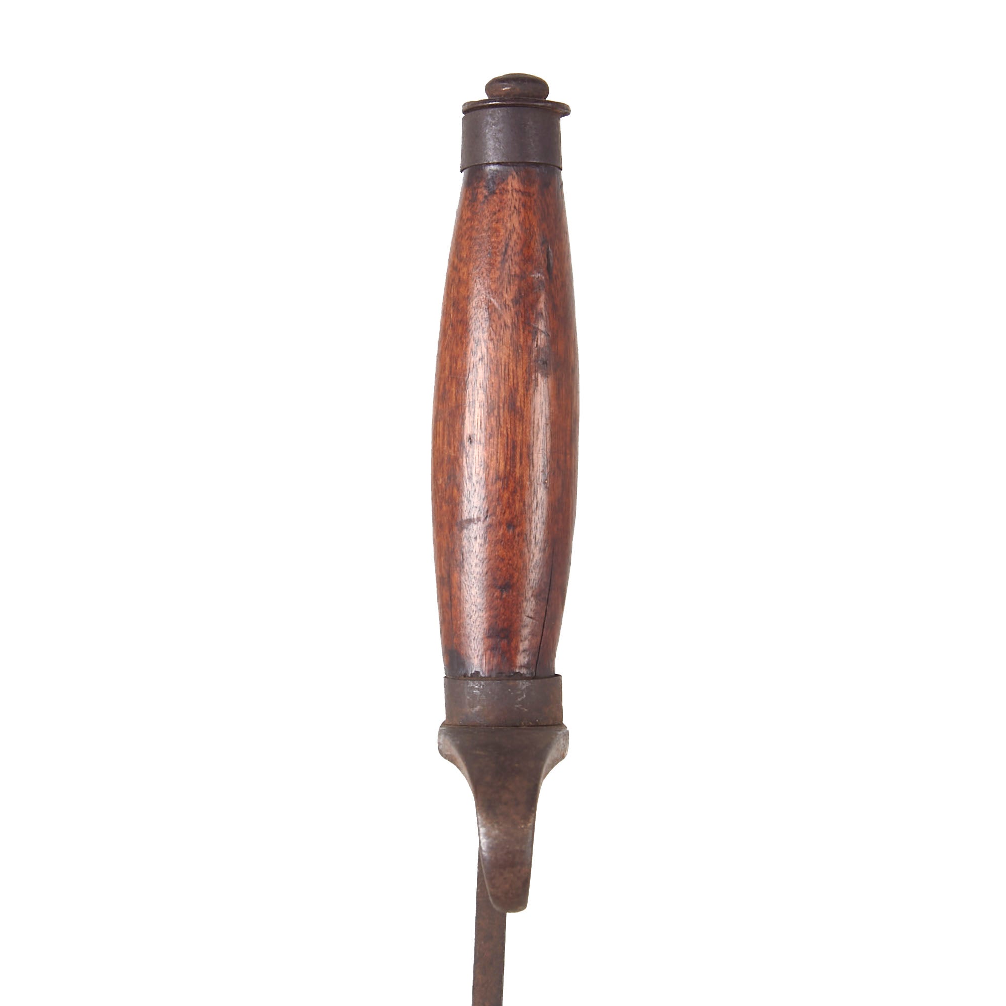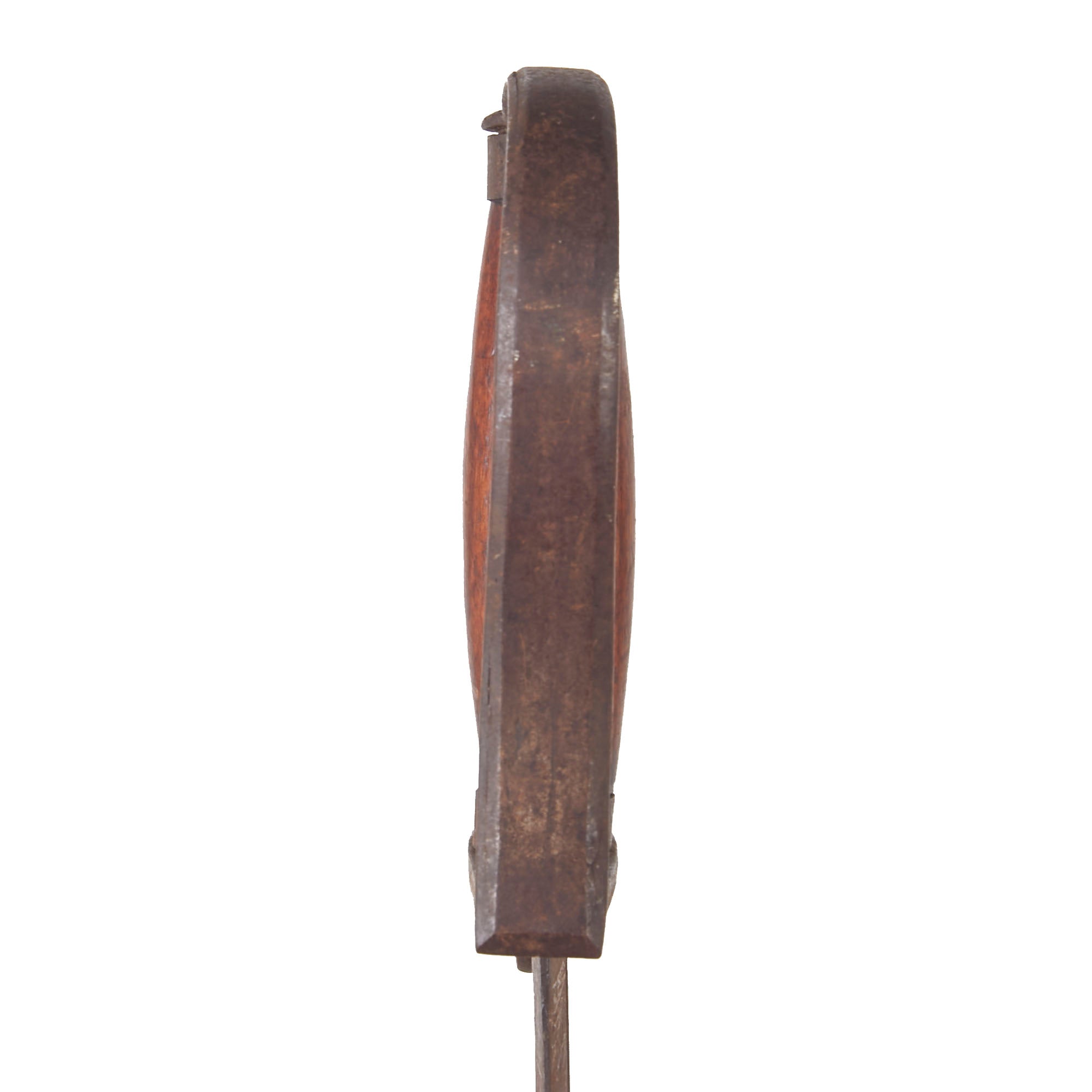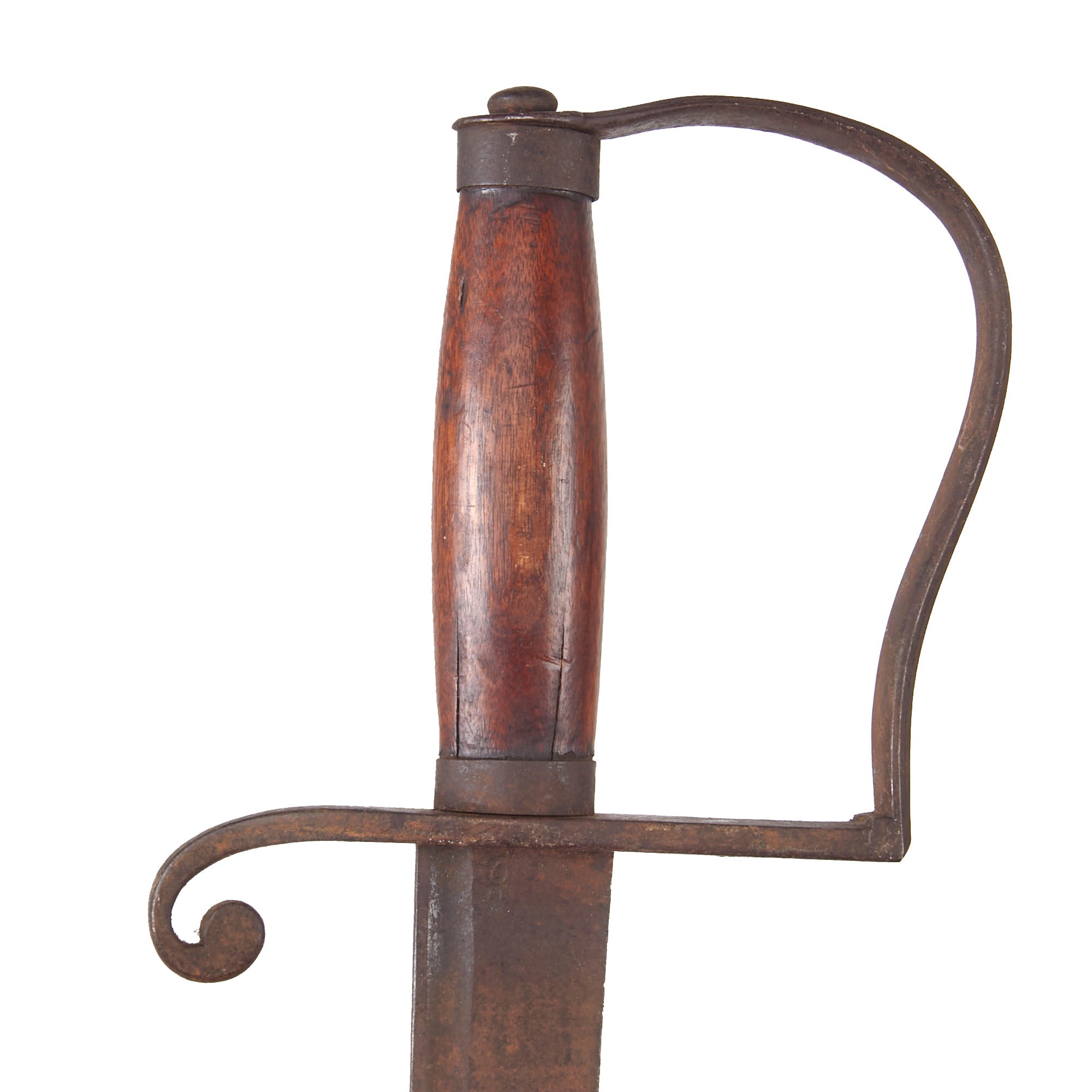 They were easy to create and didn’t have any decorations. They were meant to be used with hacking motions and didn’t serve as a status symbol. This example has a 28½” blade and is 33½” overall. The only marking is a faint Crown / 9 marking, which would suggest that this was a British blade that was remounted by an American blacksmith during the period, which is certainly plausible. The blade shows oxidation spotting across, and the tip has become a bit dull. The grip is the correct solid wood, which does have some small cracking, but has retained its finish very well.