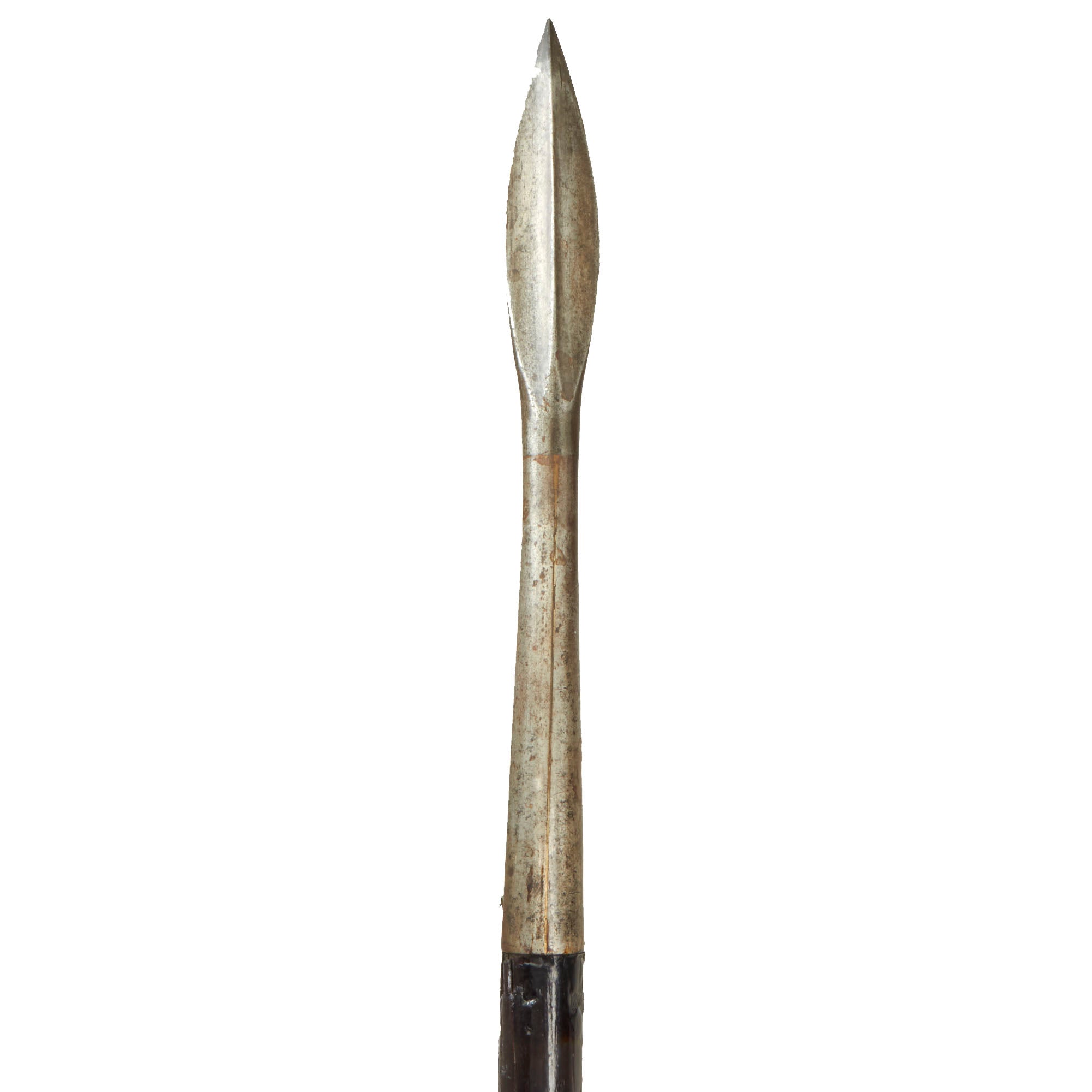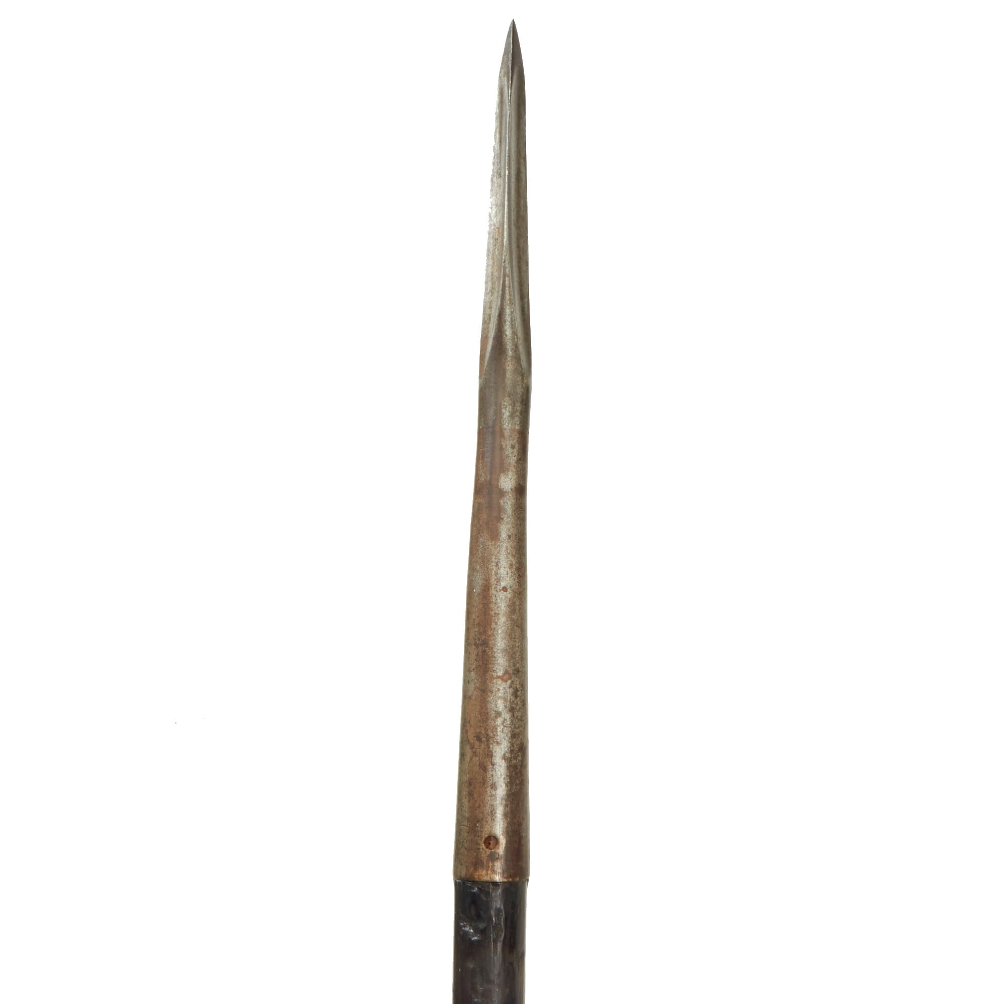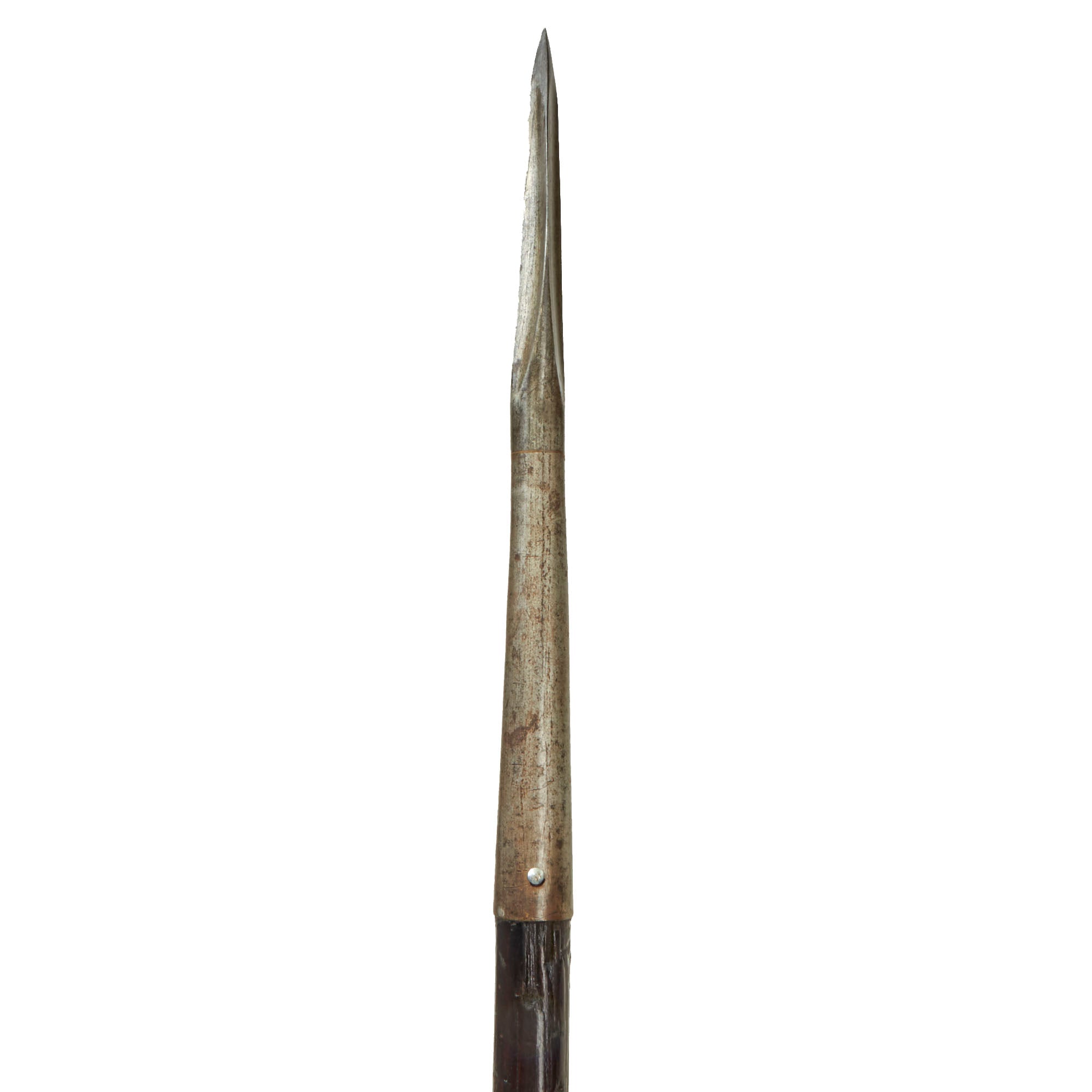 This example has had the original spearhead and base fitting remounted on a two piece shaft, which when assembled measures an impressive 79 ¾" inches long, a few inches under 7 feet. It breaks down into a spearhead section measuring 34 ¾ inches, and a shaft / base fitting measuring 47 inches long. The spearhead itself measures 12 inches long, and is quite substantial in weight, so this was not a display piece. The bottom fitting is also quite heavy, and has a fluted armor piercing tip which is reinforced at the very end.