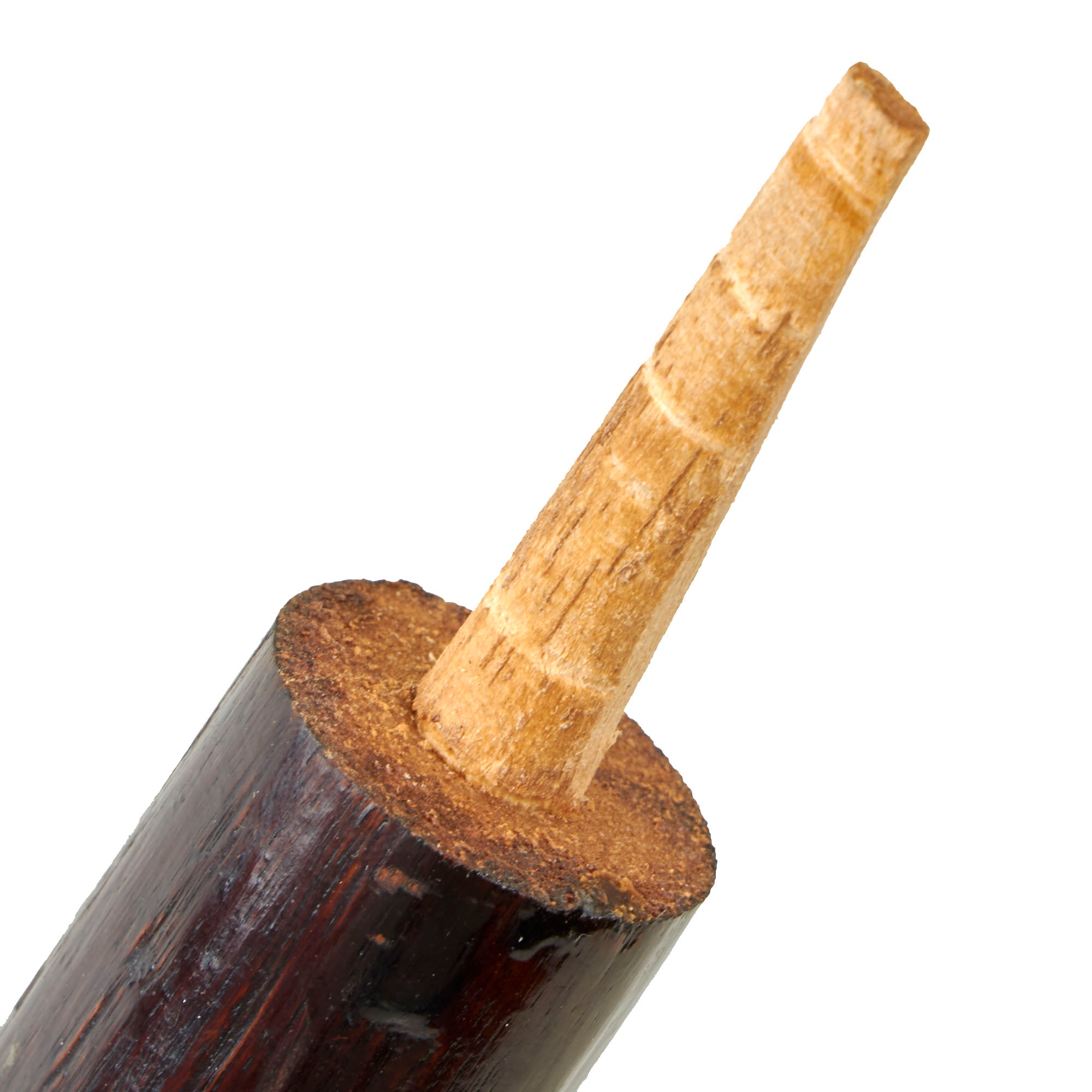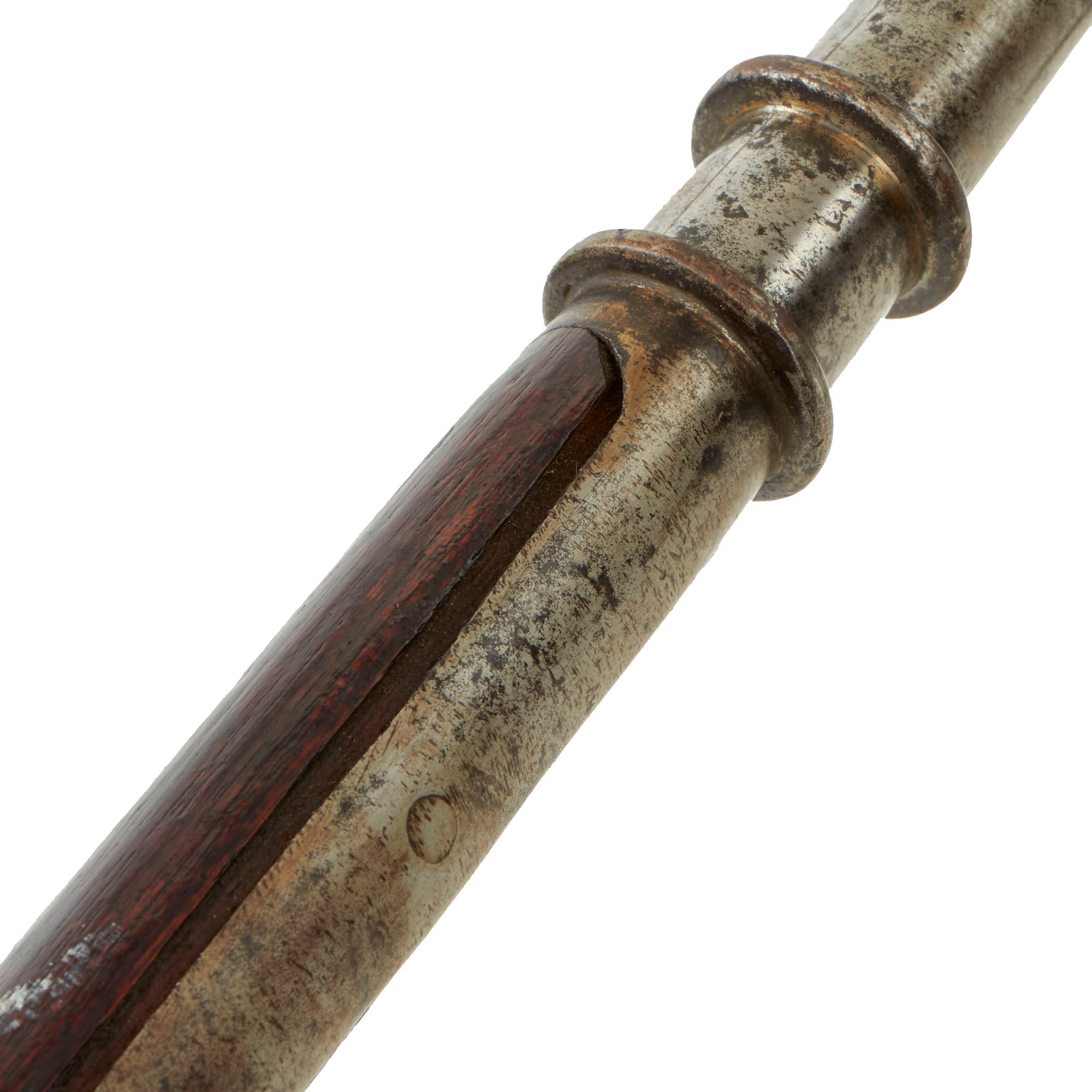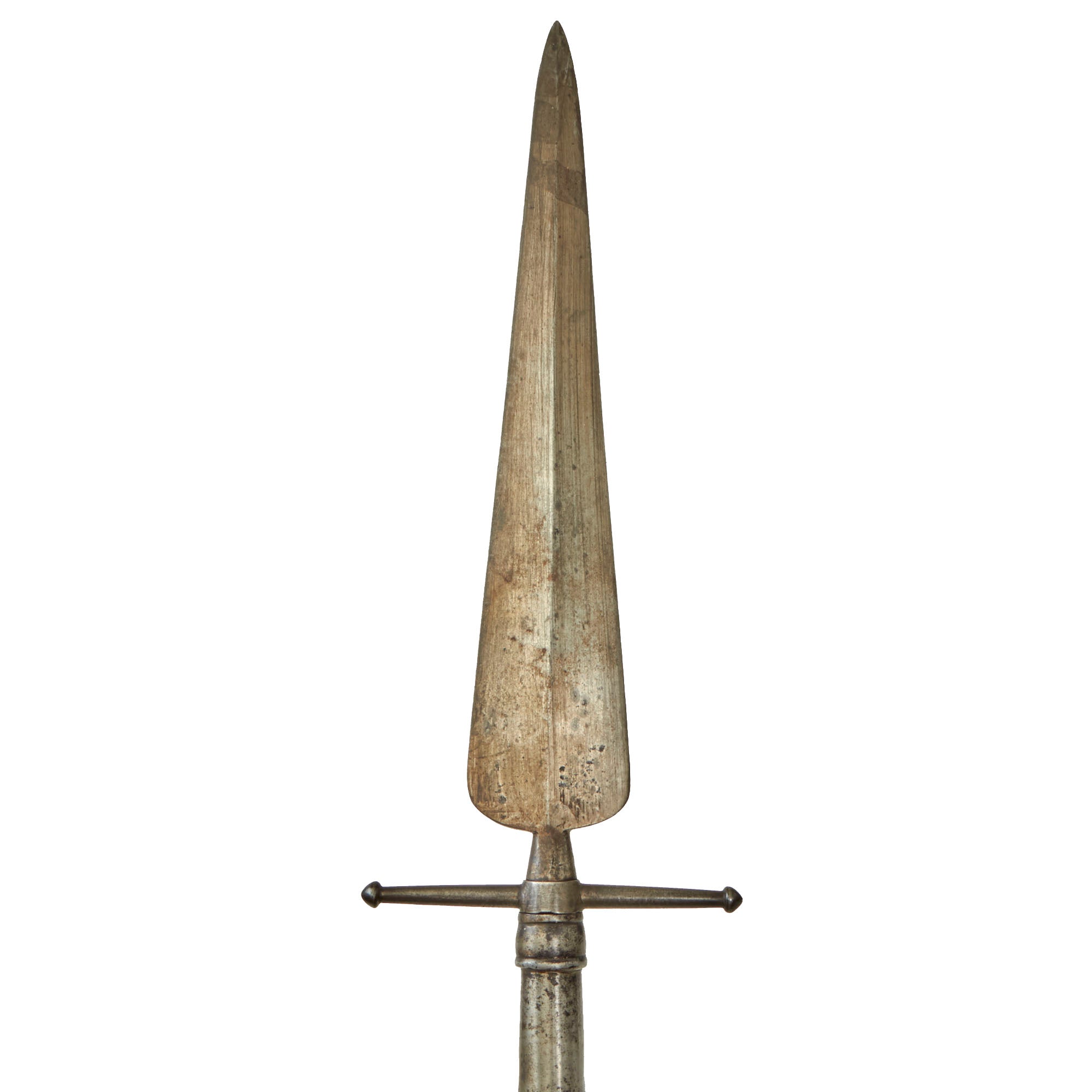 This example has had the original spearhead and base fitting remounted on a two piece shaft, which when assembled measures an impressive 79 ¾" inches long, a few inches under 7 feet. It breaks down into a spearhead section measuring 34 ¾ inches, and a shaft / base fitting measuring 47 inches long. The spearhead itself measures 12 inches long, and is quite substantial in weight, so this was not a display piece. The bottom fitting is also quite heavy, and has a fluted armor piercing tip which is reinforced at the very end.