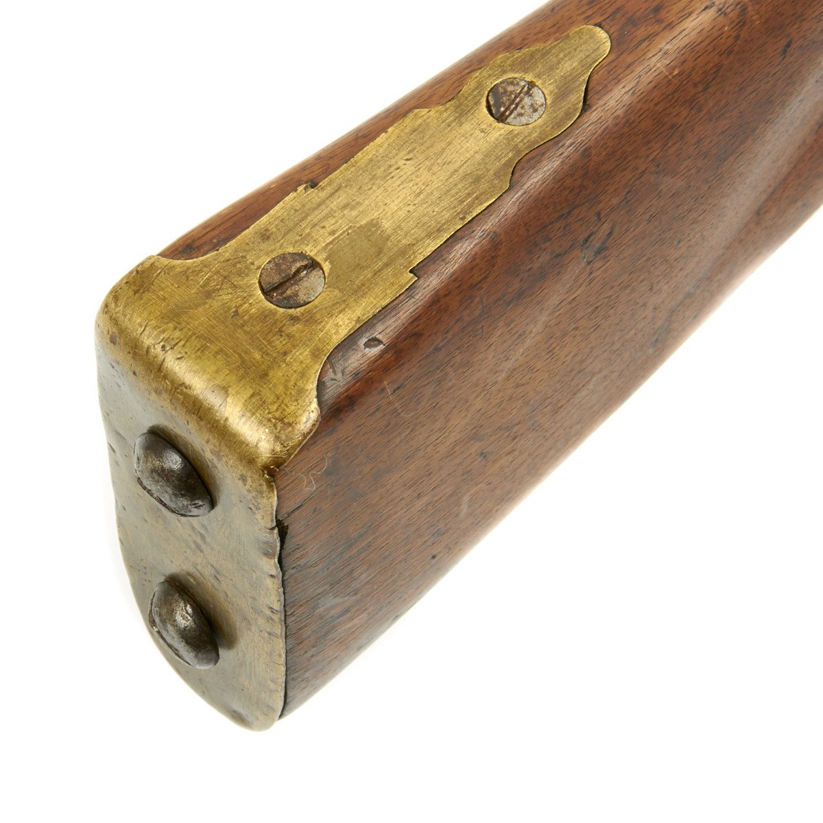 The musket has the typical Dutch style sheet brass buttplate with a thin, semi-decorative tang that is retained by two flat head screws. The gun retains both of its original sling swivels. The brass furniture has a medium mustard patina, having probably been cleaned long ago, and having finally toned to a very attractive hue.
