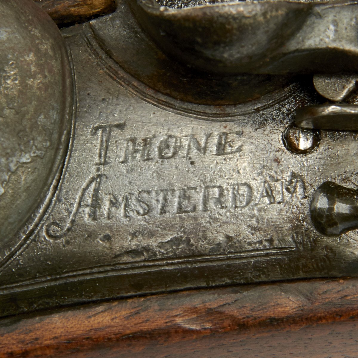 This very nice Dutch made musket offered here is the classic example of a Revolutionary War era musket from the Low Country. However it dates from just after the war. Lambertus Michaelus Thone moved from Amsterdam to Liege and was made a citizen in 1781. He became a gunmaker shortly thereafter but did not start his manufactory, which employed 19 or 20 gunmakers in the fabrication of military muskets, until 1797. The manufactury ceased production in 1812. Courtesy of American Military Shoulder Arms, Volume I: Colonial and Revolutionary War Arms By George D. Moller.