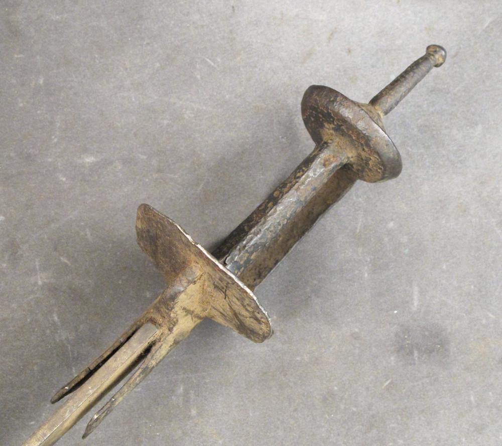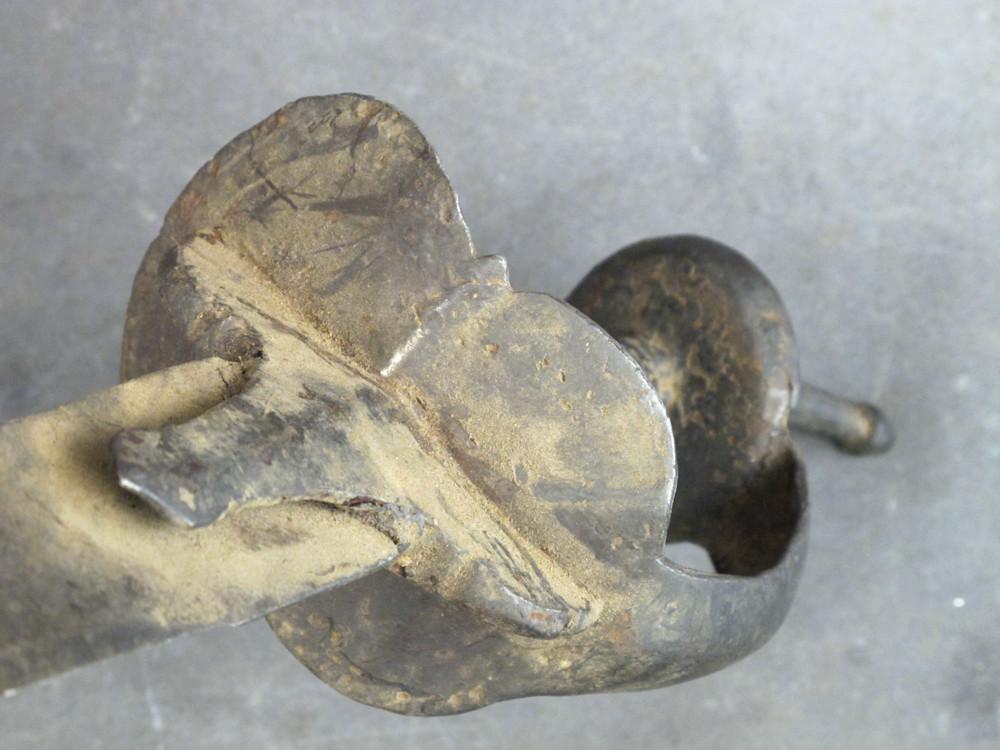 Our example certainly shows it’s age. It has an all steel hilt, the grip covering over the substantial blade tang and guard lining have long since gone. There is the typical Khanda tail extending from the pommel that was used as a second handhold providing added thrust to the blade.