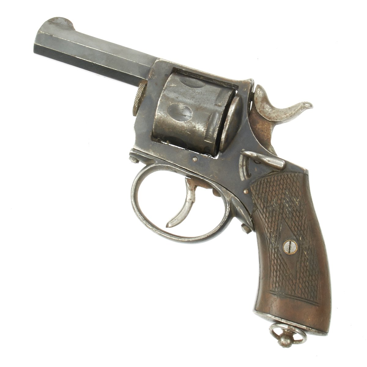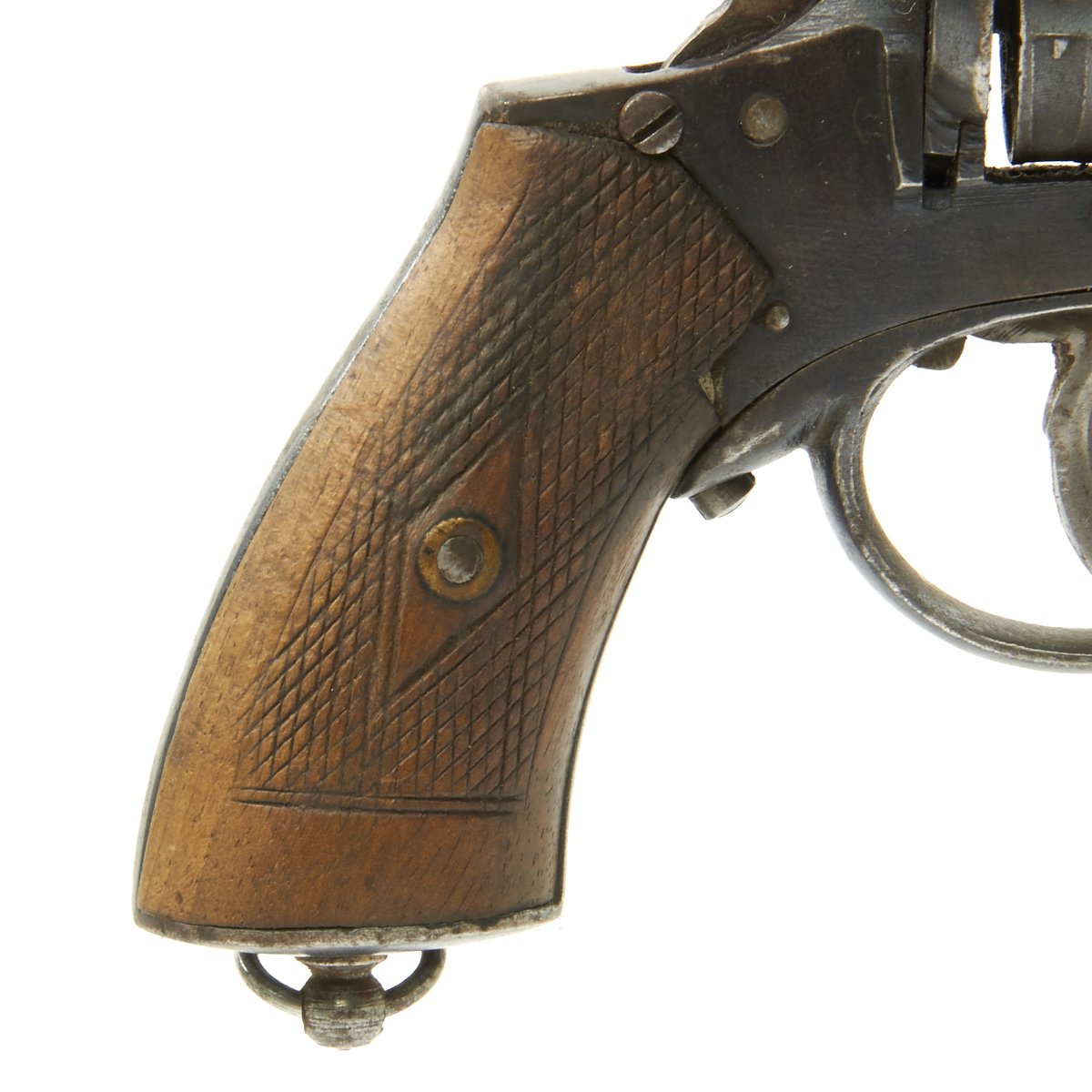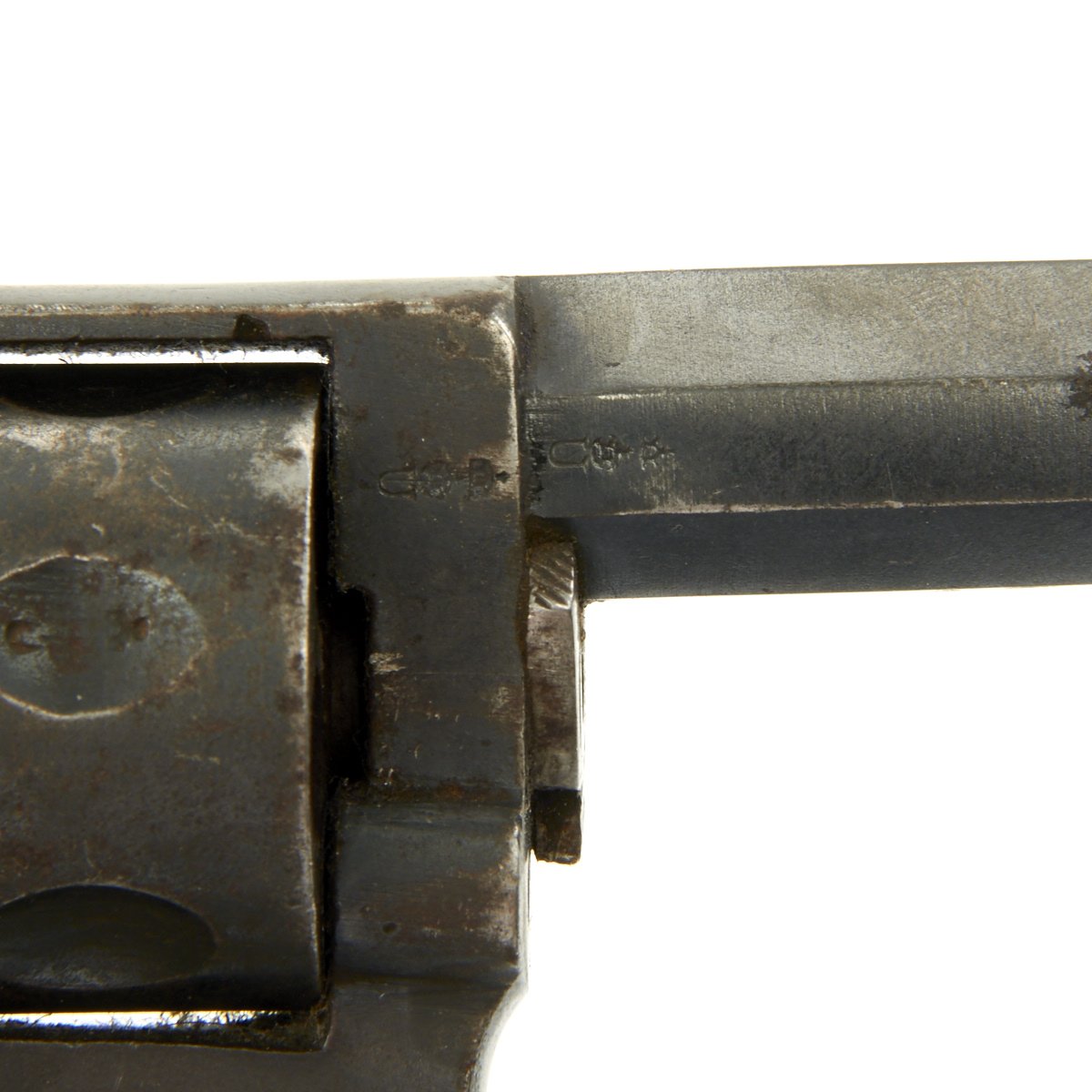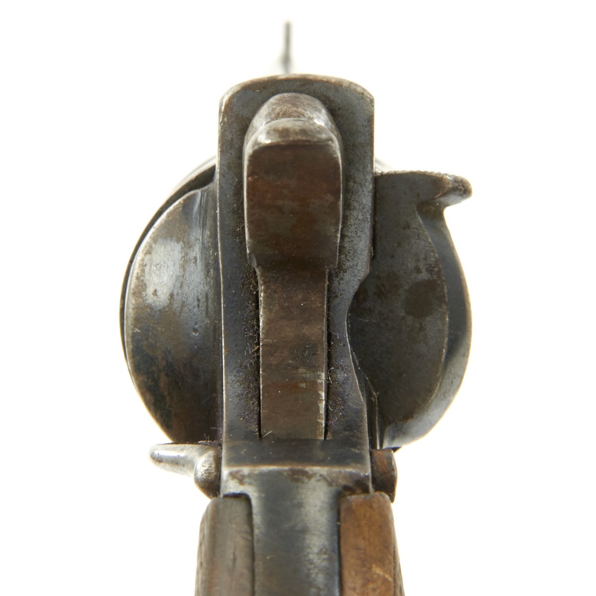 The revolver retains much of its original blue finish, and its wood grips are still nicely checkered. The revolver is unmarked, save for some proof marks on the cylinder and barrel, and some more under the grips. The loading gate functions correctly, and is marked with number 7, while other parts of the revolver are marked 17. The action cycles well in single and double action. The swing-out ejection lever, normally stored inside the cylinder axis pin, is unfortunately missing.