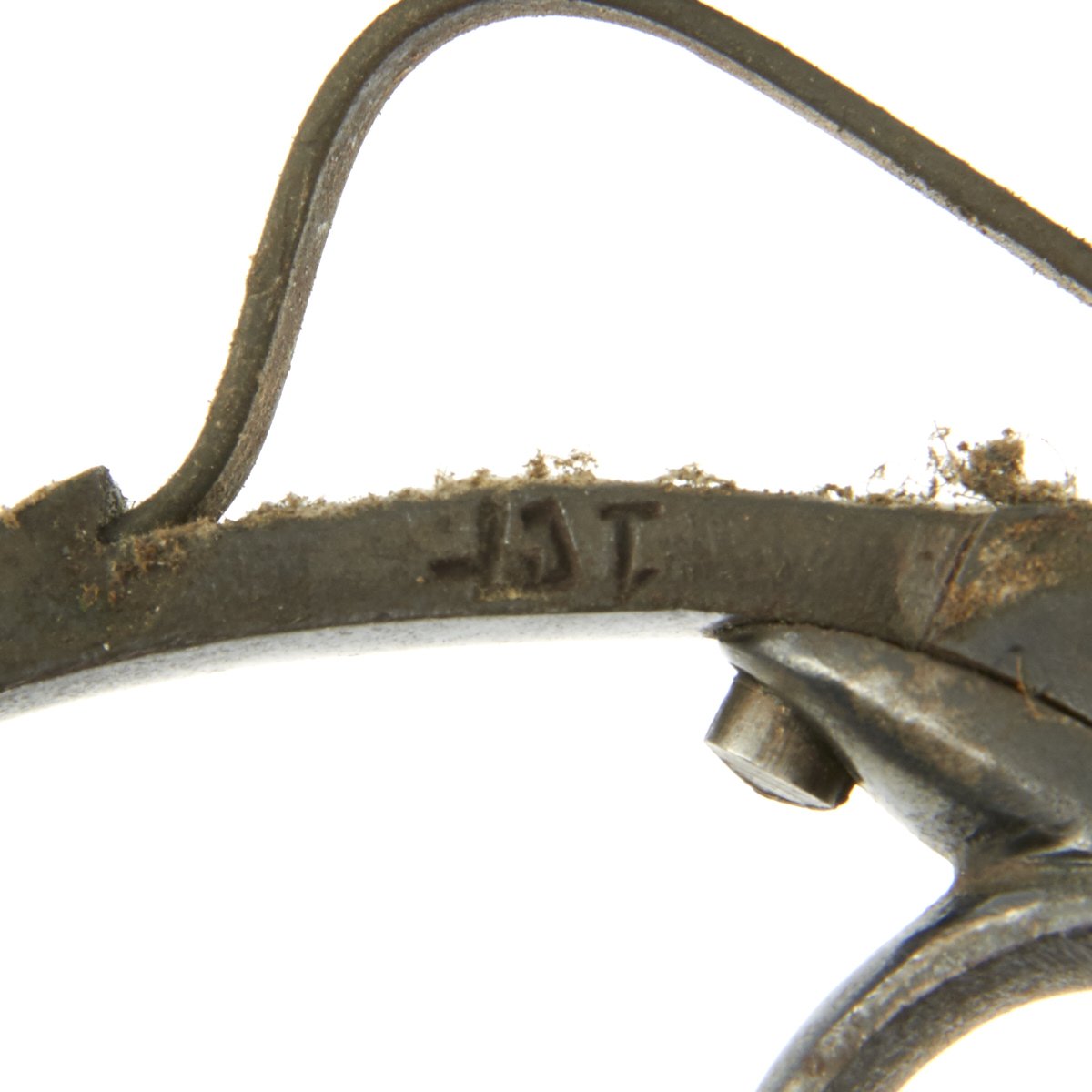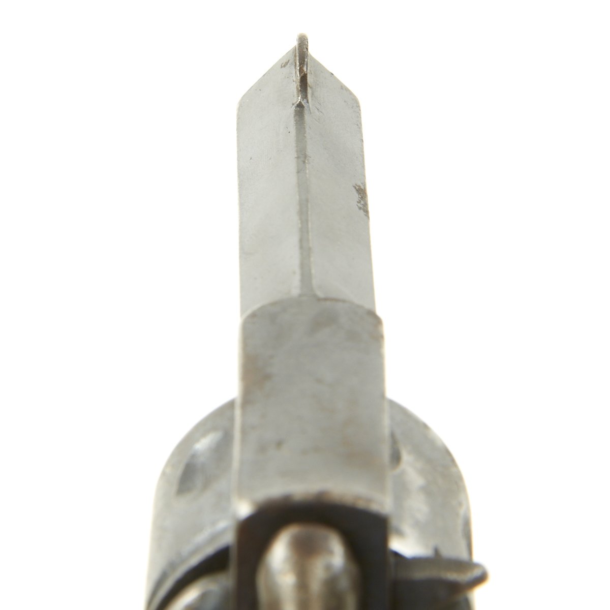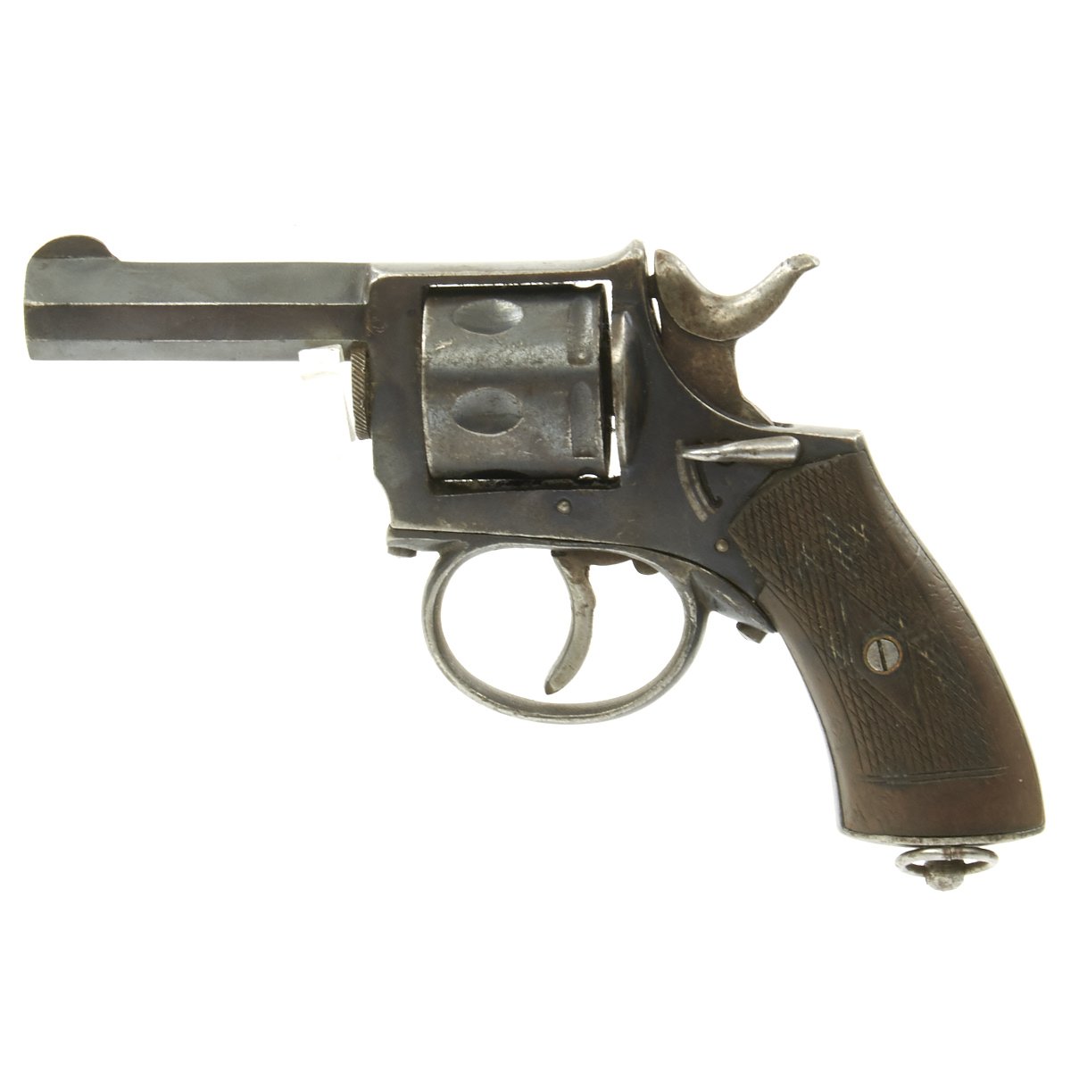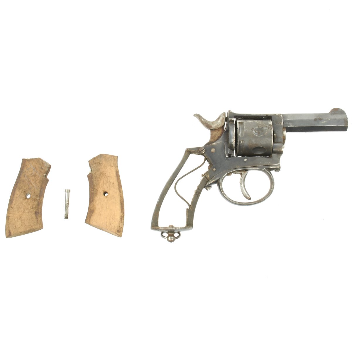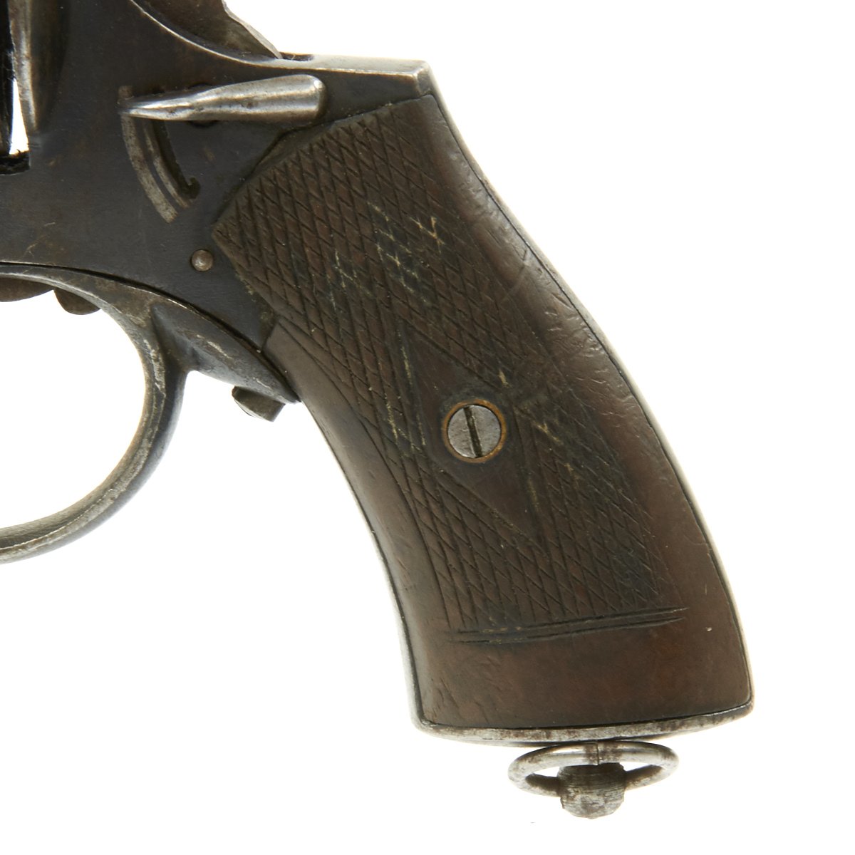 The revolver retains much of its original blue finish, and its wood grips are still nicely checkered. The revolver is unmarked, save for some proof marks on the cylinder and barrel, and some more under the grips. The loading gate functions correctly, and is marked with number 7, while other parts of the revolver are marked 17. The action cycles well in single and double action. The swing-out ejection lever, normally stored inside the cylinder axis pin, is unfortunately missing.
